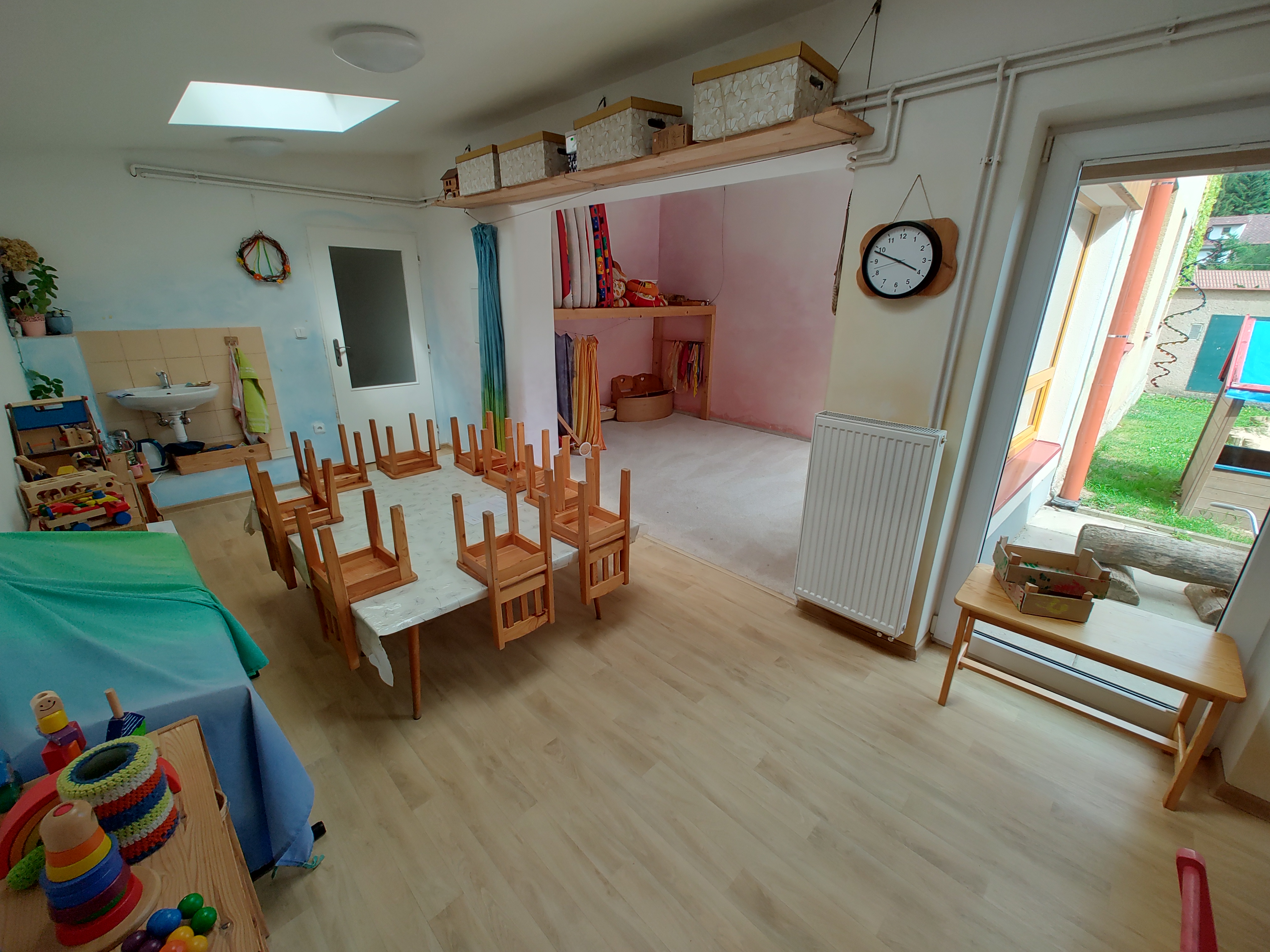 První patro patří škole. Jsou zde k dispozici čtyři třídy a malá kuchyňka s možností uvařit si čaj. V mezipatře jsou toalety a sprcha.