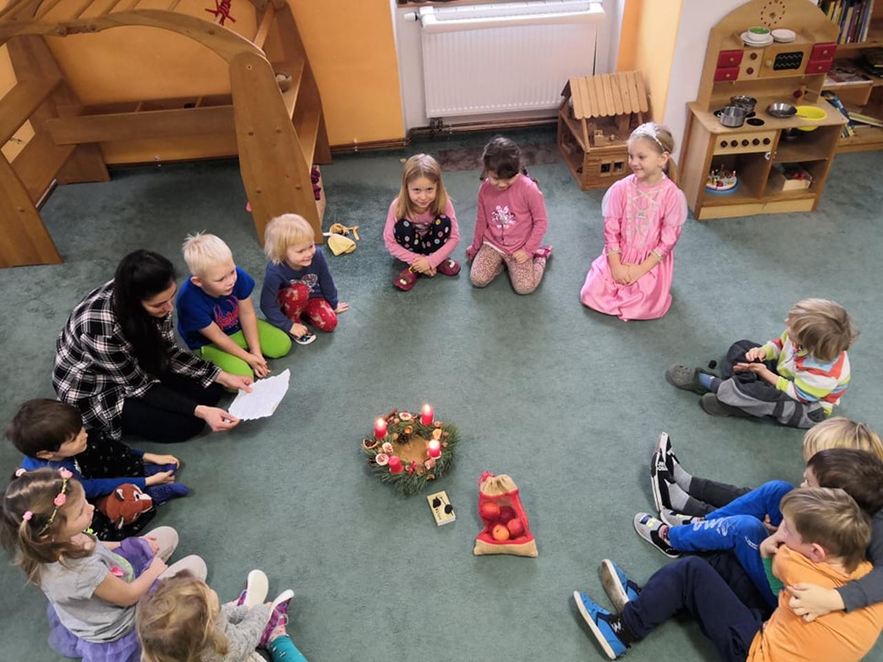 Po týdnu nečekané odmlky jsme se ve velkém vrátili do školky, abychom si mohli společně užít sněhové nadílky, příprav na Vánoce a se spožděním si přečíst dopis od Mikuláše, který tu na nás čekal o pár dní déle společně s uhlíky a jablíčky. Příběh o Krtečkovi a Myšce jak slavili Vánoce posloucháme i s dětma z mini a tak máme šanci se více sblížit. Krteček zdobí pro zvířatka v lese stromek, my si zdobíme větvičky, které nám zbyli po spirále. Abychom si mohli ozdobit i své stromečky doma vyrábíme ozdůbky ze slaného těsta a zdobíme skleněné kouličky třpytkama. Ke svačince zkoušíme novou pomazánku z fazolí a cizrny, která nám překvapivě moc chutná, avšak po vánočce, kterou pleteme ve čtvrtek se oblizujeme až za ušima.