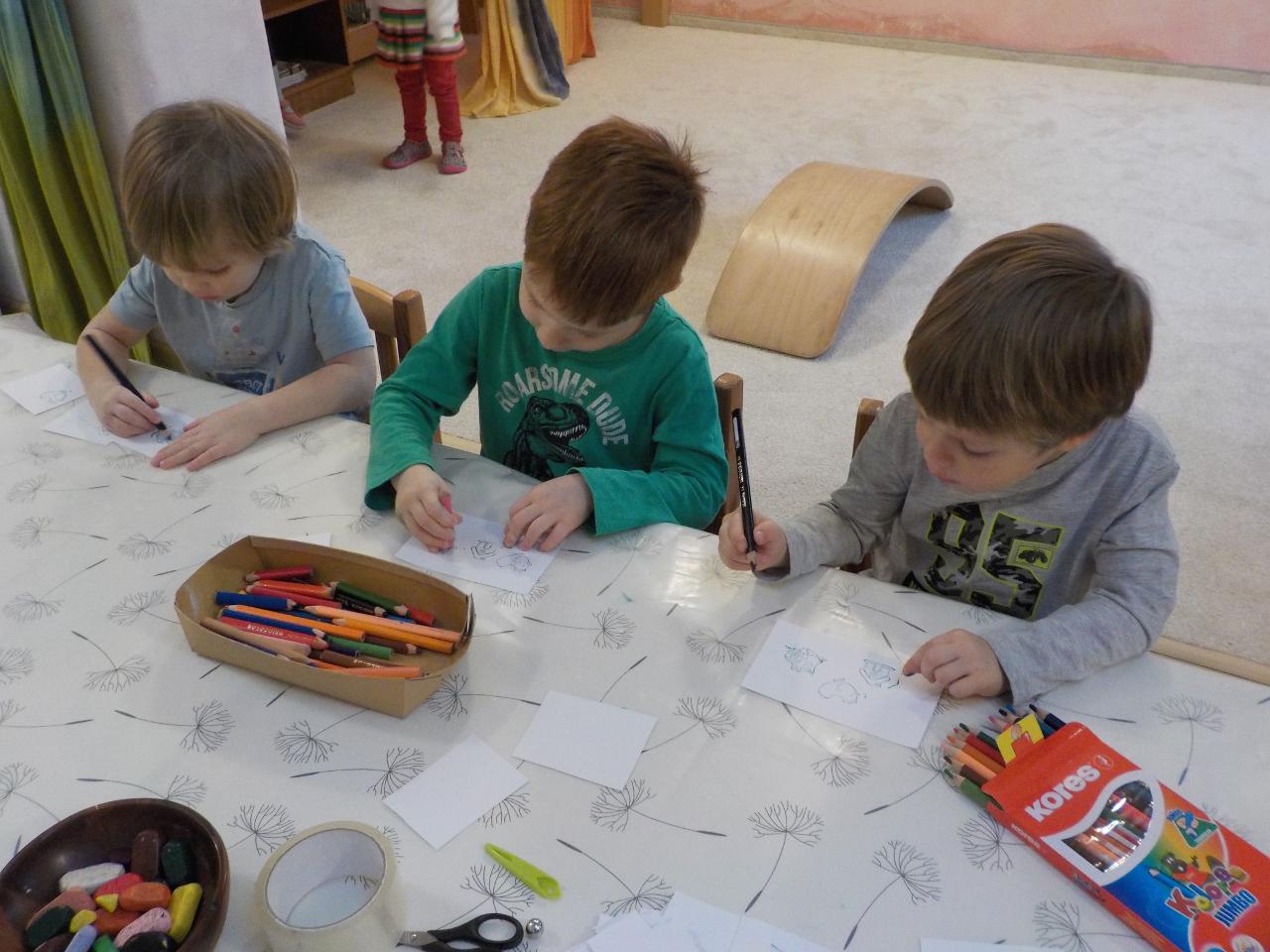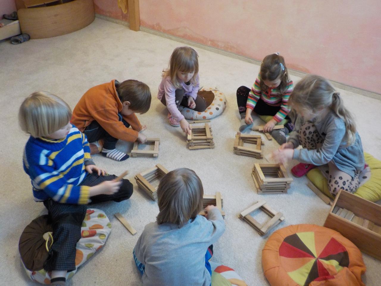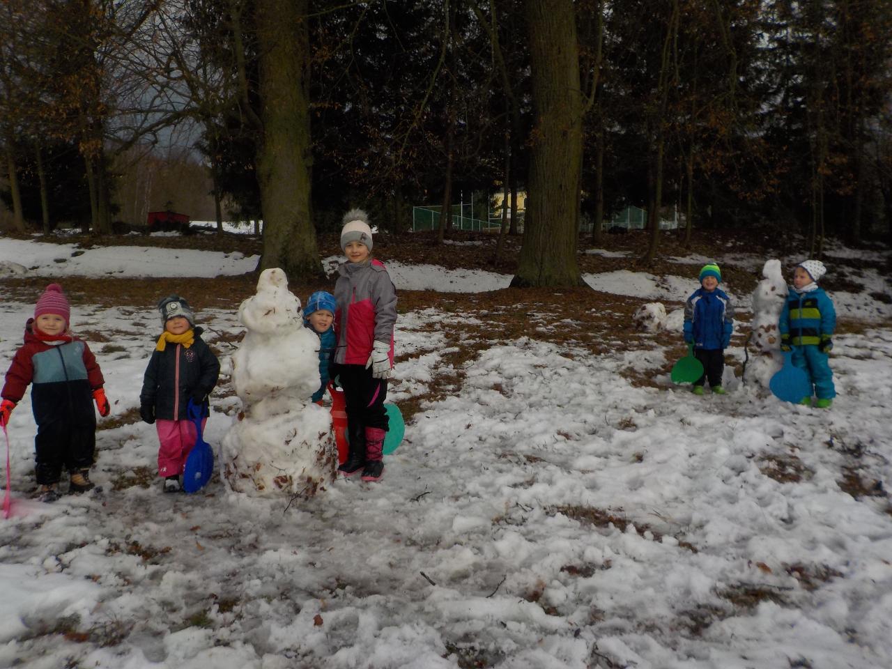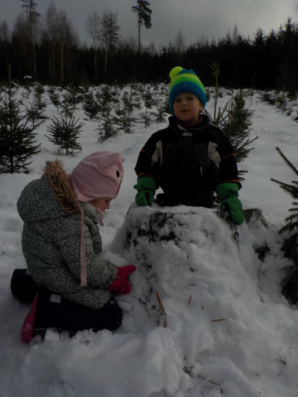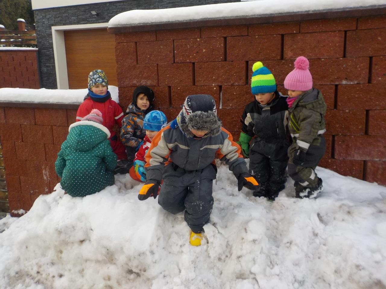 Zvířátka v zimě říkala: "Mrznout v zimě nebaví mě, hledat léto jdu." Ale léto nepřicházelo, a tak si museli postavit chaloupku. My jsme se na chvíli také proměnili na taková malá zvířátka, zahráli jsme si pohádku, zkoušeli jsme jako zvířátka z dřevíček roubit zdi, každý si domů odnesl malý zvířecí zápich.Zkoušeli jsme poznávat stopy zvířat ve sněhu, v pexesu i stopy keramické - ty jsme si pak otiskli do našich houstiček. V lese jsme zkontrolovali, zda zvířátka už všechno, co jsme jim nanosili pod vánoční stromek snědla - a opravdu, zbyl už jen malý kousíček mrkvičky. Hry dětí byly velmi radostné - ať už s hračkami, či bez nich - chvili jsme stavěli domečky a hráli si na "tlapkovou patrolu", jindy na "pana dokrotra", nebo jsme se vydali na "čundr".
