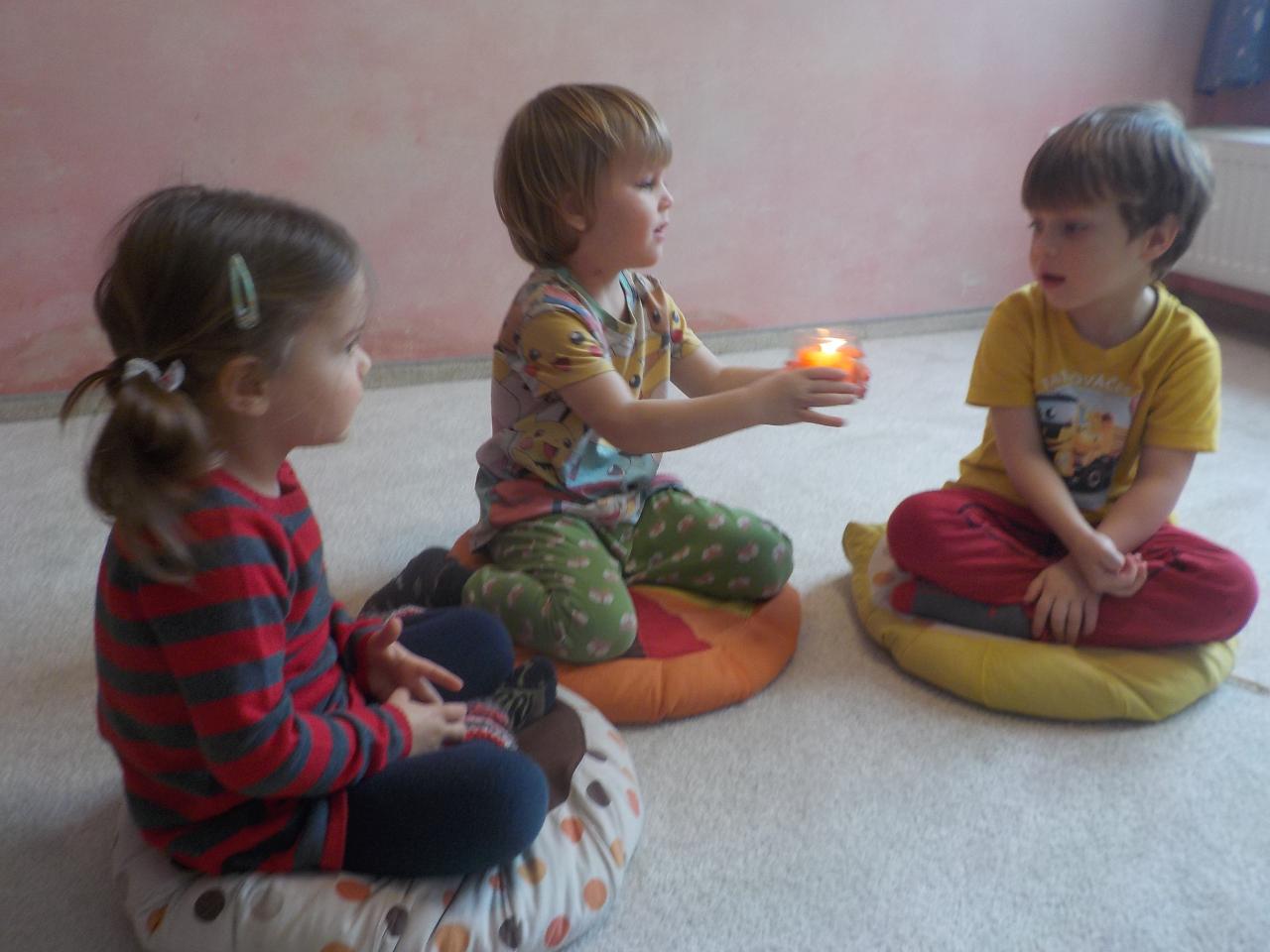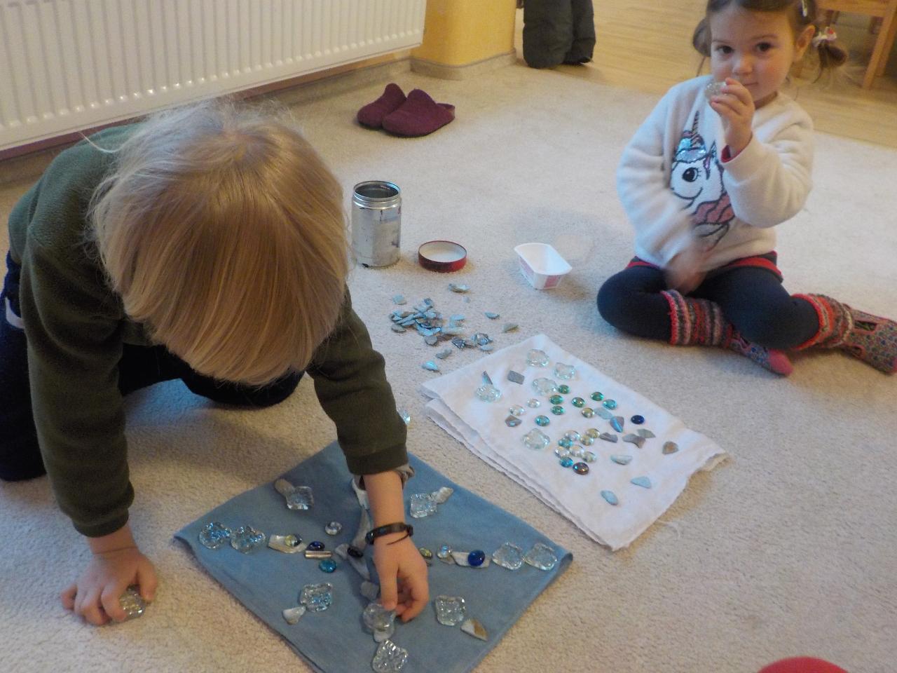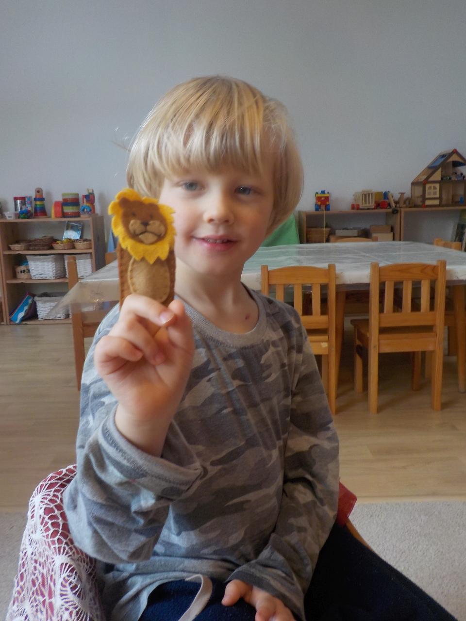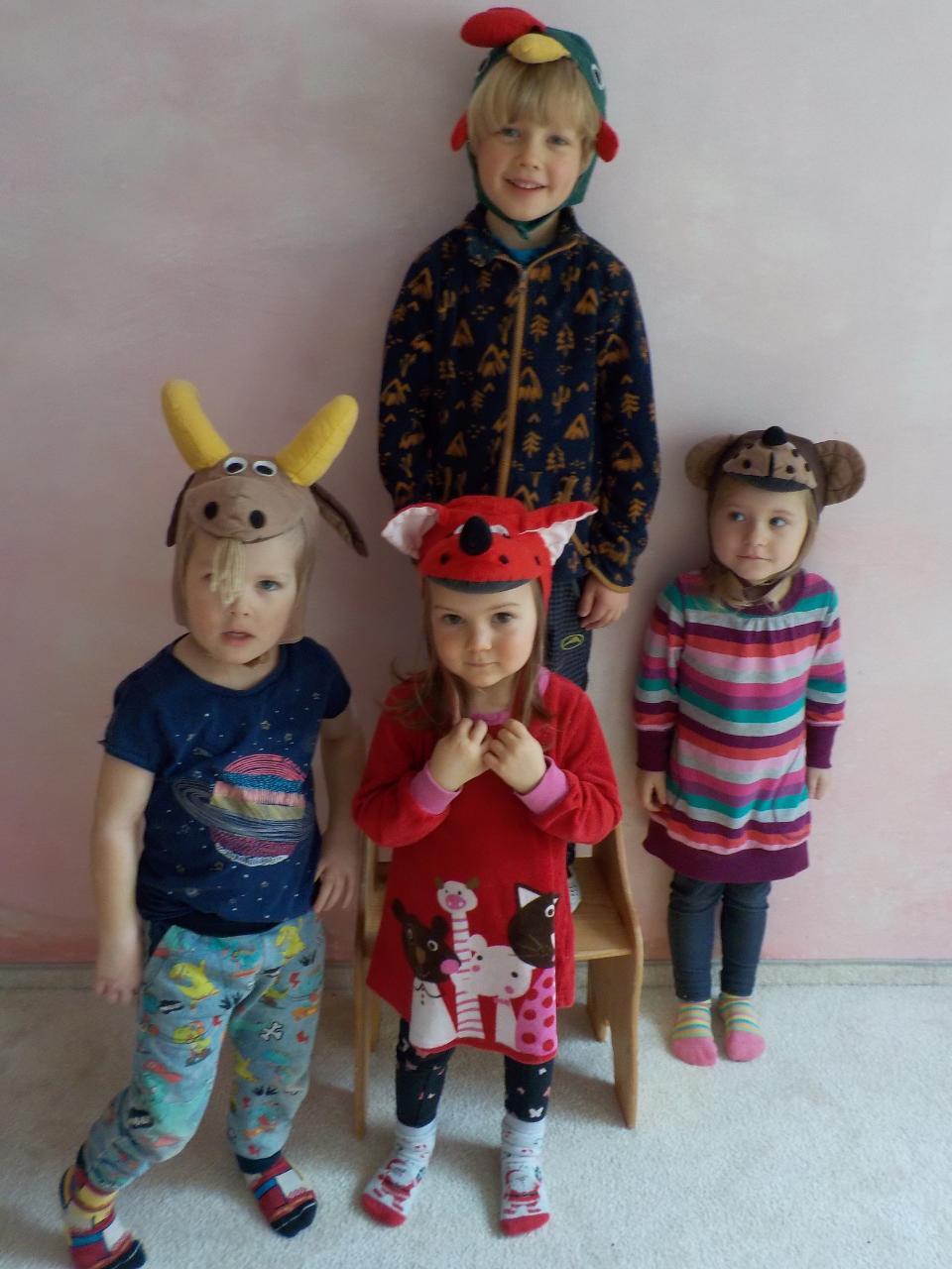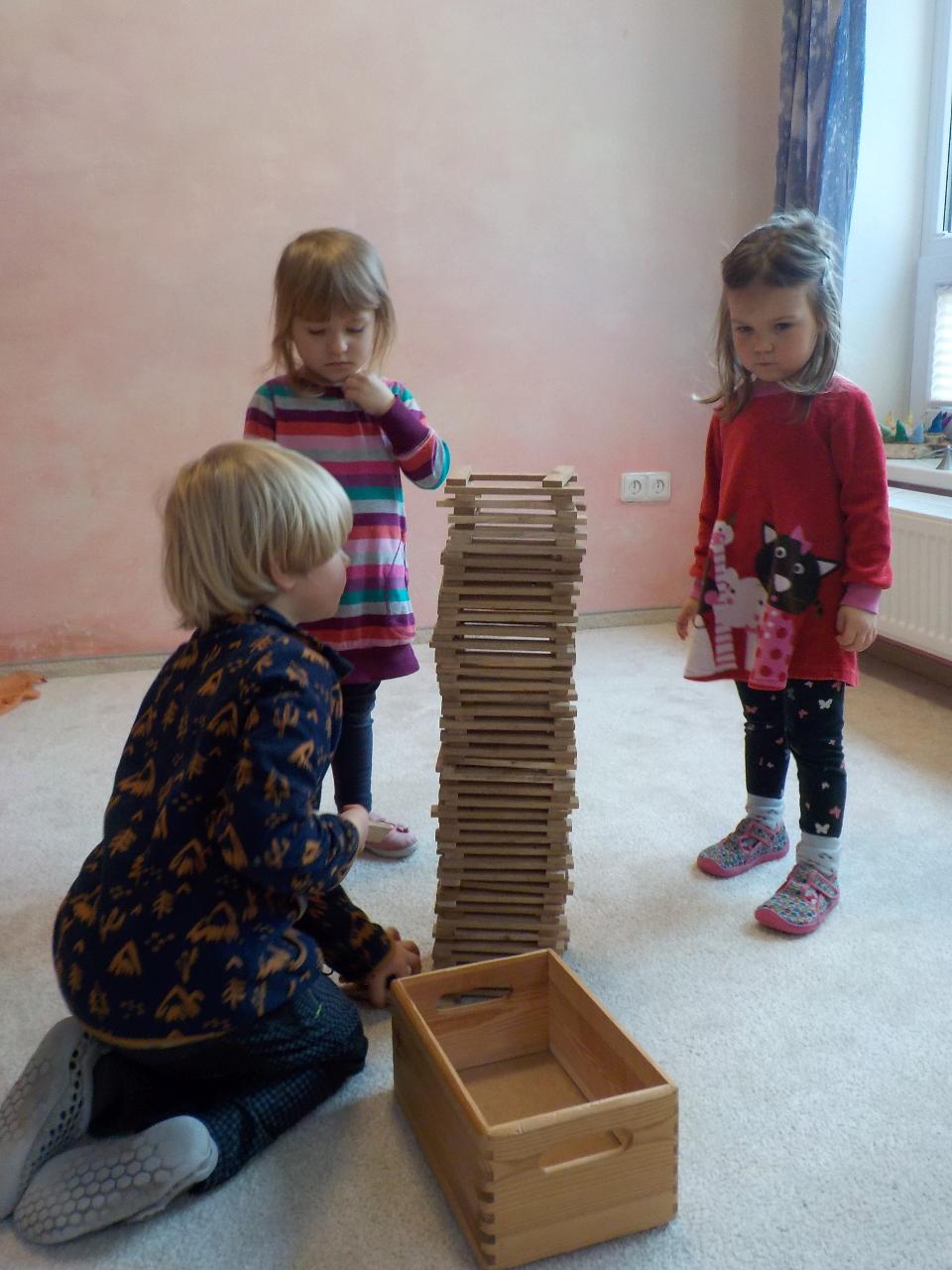 Zvířátka v zimě říkala: "Mrznout v zimě nebaví mě, hledat léto jdu." Ale léto nepřicházelo, a tak si museli postavit chaloupku. My jsme se na chvíli také proměnili na taková malá zvířátka, zahráli jsme si pohádku, zkoušeli jsme jako zvířátka z dřevíček roubit zdi, každý si domů odnesl malý zvířecí zápich.Zkoušeli jsme poznávat stopy zvířat ve sněhu, v pexesu i stopy keramické - ty jsme si pak otiskli do našich houstiček. V lese jsme zkontrolovali, zda zvířátka už všechno, co jsme jim nanosili pod vánoční stromek snědla - a opravdu, zbyl už jen malý kousíček mrkvičky. Hry dětí byly velmi radostné - ať už s hračkami, či bez nich - chvili jsme stavěli domečky a hráli si na "tlapkovou patrolu", jindy na "pana dokrotra", nebo jsme se vydali na "čundr".