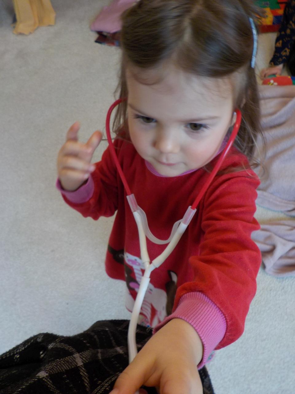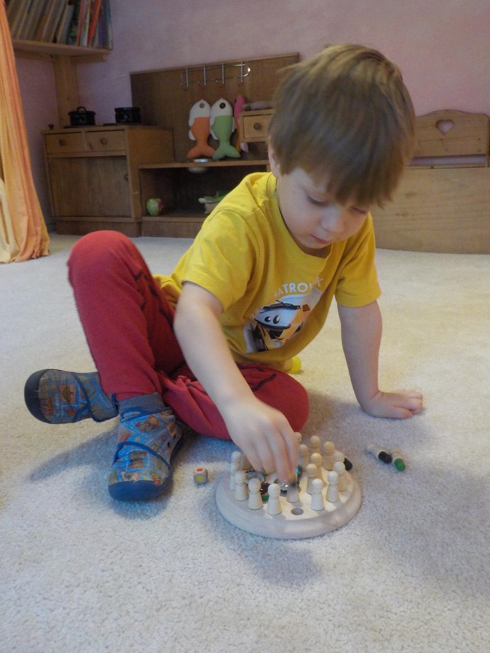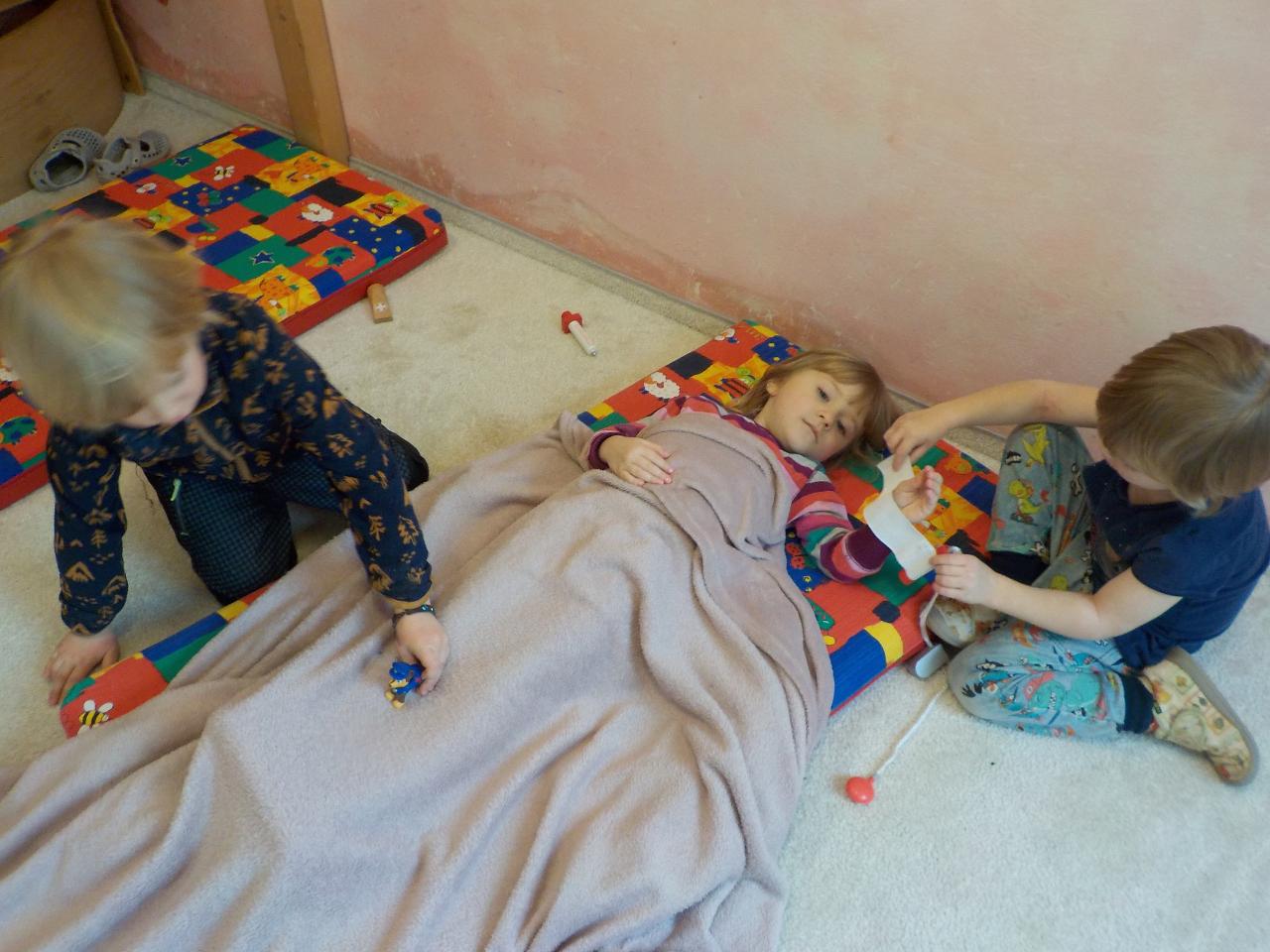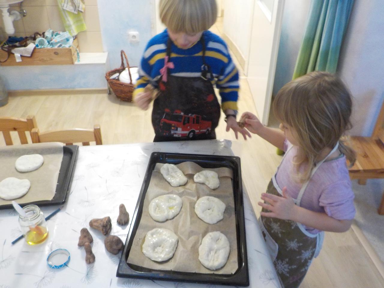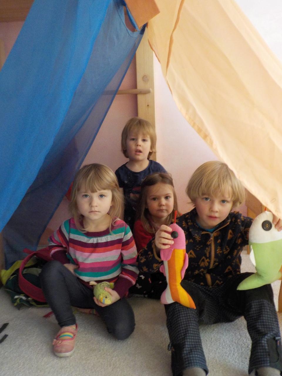 Zvířátka v zimě říkala: "Mrznout v zimě nebaví mě, hledat léto jdu." Ale léto nepřicházelo, a tak si museli postavit chaloupku. My jsme se na chvíli také proměnili na taková malá zvířátka, zahráli jsme si pohádku, zkoušeli jsme jako zvířátka z dřevíček roubit zdi, každý si domů odnesl malý zvířecí zápich.Zkoušeli jsme poznávat stopy zvířat ve sněhu, v pexesu i stopy keramické - ty jsme si pak otiskli do našich houstiček. V lese jsme zkontrolovali, zda zvířátka už všechno, co jsme jim nanosili pod vánoční stromek snědla - a opravdu, zbyl už jen malý kousíček mrkvičky. Hry dětí byly velmi radostné - ať už s hračkami, či bez nich - chvili jsme stavěli domečky a hráli si na "tlapkovou patrolu", jindy na "pana dokrotra", nebo jsme se vydali na "čundr".