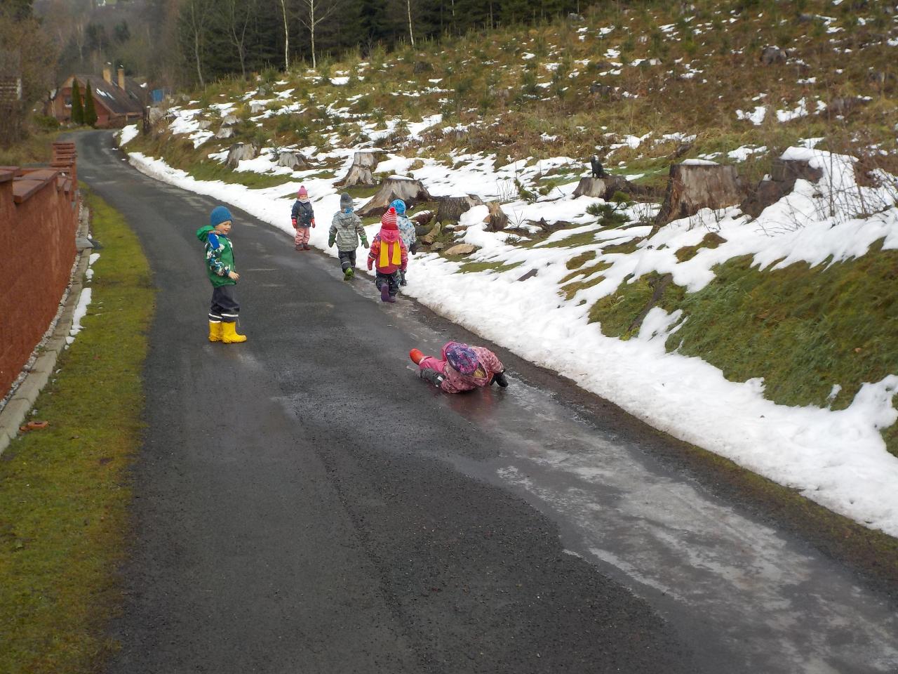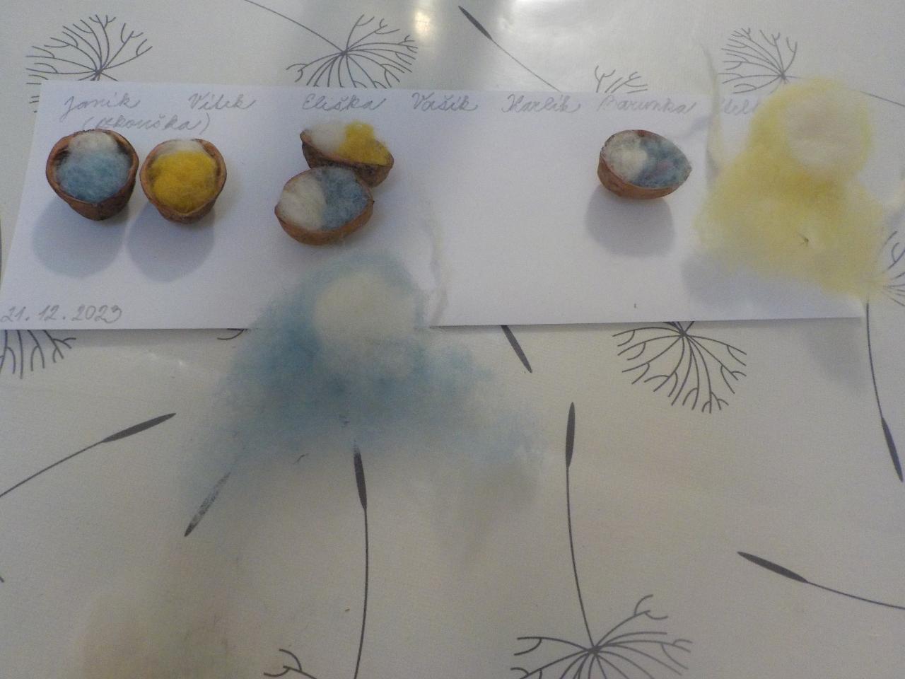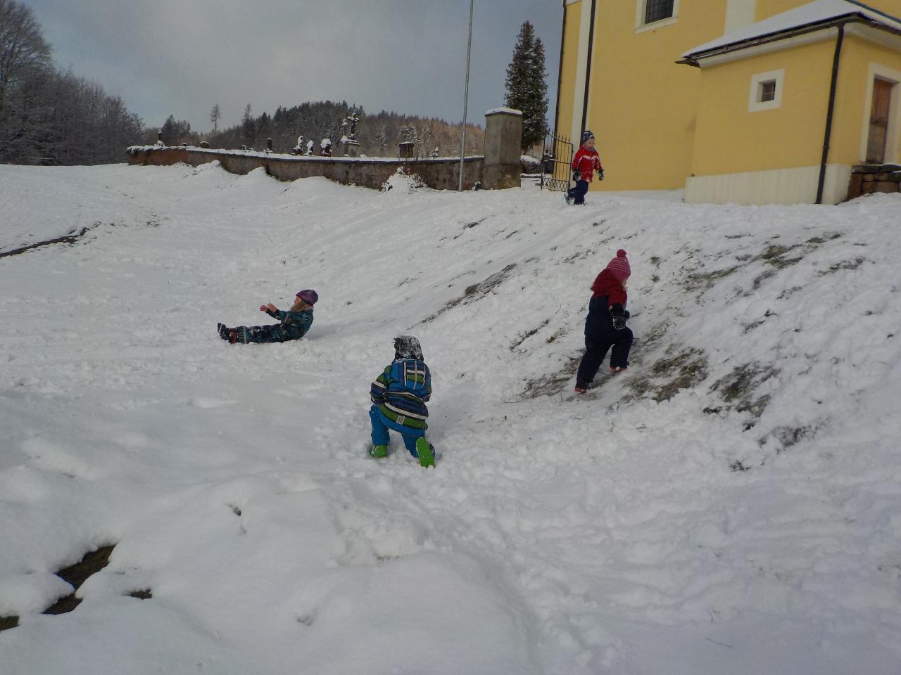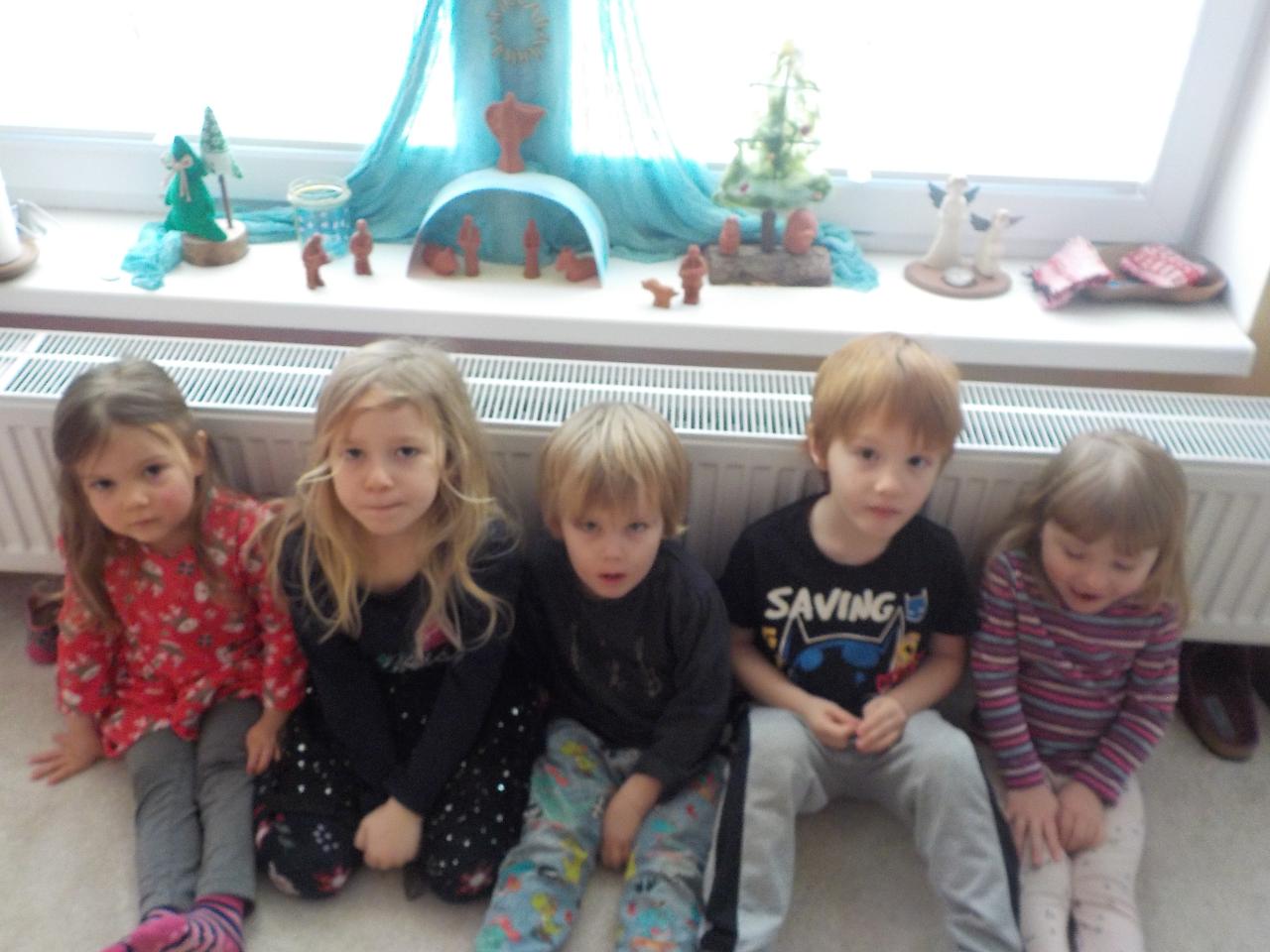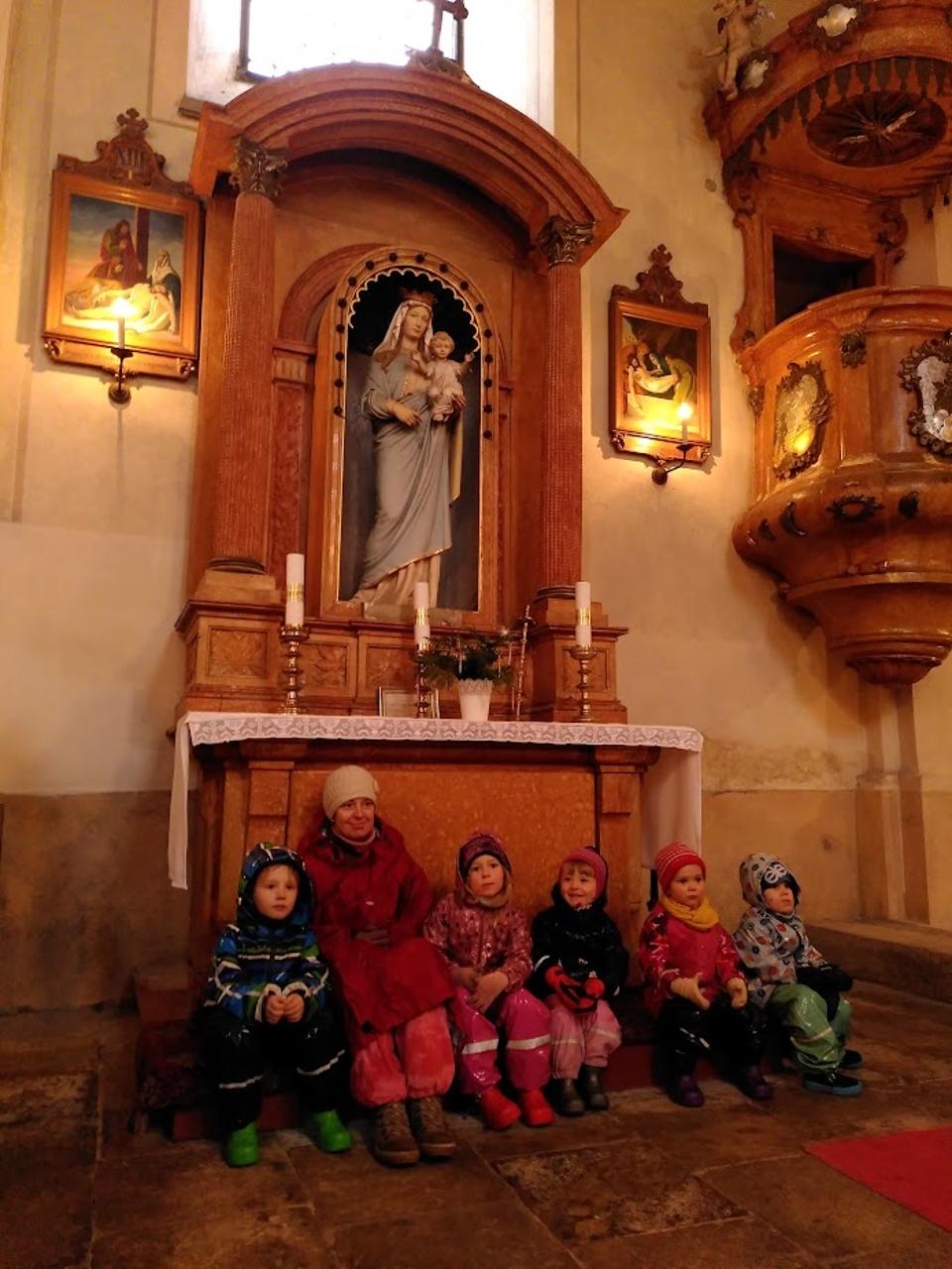 Adventních pytlíčků nám ubývá, s každým dnem je to vždy milé překvapení - co se skrývá uvnitř, ubývá i svíček a zkracuje se cesta na adventní spirále, kterou každý den zapalujeme. Ale her a radostných chvil mezi dětmi přibývá. A očekávání a napětí se stupňuje. Snažíme se ty chvíle plné napětí příjemně a velmi vědomě prožívat, čteme si, vyprávíme o svaté rodině, která je v nějvětším očekávání, každý den v betlémě přibývá nová postava a s ní i nový příběh, hra či písnička. Každý si tento týden domů odnesl malého Ježíška ve skořápce, kus vánočního papírového řetězu a velkou tašku plnou obrázků, které maloval po celý první půlrok. Upekli jsme společnými silami "štědrovku", venku jsme zdolávali poslední zbytky sněhu, těšili se na čerstvém, procházeli obřími kalužemi i na těch zamrzlých se klouzali. A aby té atmosféry nebylo málo, navštívili jsme kostelíček, kde nám školáci zahráli a zazpívali o vánočním příběhu.