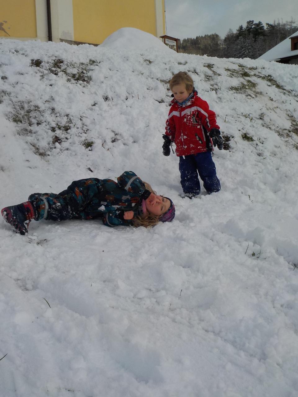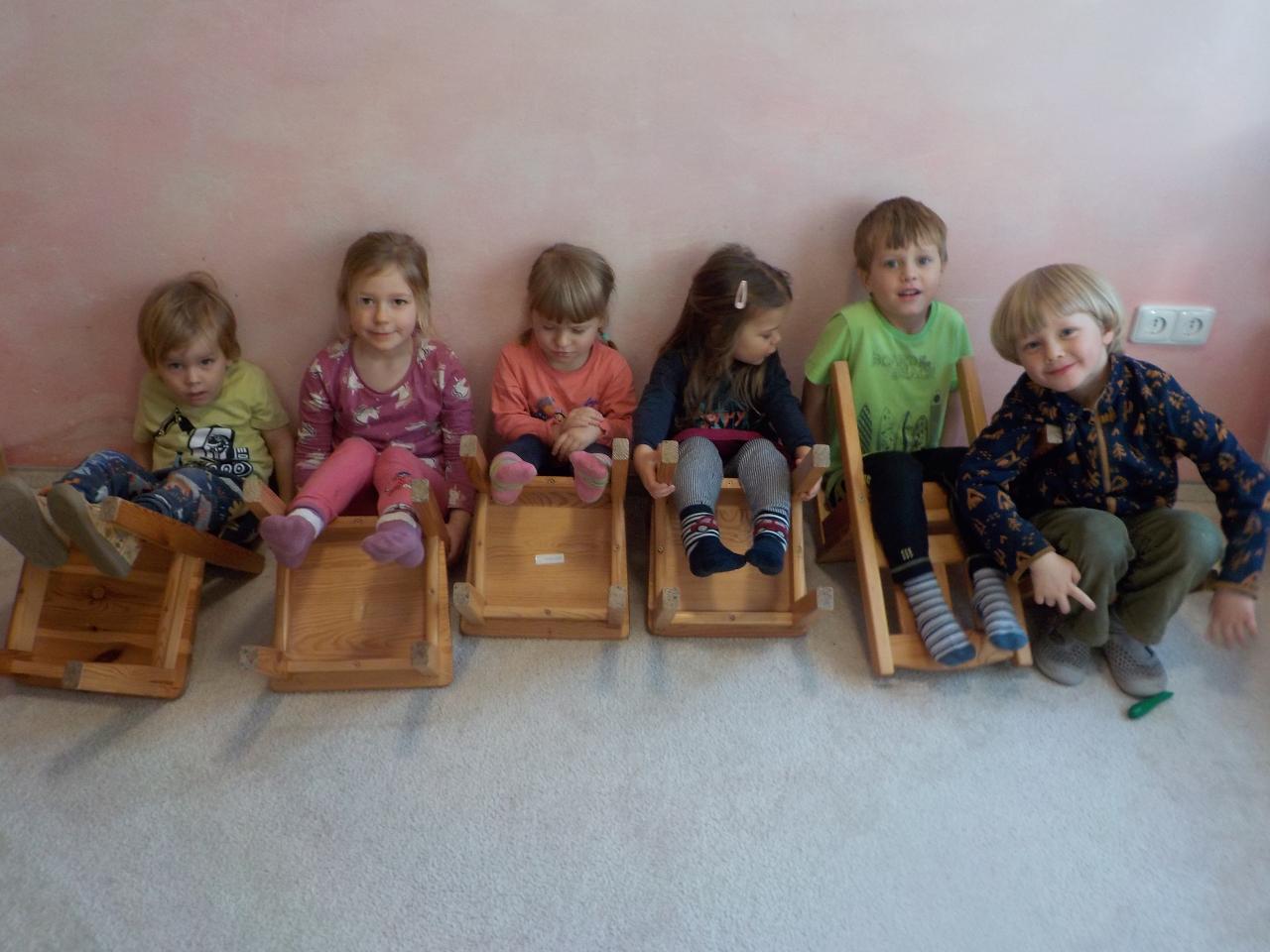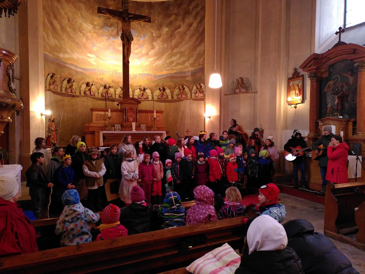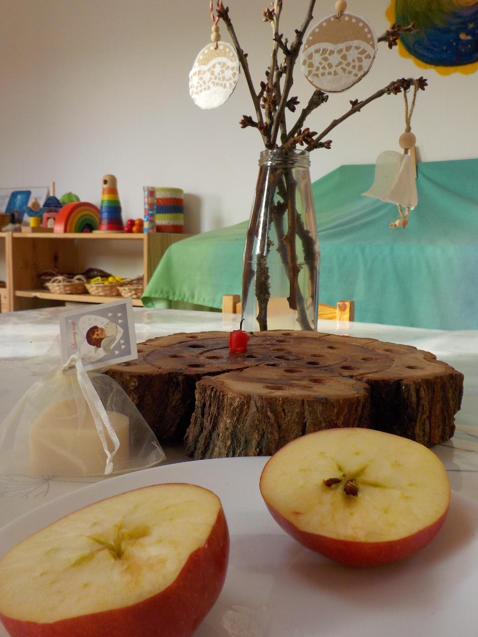 Adventních pytlíčků nám ubývá, s každým dnem je to vždy milé překvapení - co se skrývá uvnitř, ubývá i svíček a zkracuje se cesta na adventní spirále, kterou každý den zapalujeme. Ale her a radostných chvil mezi dětmi přibývá. A očekávání a napětí se stupňuje. Snažíme se ty chvíle plné napětí příjemně a velmi vědomě prožívat, čteme si, vyprávíme o svaté rodině, která je v nějvětším očekávání, každý den v betlémě přibývá nová postava a s ní i nový příběh, hra či písnička. Každý si tento týden domů odnesl malého Ježíška ve skořápce, kus vánočního papírového řetězu a velkou tašku plnou obrázků, které maloval po celý první půlrok. Upekli jsme společnými silami "štědrovku", venku jsme zdolávali poslední zbytky sněhu, těšili se na čerstvém, procházeli obřími kalužemi i na těch zamrzlých se klouzali. A aby té atmosféry nebylo málo, navštívili jsme kostelíček, kde nám školáci zahráli a zazpívali o vánočním příběhu.