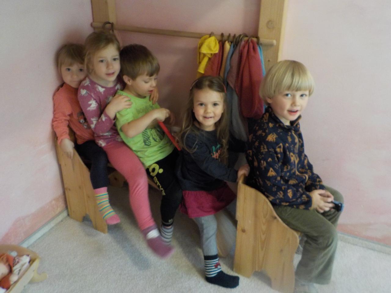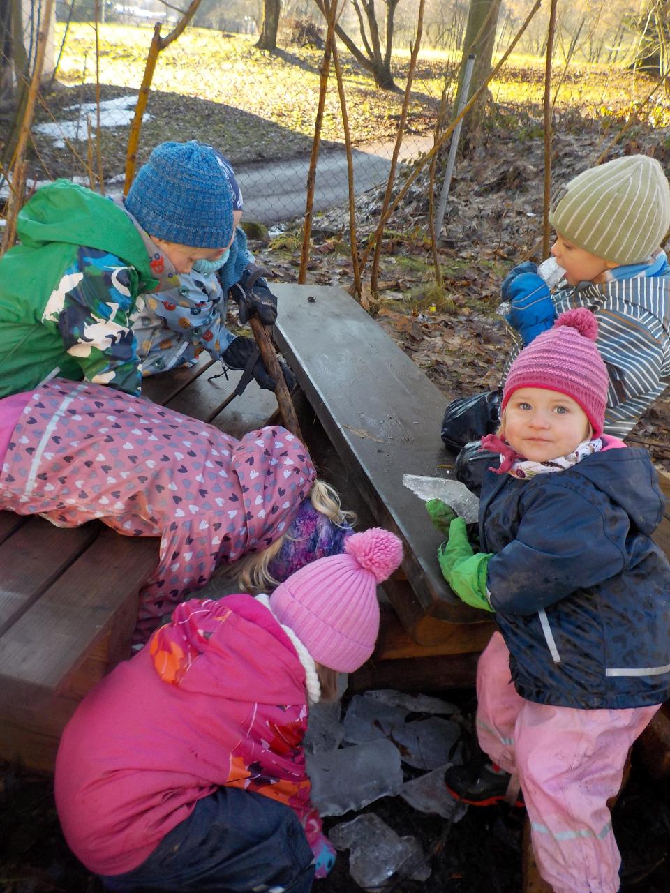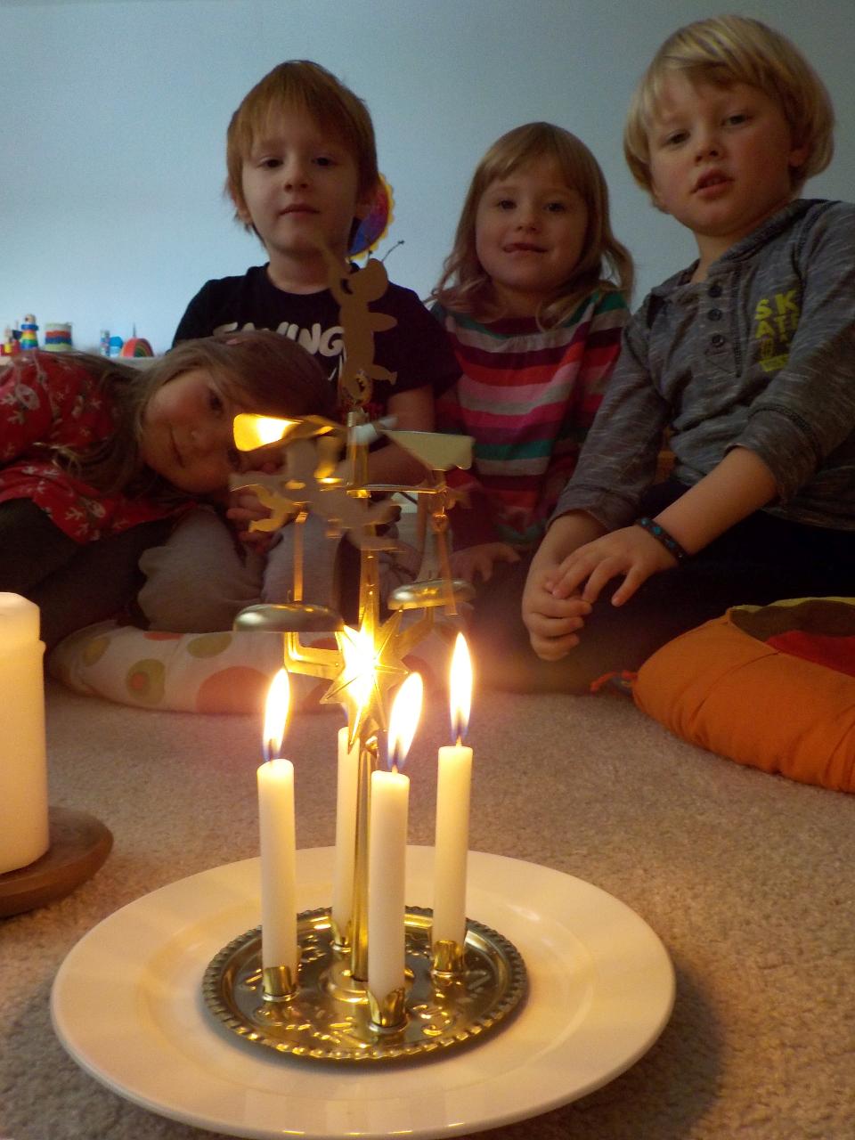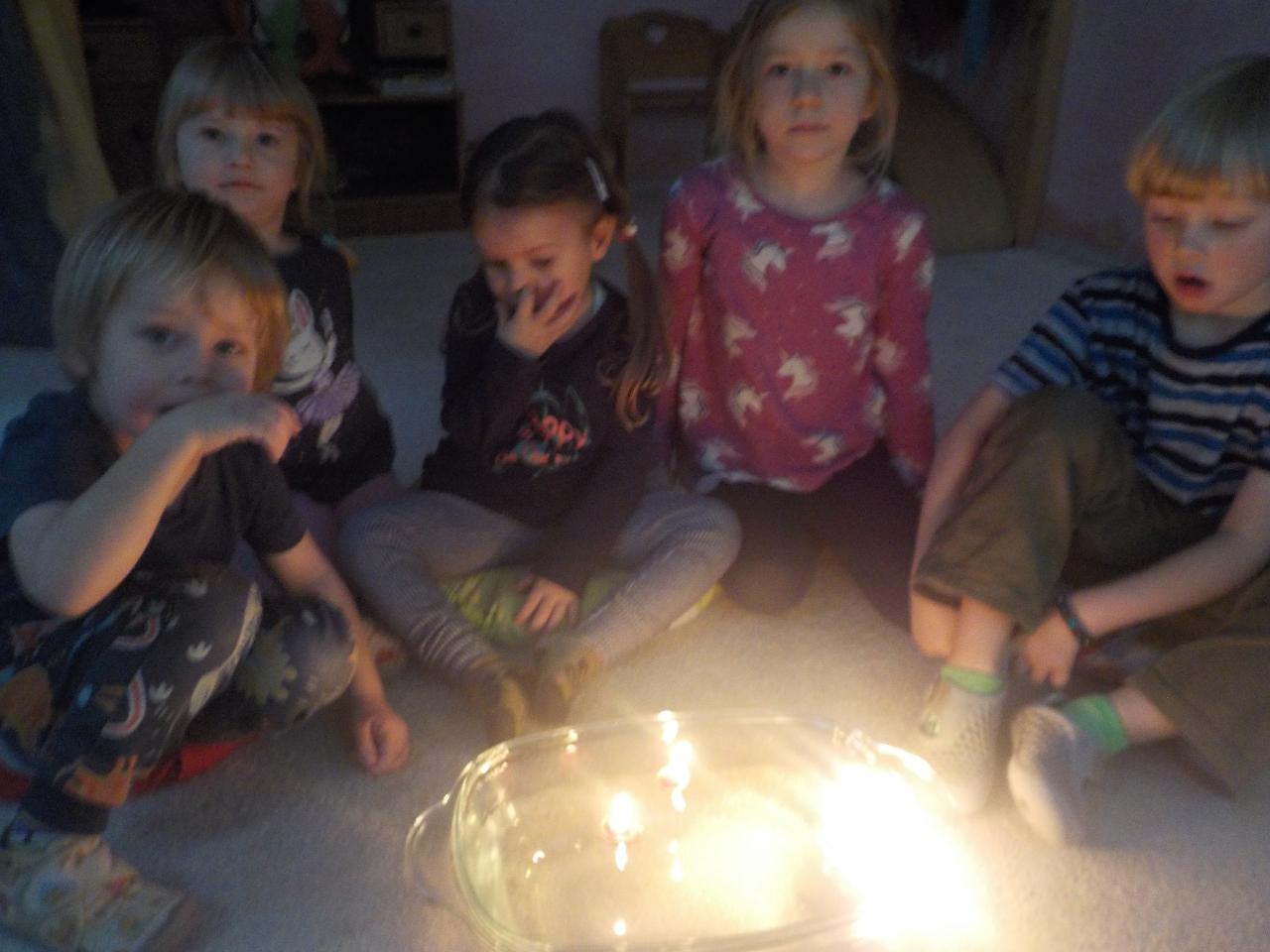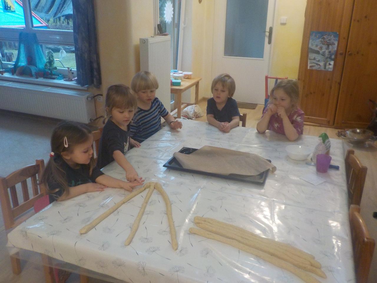 Adventních pytlíčků nám ubývá, s každým dnem je to vždy milé překvapení - co se skrývá uvnitř, ubývá i svíček a zkracuje se cesta na adventní spirále, kterou každý den zapalujeme. Ale her a radostných chvil mezi dětmi přibývá. A očekávání a napětí se stupňuje. Snažíme se ty chvíle plné napětí příjemně a velmi vědomě prožívat, čteme si, vyprávíme o svaté rodině, která je v nějvětším očekávání, každý den v betlémě přibývá nová postava a s ní i nový příběh, hra či písnička. Každý si tento týden domů odnesl malého Ježíška ve skořápce, kus vánočního papírového řetězu a velkou tašku plnou obrázků, které maloval po celý první půlrok. Upekli jsme společnými silami "štědrovku", venku jsme zdolávali poslední zbytky sněhu, těšili se na čerstvém, procházeli obřími kalužemi i na těch zamrzlých se klouzali. A aby té atmosféry nebylo málo, navštívili jsme kostelíček, kde nám školáci zahráli a zazpívali o vánočním příběhu.