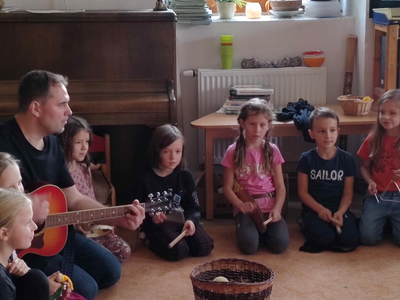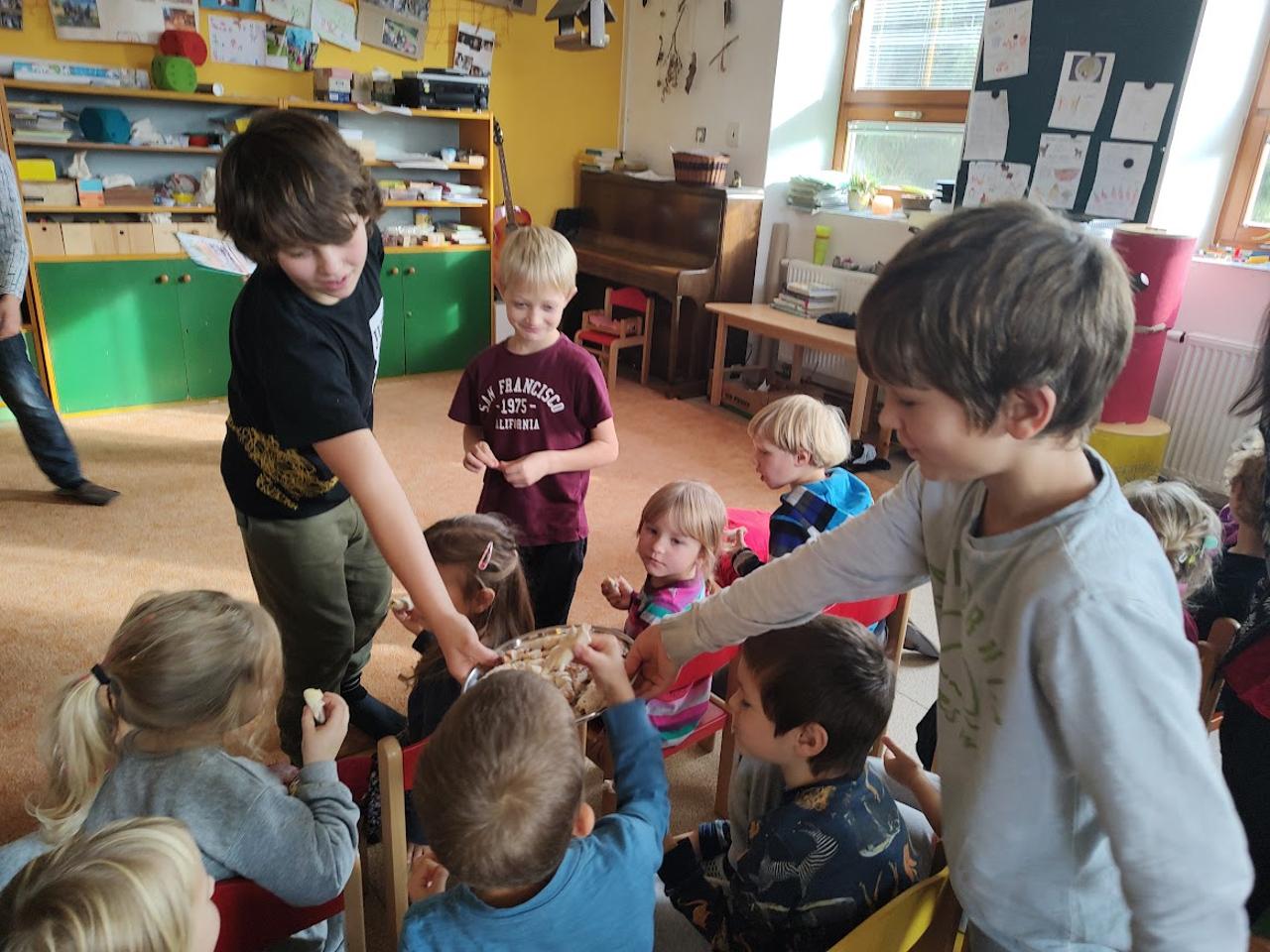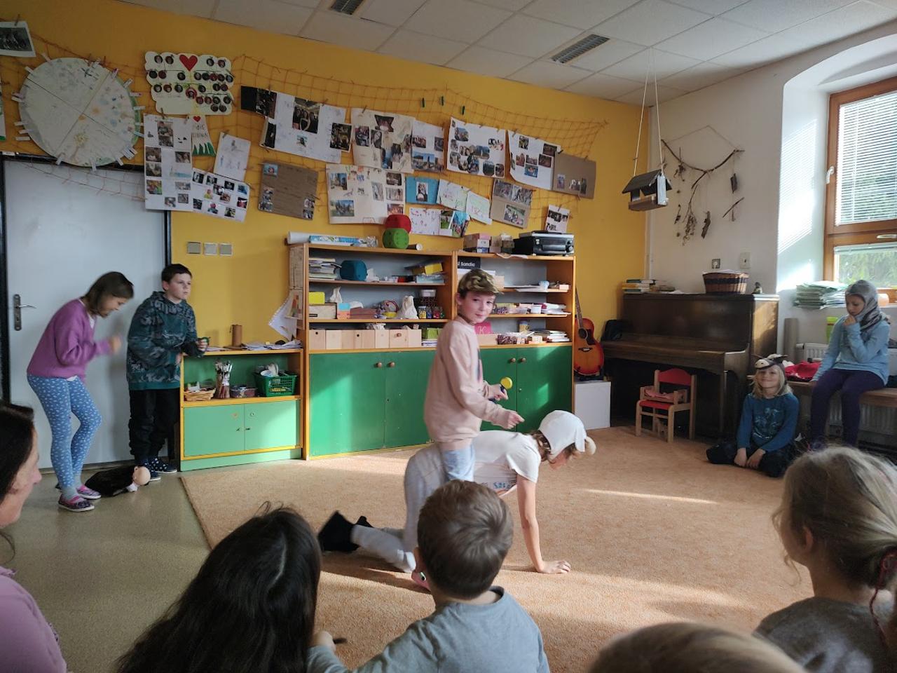 Svatý Martin přijel k nám, toho pána dobře znám. Jede na svém bílém koni, vločka vločku někde honí......Tento týden probíhal na téma sv. Martina. Kdo to byl, proč je svatý a koho je patronem? Děti si vyrobily několik výrobků na toto téma, vitráž, lucerničku... připravily rohlíčky na obdarování, zahrály si divadlo. V pátek pozvaly děti ze školky a divadlo předvedly i jim. Navzájem se obdarovaly rohlíčky a prožily tak pěkně strávený společný čas.