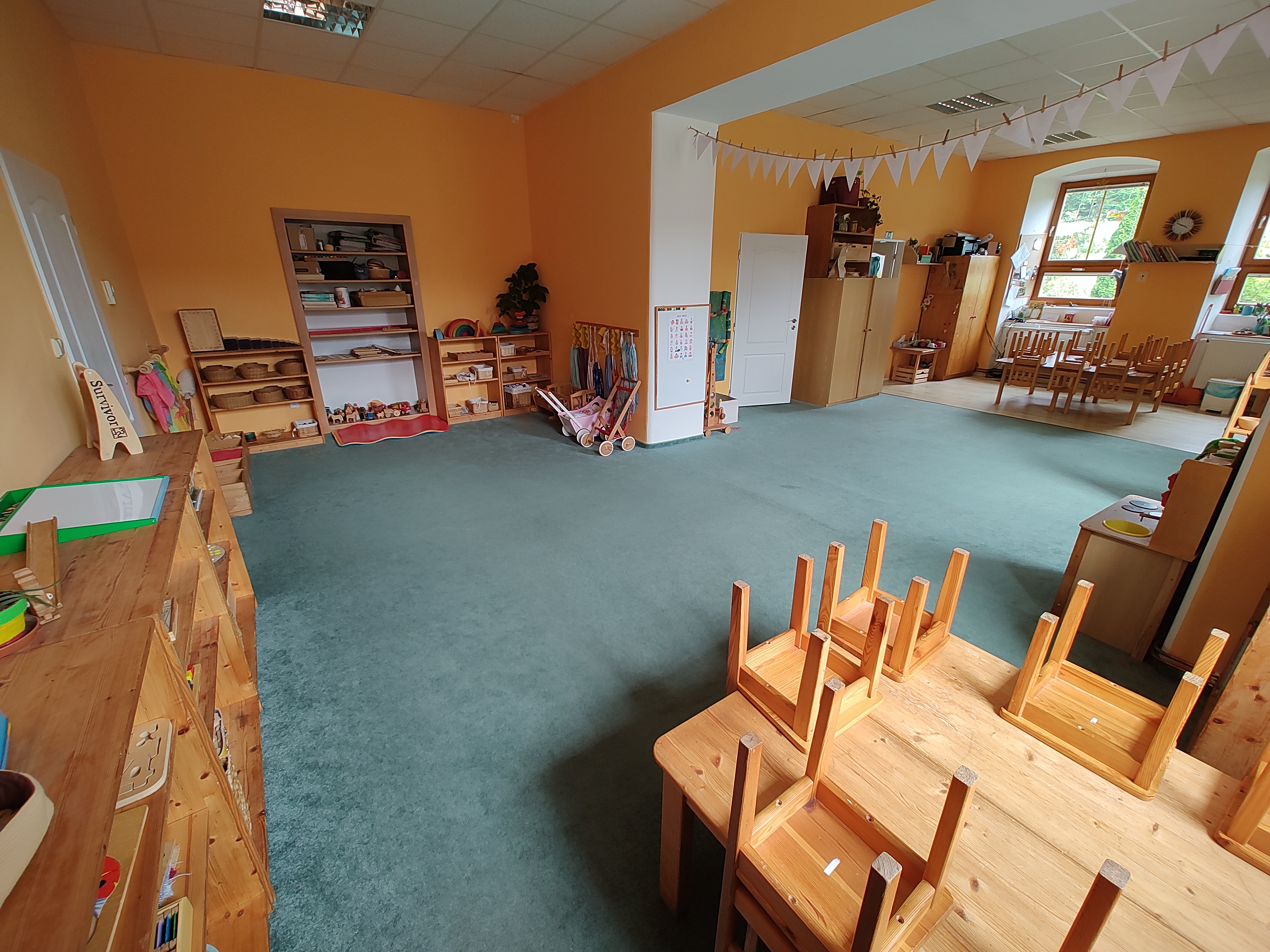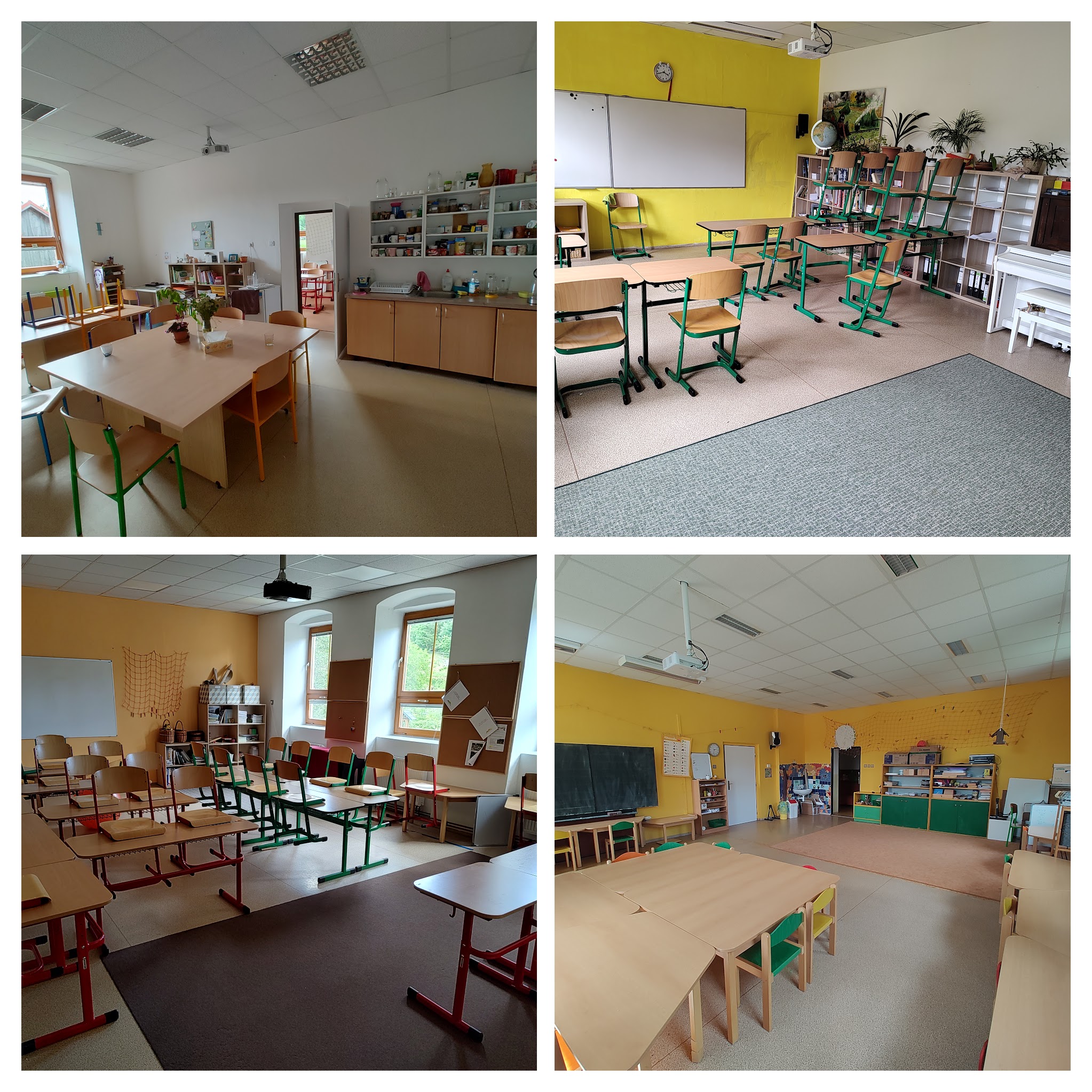První patro patří škole. Jsou zde k dispozici čtyři třídy a malá kuchyňka s možností uvařit si čaj. V mezipatře jsou toalety a sprcha.