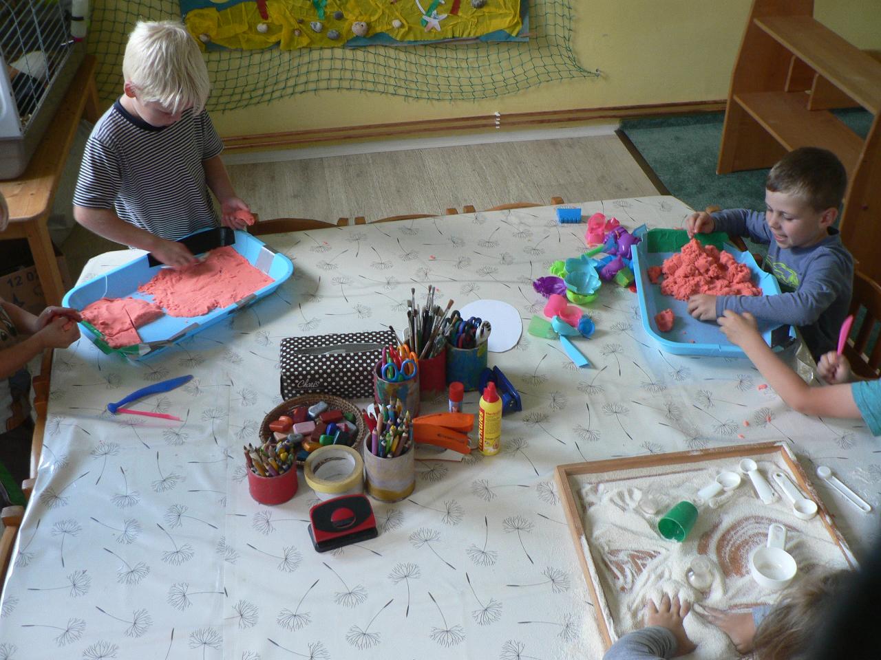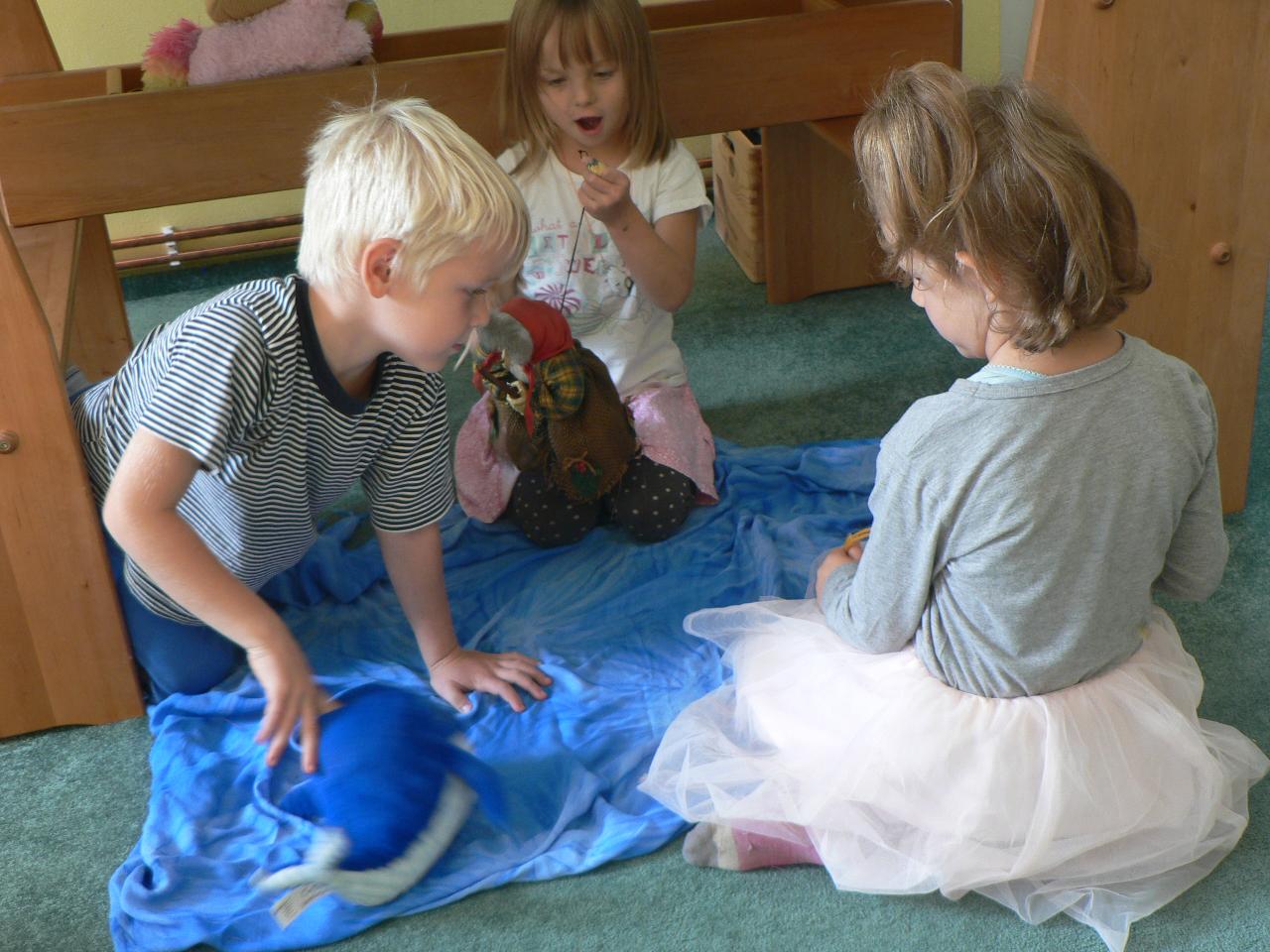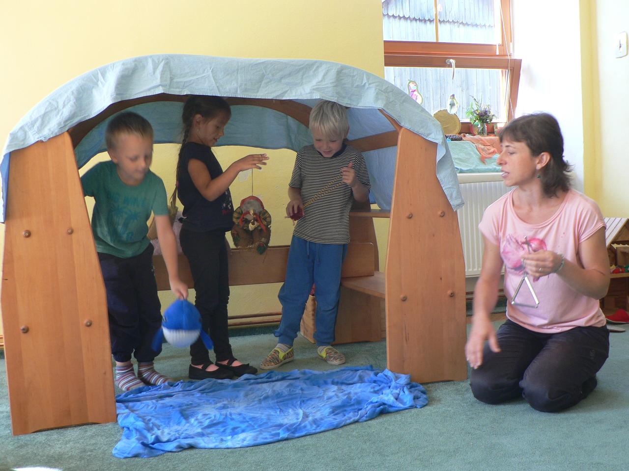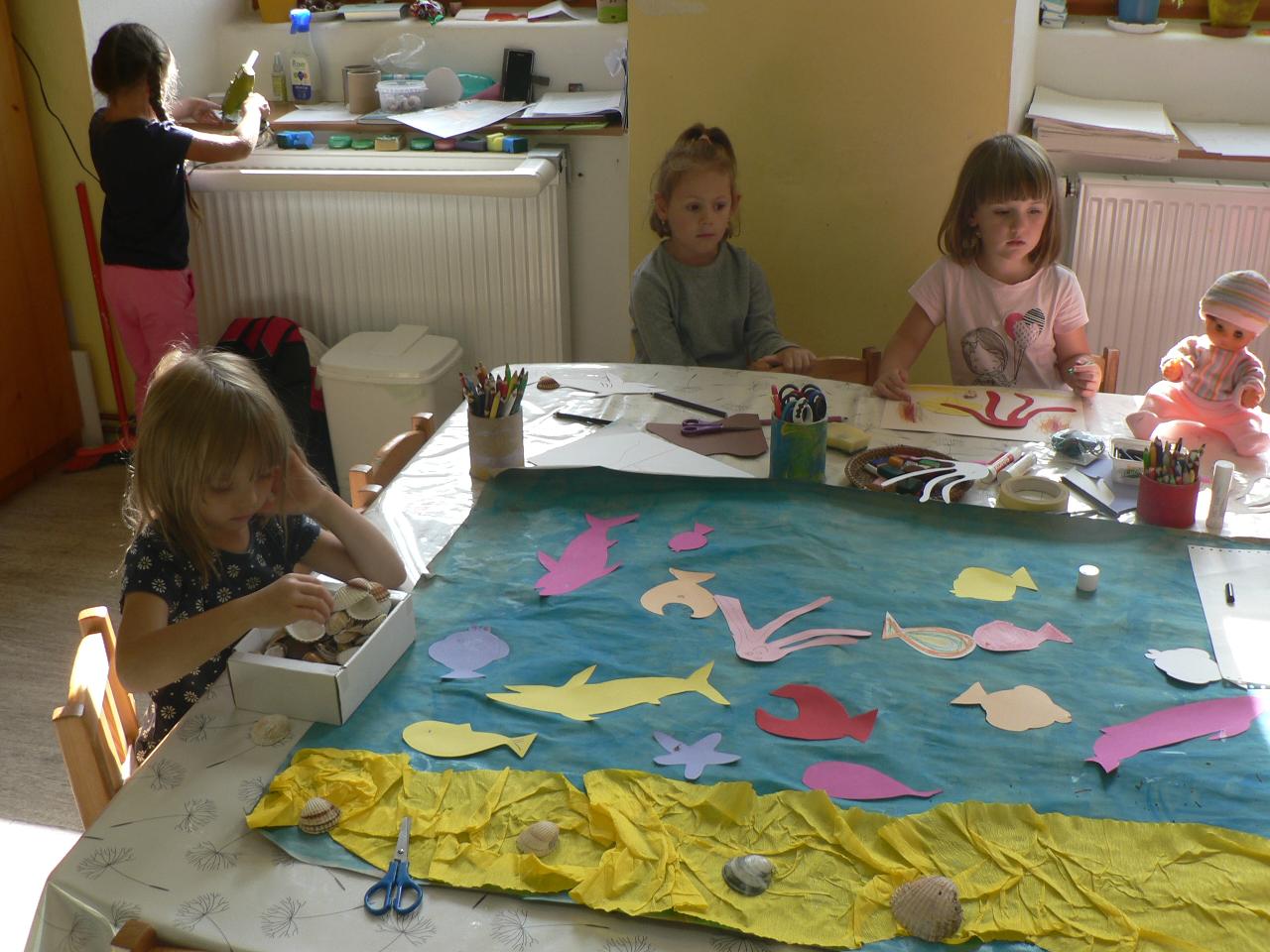 …praví věštba v pohádce Největší poklad, která nás tímto týdnem provázela. Pohádka vypráví o přátelství čarodějky, havrana a velryby, o volbě královny všech čarodějek a také o tom, že ten největší poklad nelze koupit za zlato. Skutečné přátelství je totiž nad všechny poklady světa. Tento týden byl plný legrace a kamarádství. Hráli jsme nové hry, vyráběli velryby s vodotryskem, tvořili společné moře plné nejroztodivnějších ryb a živočichů, malovali jsme třpytivé rybičky a pomocí různých hudebních nástrojů jsme zkoušeli vytvořit zvuky moře. Povídali jsme si také o tom, jak se k sobě chovají opravdoví kamarádi a co máme či nemáme rádi. Ze začátku týdne trochu pršelo, a tak jsme mohli vodní živel poznat a prožít na vlastní kůži. V druhé polovině týdne však už zase svítilo slunce, takže jsme odhodili holinky a nepromokavé oblečení a opět s chutí vyrazili do lesa a na louky, běhali jsme po kopcích nebo si prosekávali cestičky divokými kopřivami.