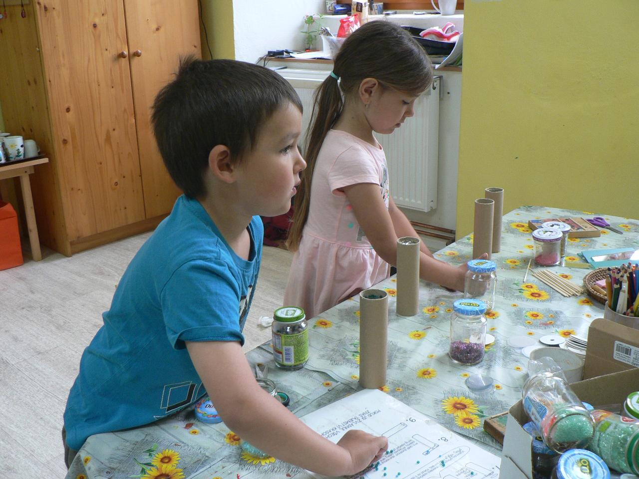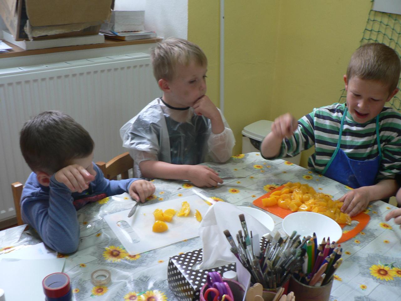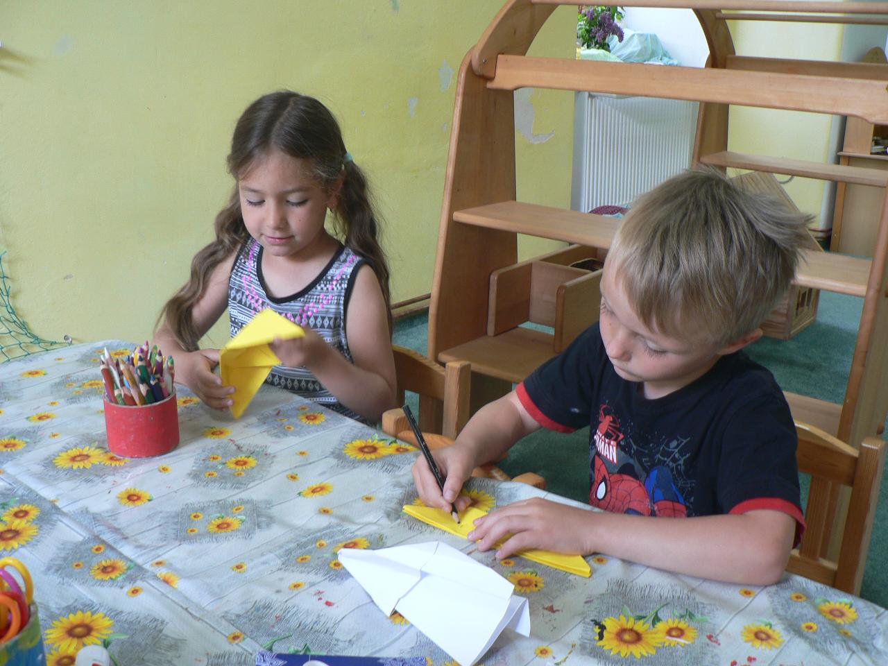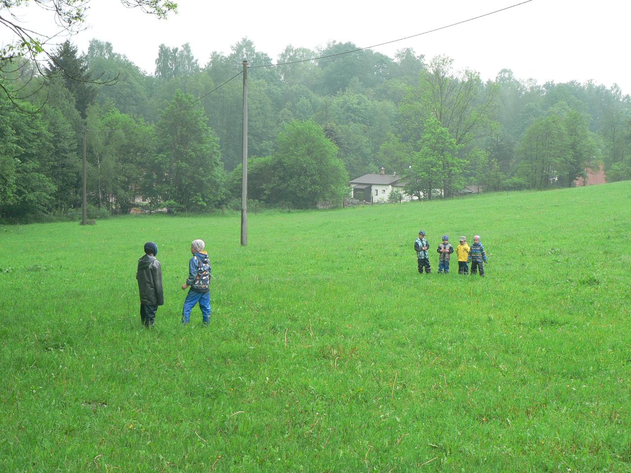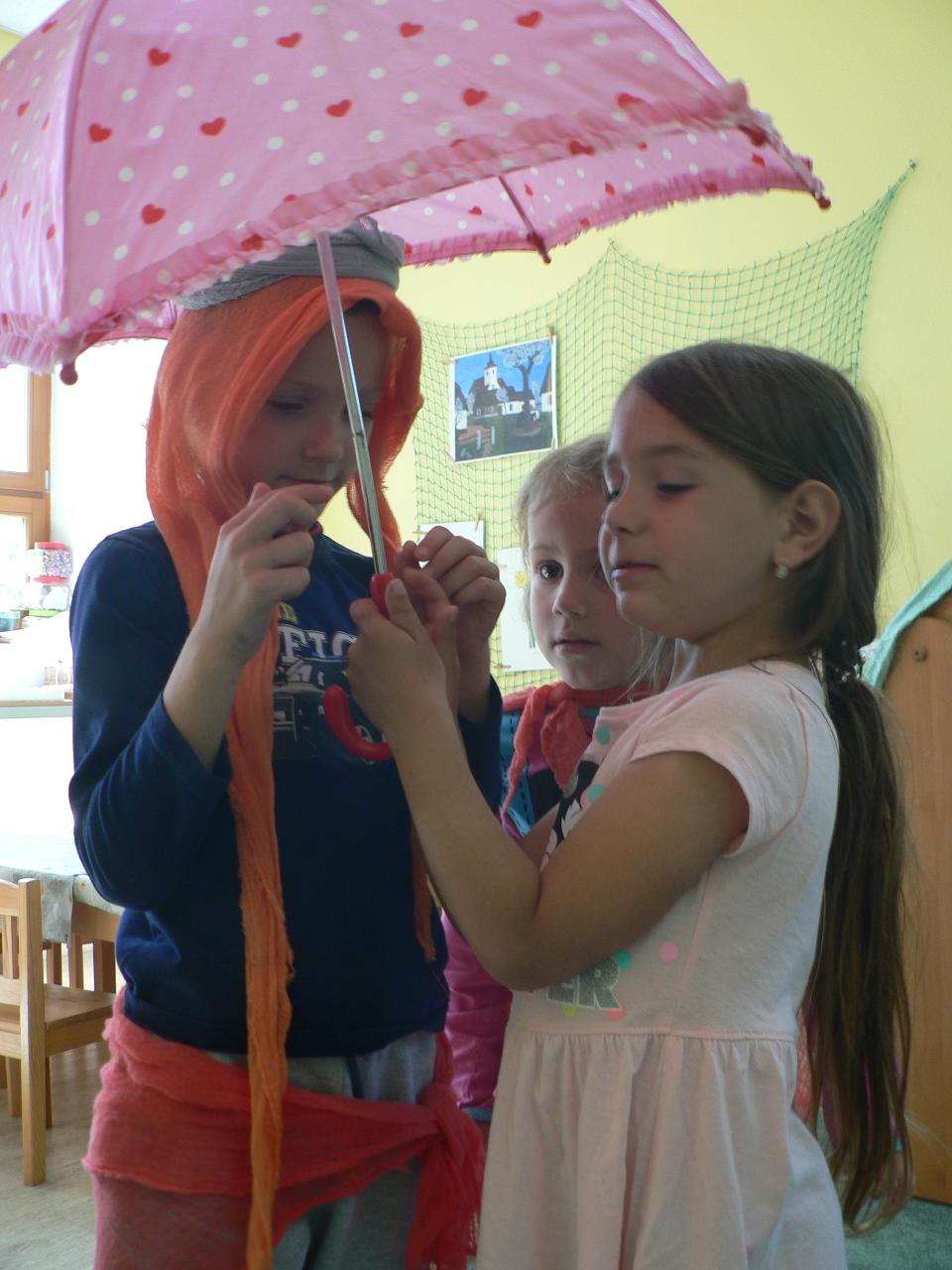 Tímto týdnem nás provázela pohádka o holčičce Mančince a kouzelném paraplíčku, díky kterému získala zpět ztracenou odvahu a sebedůvěru. Nejen Mančinku, ale i nás tento týden pokropil poslední májový deštík, a tak jsme si mohli opět řádně zadovádět ve vodě. Děti tentokrát vystřihovaly a lepily průsvity ve tvaru paraplíček, malovaly, tvořily dešťové víly z jemných barevných látek a ovčího rouna. Tančili jsme kolové tance, zpívali, cvičili a v pátek jsme pak společně s dětmi ve školce prožili dětský den. Vyráběli jsme barevné kaleidoskopy, tvořili vlastní nepečený dort, který jsme pak společně po obědě snědli. A čekalo nás také překvapení v podobě setkání s malým bagříkem. Děti si mohly vyzkoušet, jak se v takovém bagříku sedí, kolik je v něm páček a k čemu slouží, jestli je tam klakson a pedály, a zjistit spoustu dalších zajímavých věcí. Zvlášť u kluků vyvolal bagřík velké nadšení, ale nejen u nich. Májové deštíky odezněly a na dětský den nám krásně svítilo sluníčko.