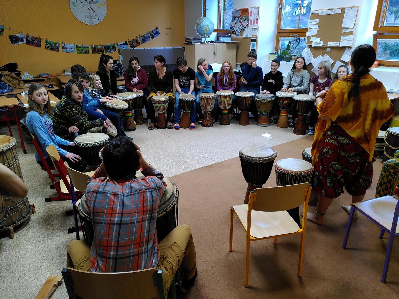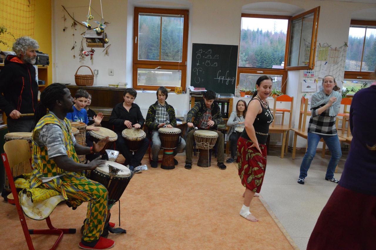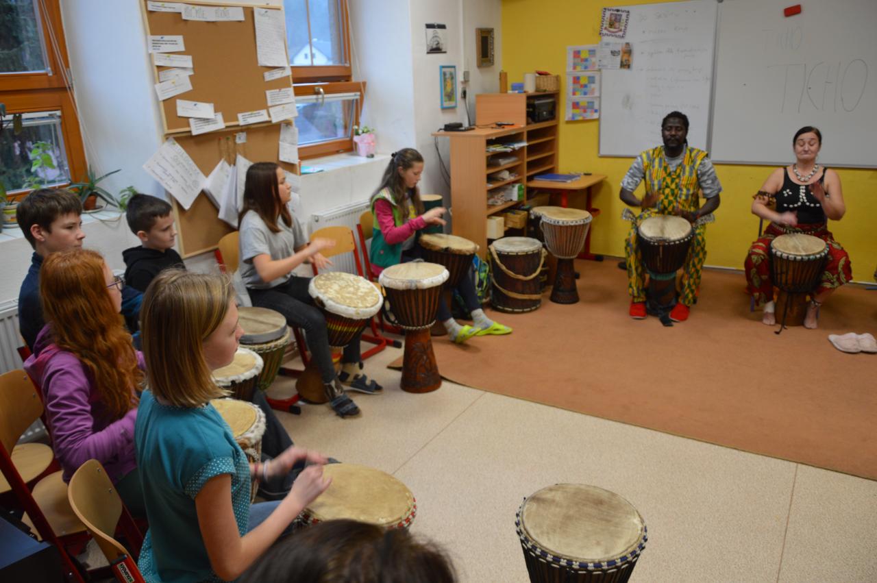 V pátek k nám zavítali afričtí bubeníci a mohli jsme si tak vyzkoušet bubnování na africký buben a také se pohybovat v rytmu bubnování.