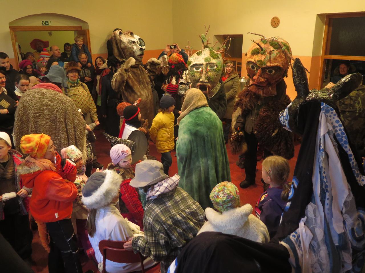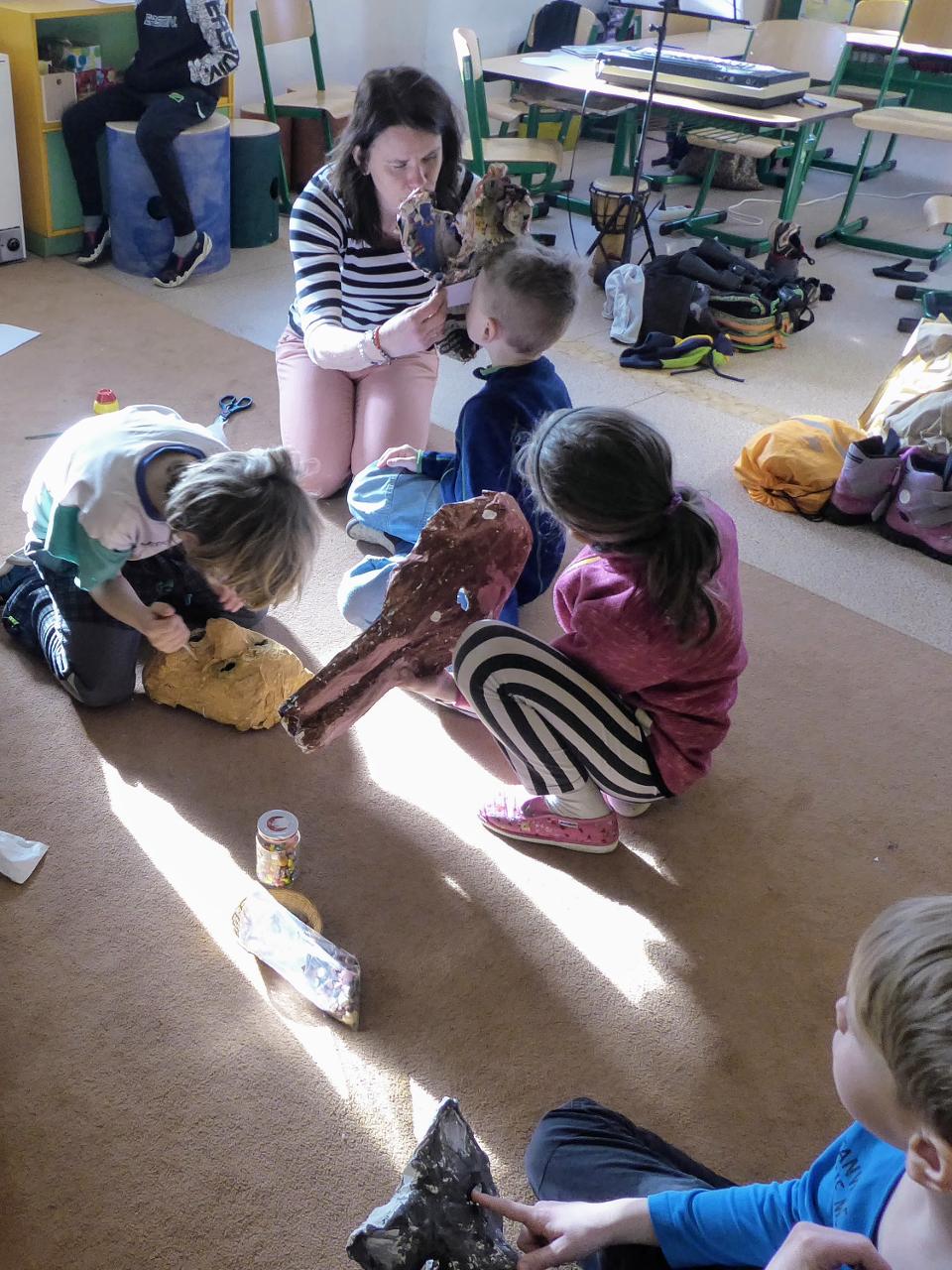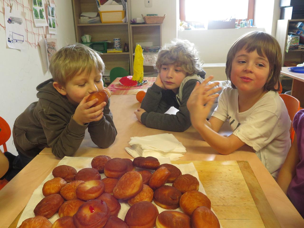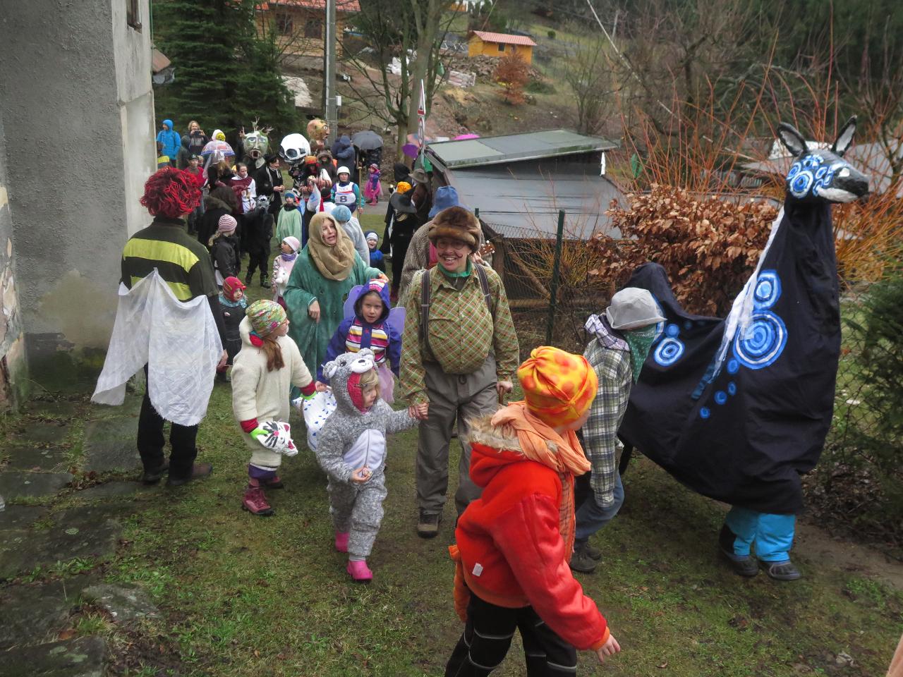 Začátkem března, v úterý 5.3. nás čekala masopustní veselice, na kterou jsme se i ve škole v pondělí a v úterý ještě připravovali. Školáci si dobarvovali masky, společně jsme pak pekli kváskový chléb, plnili maximravenci usmažené koblihy a připravovali taneční a hudební doprovod. V úterý odpoledne pak masopustní radost vypukla. Od mraveniště se vydal průvod vesnicí a jeho součástí byly postavy známé i neznámé.. medvěd, liška, bandita, kobyla, včelky a také radost nebo lesní tvorové. Po setkání s částí místních obyvatel jsme roztančili školní jídelnu a dali si k tomu spoustu dobrot - a pak přišel PŮST. Další část týdne jsme se již začali věnovat zimním sportům. V pátek se školákům plnilo další přání z nápadníčku a tak jsme mohli všichni společně zažít pyžamový den. Hned ráno jsme se převlékli do pyžama a celý den jsme se učili v tomto pro školu velmi netypickém oblečení :-) V rámci příprav na zimní výjezd jsme četli pohádku o Raškovi, kreslili jsme, jaké zimní sporty známe a poznávali jsme ty, které neznáme. Pouštěli jsme si ukázky sportů olympijských i jsme si četli svou oblíbenou knížku. Také pokračovalo nahrávání Markoušovického (mravenčího) rozhlasu moderátory Máťou a Šímou, kteří si odnesli velmi silnou motivaci k tvorbě přímo z hradeckého rozhlasu.