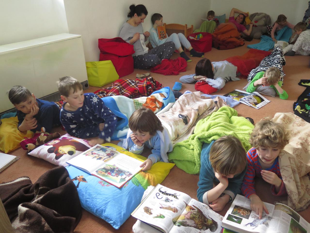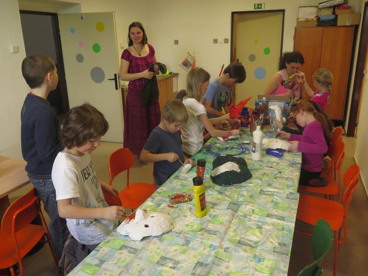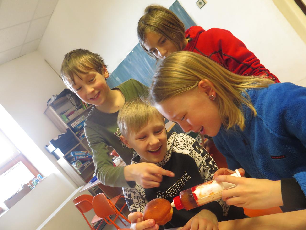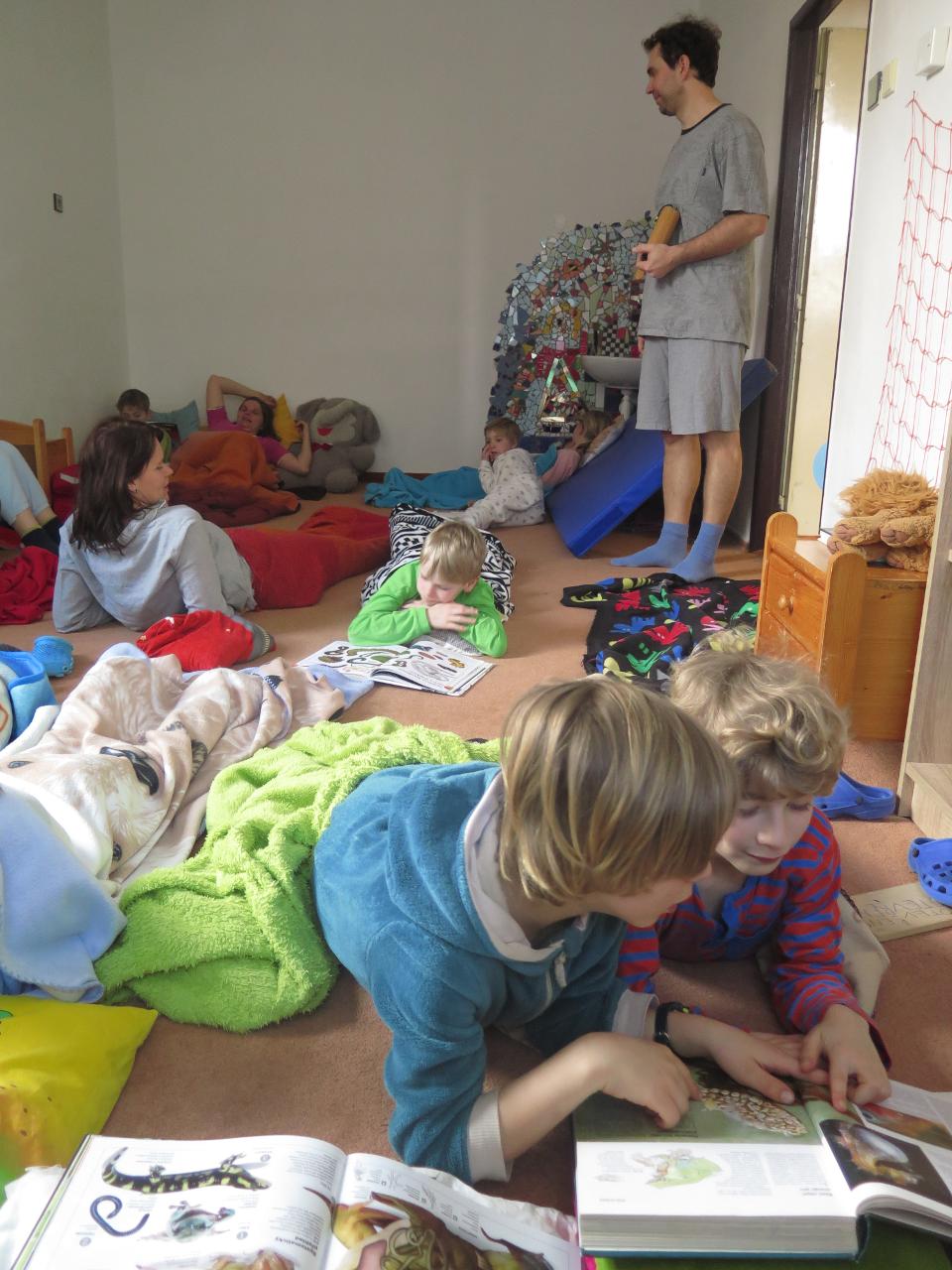 Začátkem března, v úterý 5.3. nás čekala masopustní veselice, na kterou jsme se i ve škole v pondělí a v úterý ještě připravovali. Školáci si dobarvovali masky, společně jsme pak pekli kváskový chléb, plnili maximravenci usmažené koblihy a připravovali taneční a hudební doprovod. V úterý odpoledne pak masopustní radost vypukla. Od mraveniště se vydal průvod vesnicí a jeho součástí byly postavy známé i neznámé.. medvěd, liška, bandita, kobyla, včelky a také radost nebo lesní tvorové. Po setkání s částí místních obyvatel jsme roztančili školní jídelnu a dali si k tomu spoustu dobrot - a pak přišel PŮST. Další část týdne jsme se již začali věnovat zimním sportům. V pátek se školákům plnilo další přání z nápadníčku a tak jsme mohli všichni společně zažít pyžamový den. Hned ráno jsme se převlékli do pyžama a celý den jsme se učili v tomto pro školu velmi netypickém oblečení :-) V rámci příprav na zimní výjezd jsme četli pohádku o Raškovi, kreslili jsme, jaké zimní sporty známe a poznávali jsme ty, které neznáme. Pouštěli jsme si ukázky sportů olympijských i jsme si četli svou oblíbenou knížku. Také pokračovalo nahrávání Markoušovického (mravenčího) rozhlasu moderátory Máťou a Šímou, kteří si odnesli velmi silnou motivaci k tvorbě přímo z hradeckého rozhlasu.