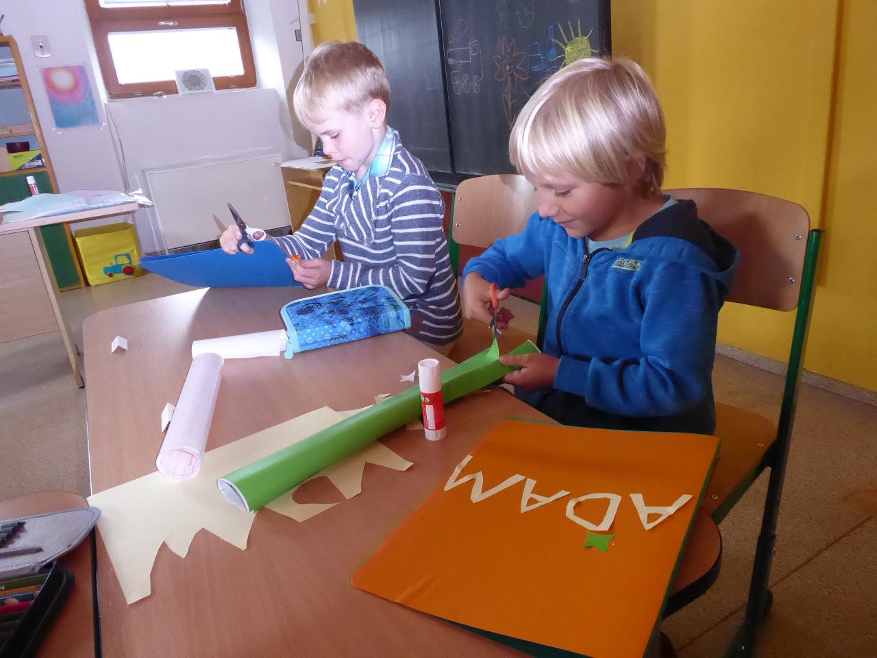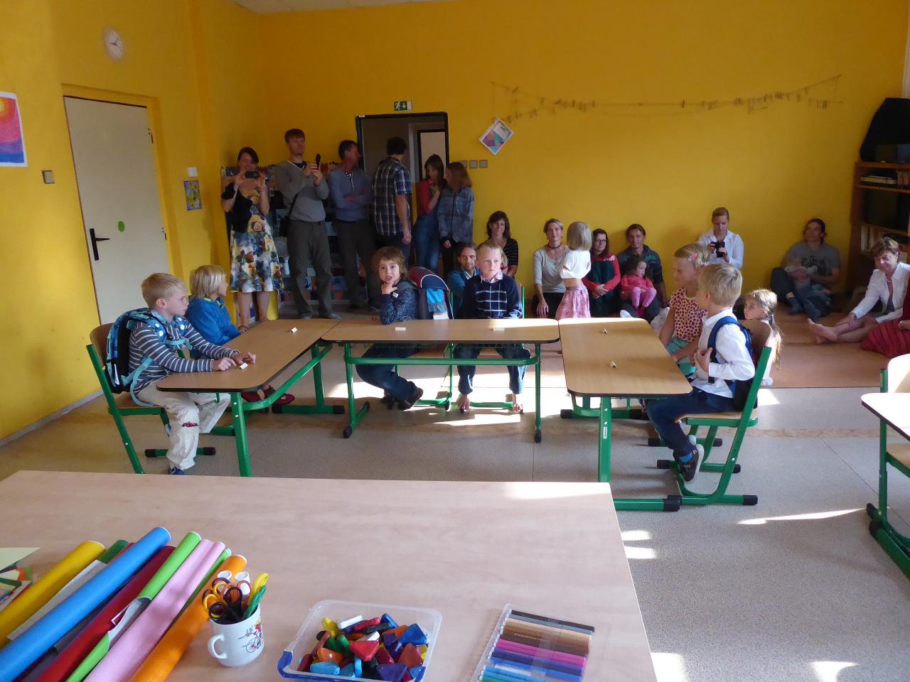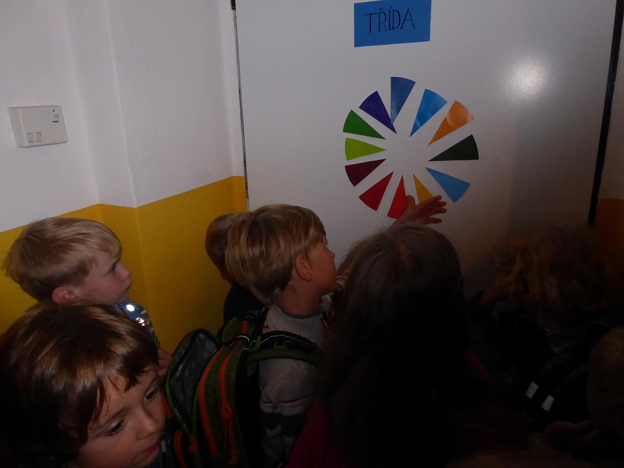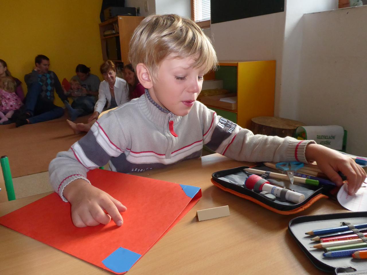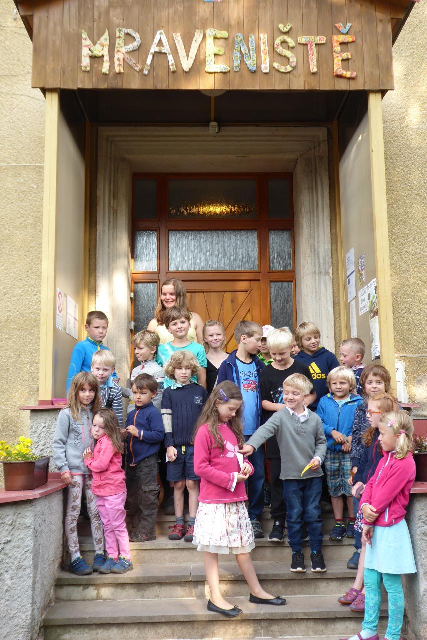 Nejdřív venku u ohniště přivítáním mravenčí písničkou, pak hledáním dílků společných kruhů rozesetých po hřišti, a nakonec po cestě vzhůru schodištěm až ke své třídě si každý našel svoje místo. Také jsme si ozdobili desky a slavnostní den pak uzavřeli společným kruhem i s rodiči se vzájemným sdílením zážitků.A co nás čeká do konce týdne? O tom zase třeba někdy příště...