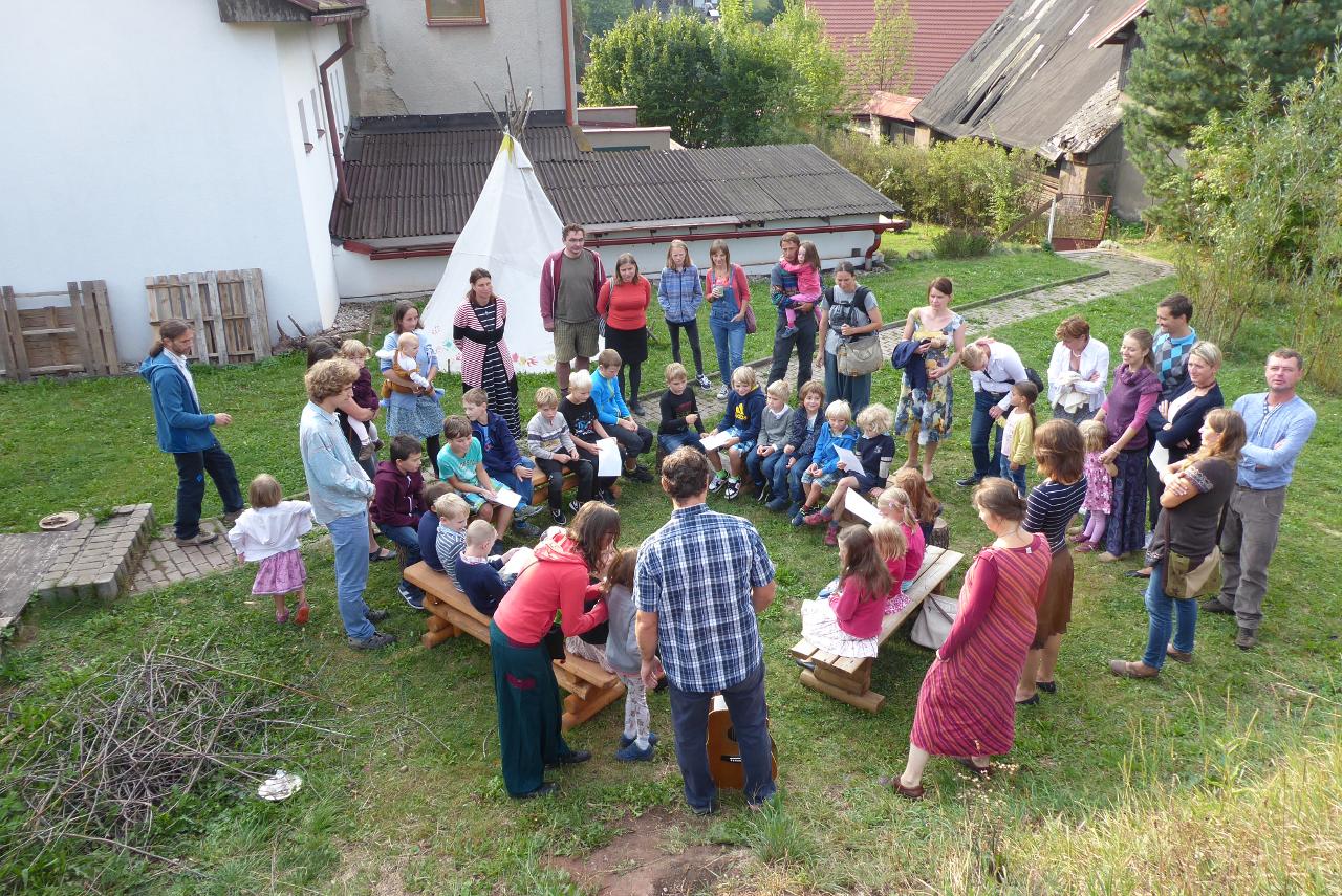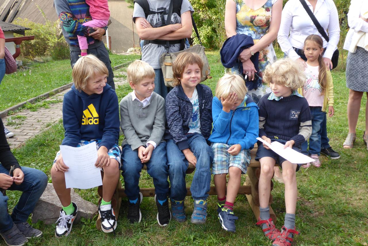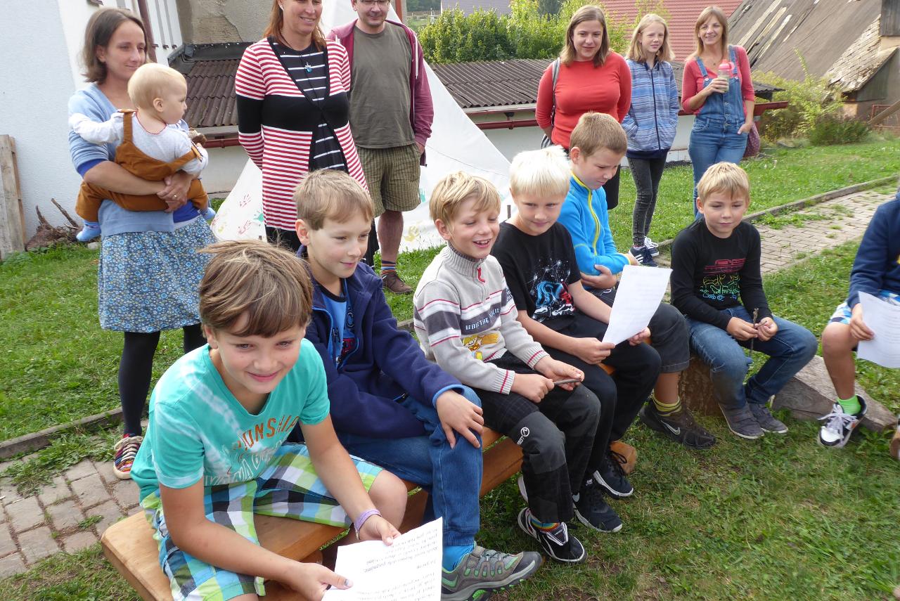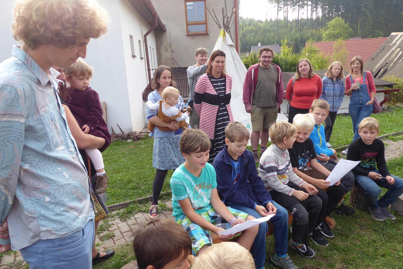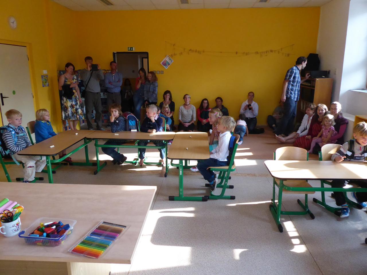 Nejdřív venku u ohniště přivítáním mravenčí písničkou, pak hledáním dílků společných kruhů rozesetých po hřišti, a nakonec po cestě vzhůru schodištěm až ke své třídě si každý našel svoje místo. Také jsme si ozdobili desky a slavnostní den pak uzavřeli společným kruhem i s rodiči se vzájemným sdílením zážitků.A co nás čeká do konce týdne? O tom zase třeba někdy příště...