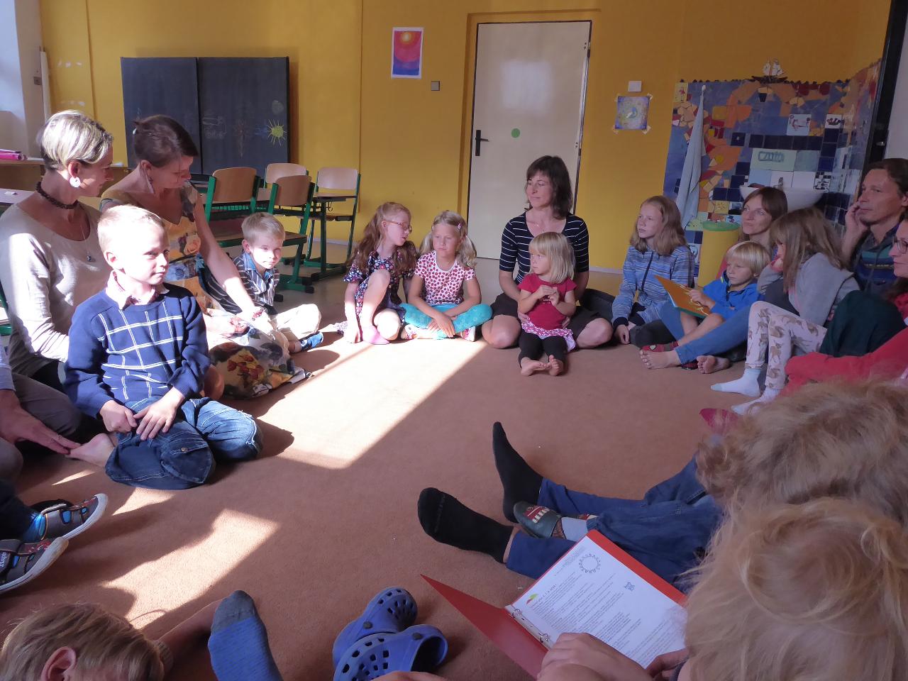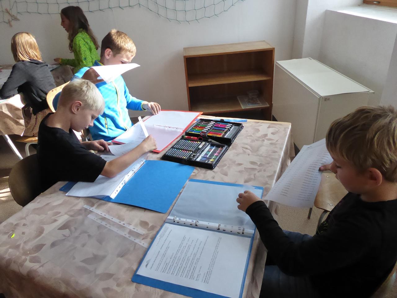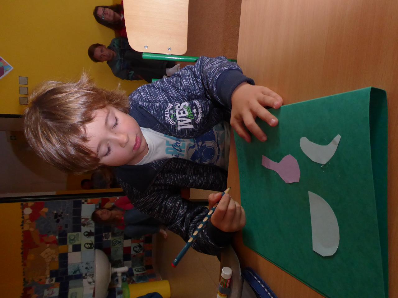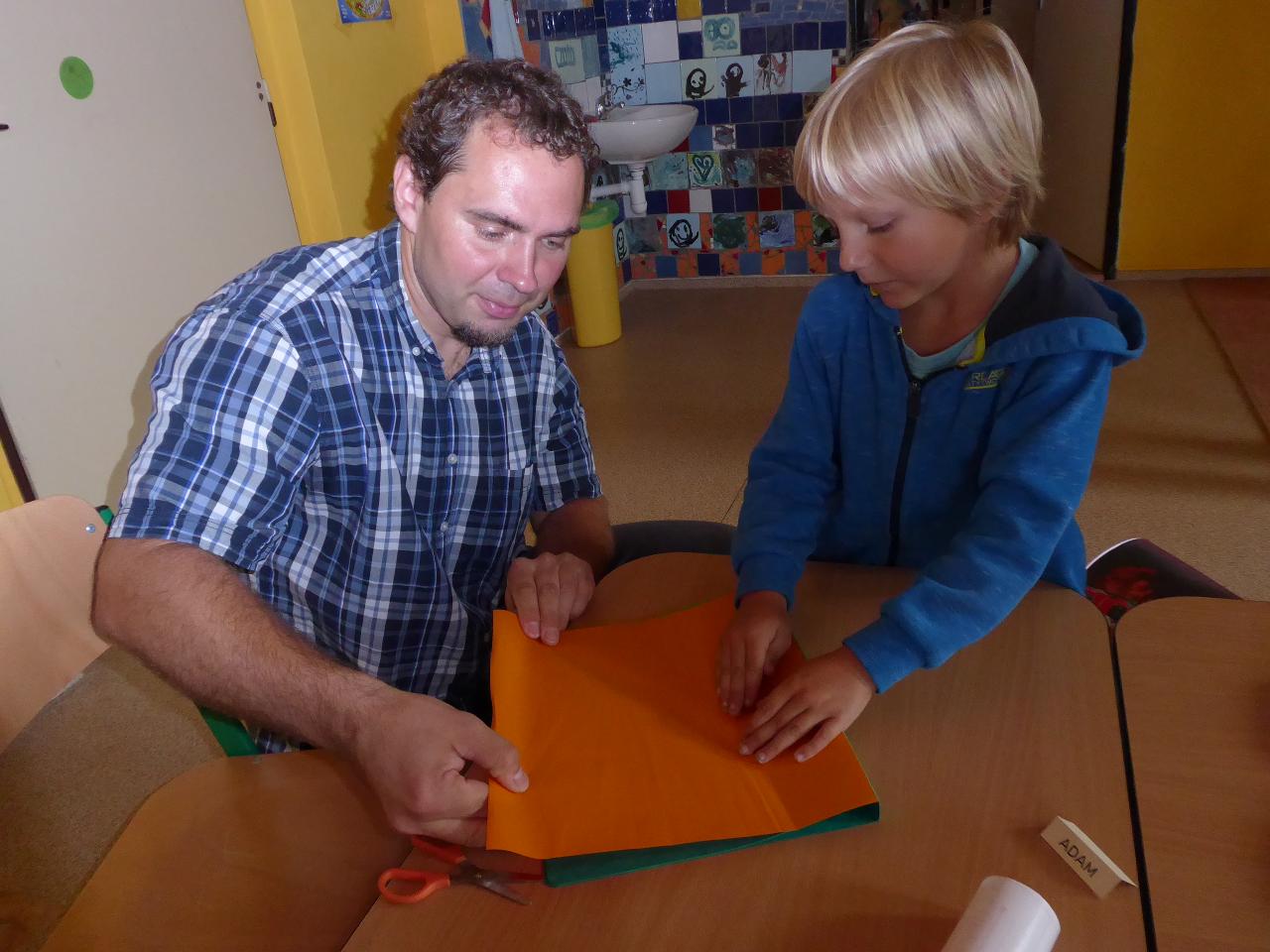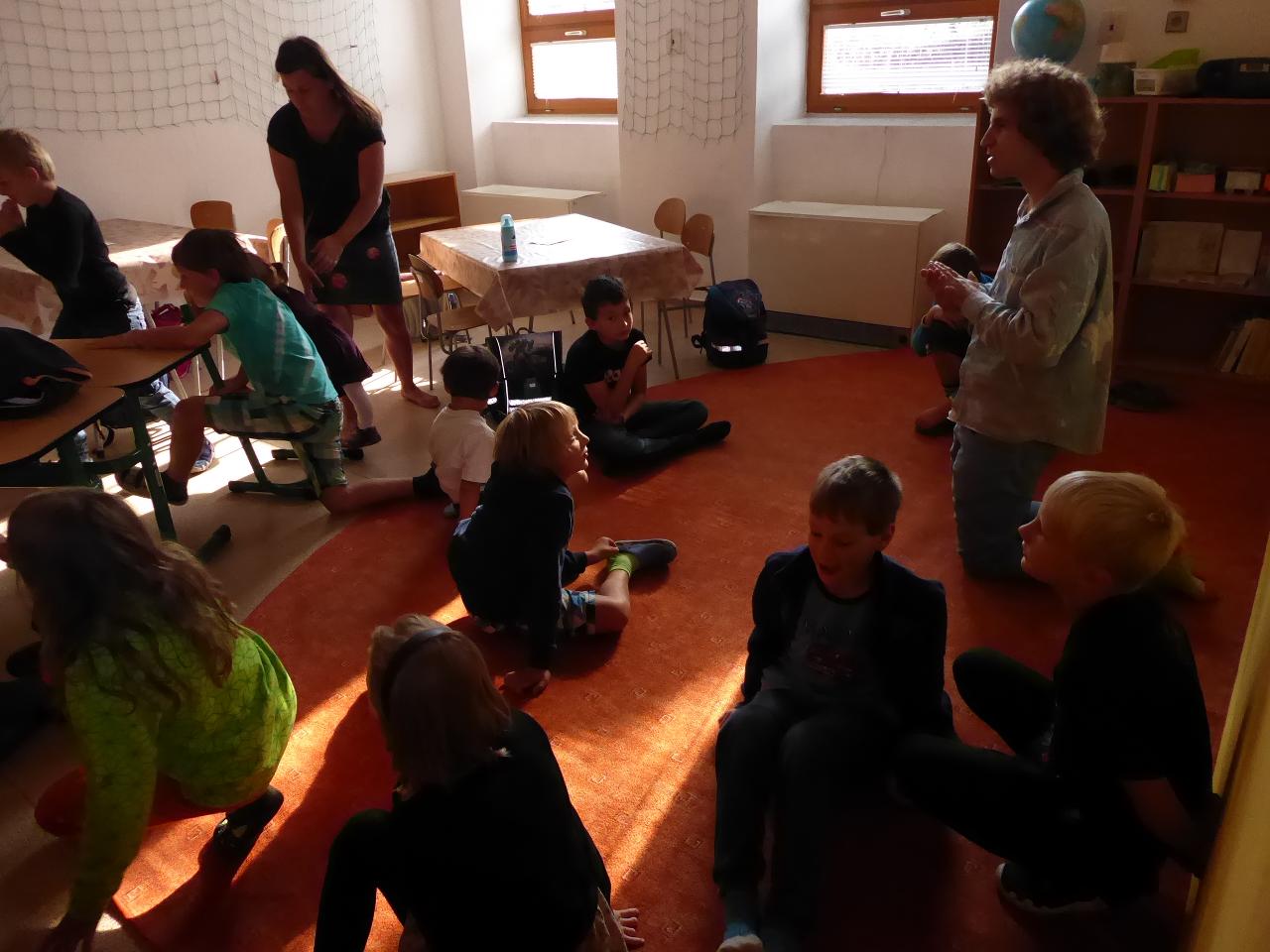 Nejdřív venku u ohniště přivítáním mravenčí písničkou, pak hledáním dílků společných kruhů rozesetých po hřišti, a nakonec po cestě vzhůru schodištěm až ke své třídě si každý našel svoje místo. Také jsme si ozdobili desky a slavnostní den pak uzavřeli společným kruhem i s rodiči se vzájemným sdílením zážitků.A co nás čeká do konce týdne? O tom zase třeba někdy příště...