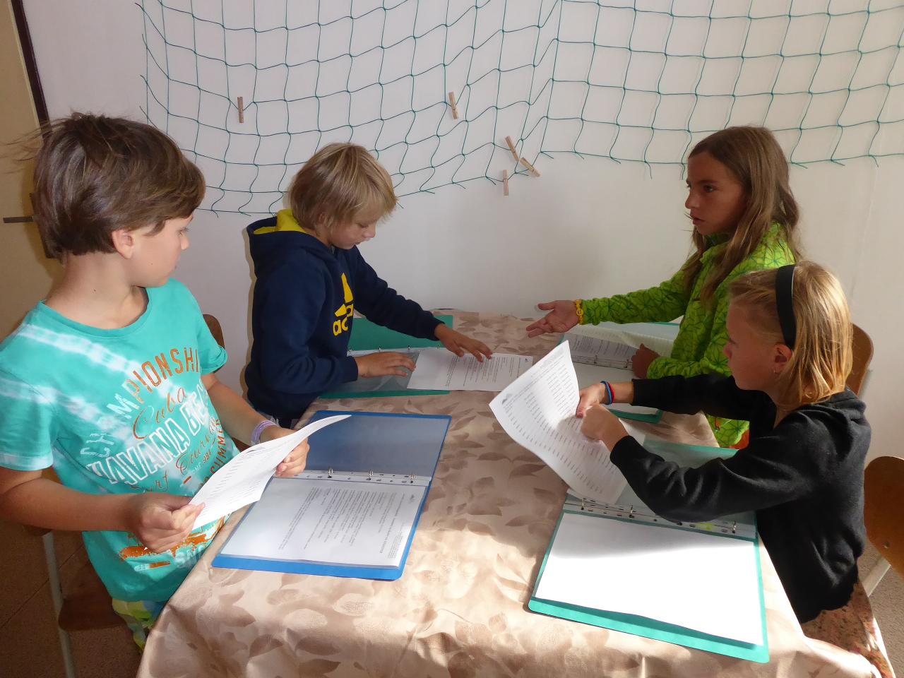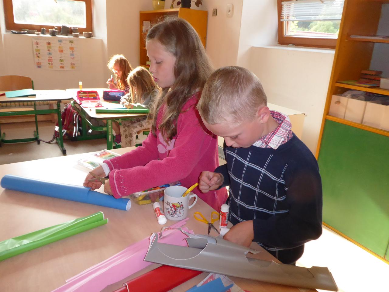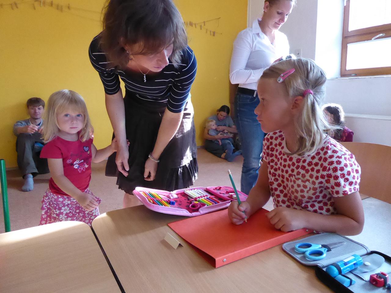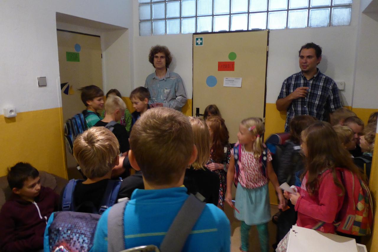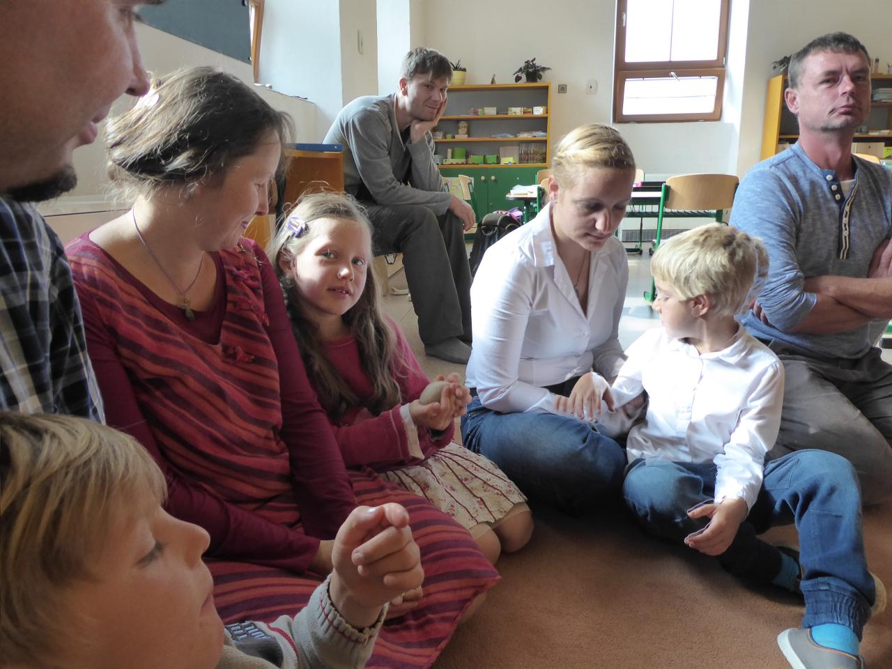 Nejdřív venku u ohniště přivítáním mravenčí písničkou, pak hledáním dílků společných kruhů rozesetých po hřišti, a nakonec po cestě vzhůru schodištěm až ke své třídě si každý našel svoje místo. Také jsme si ozdobili desky a slavnostní den pak uzavřeli společným kruhem i s rodiči se vzájemným sdílením zážitků.A co nás čeká do konce týdne? O tom zase třeba někdy příště...