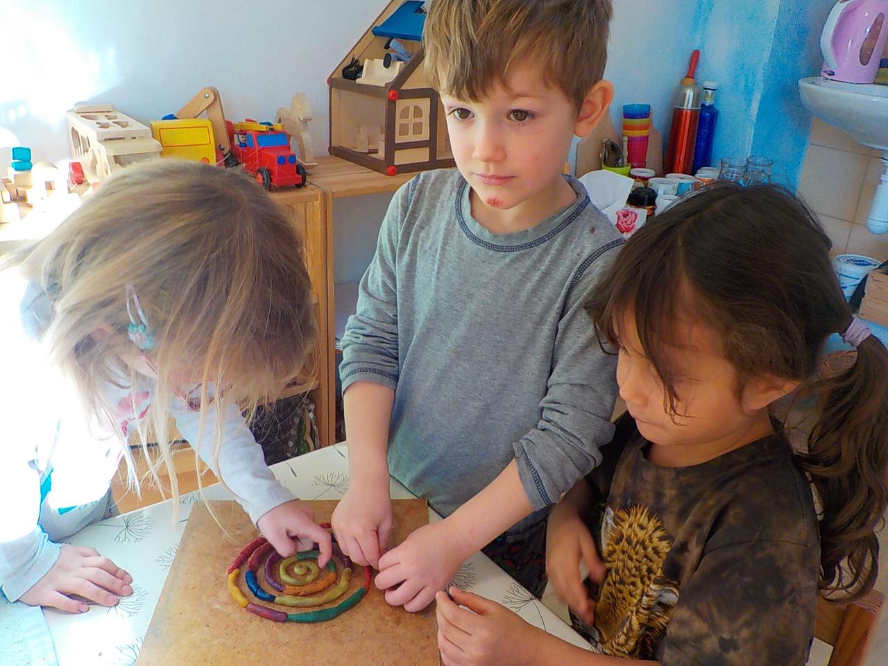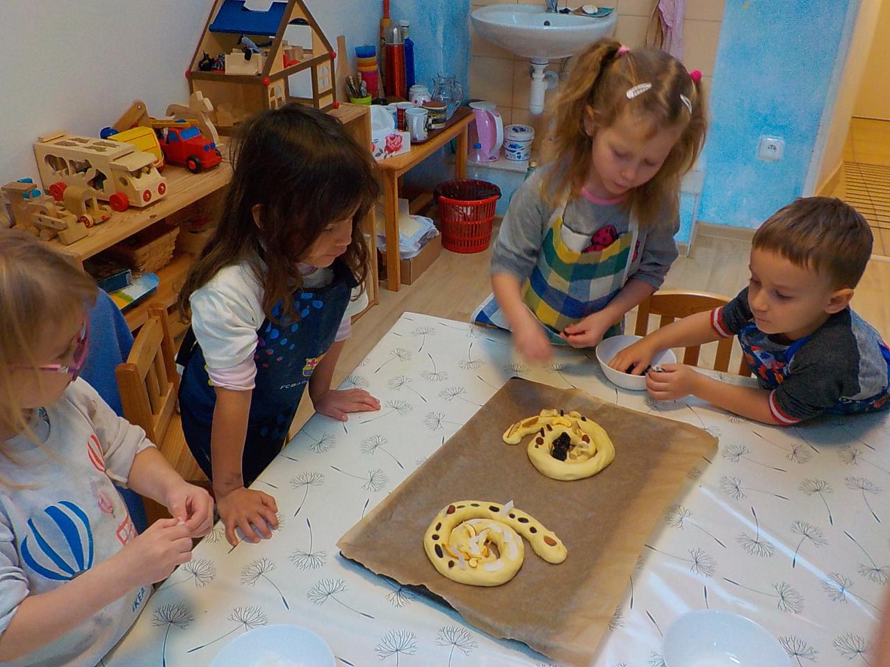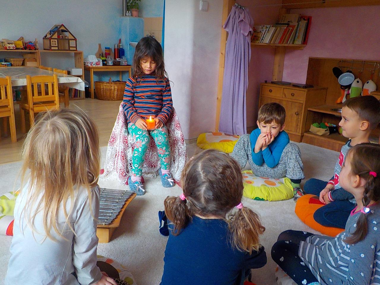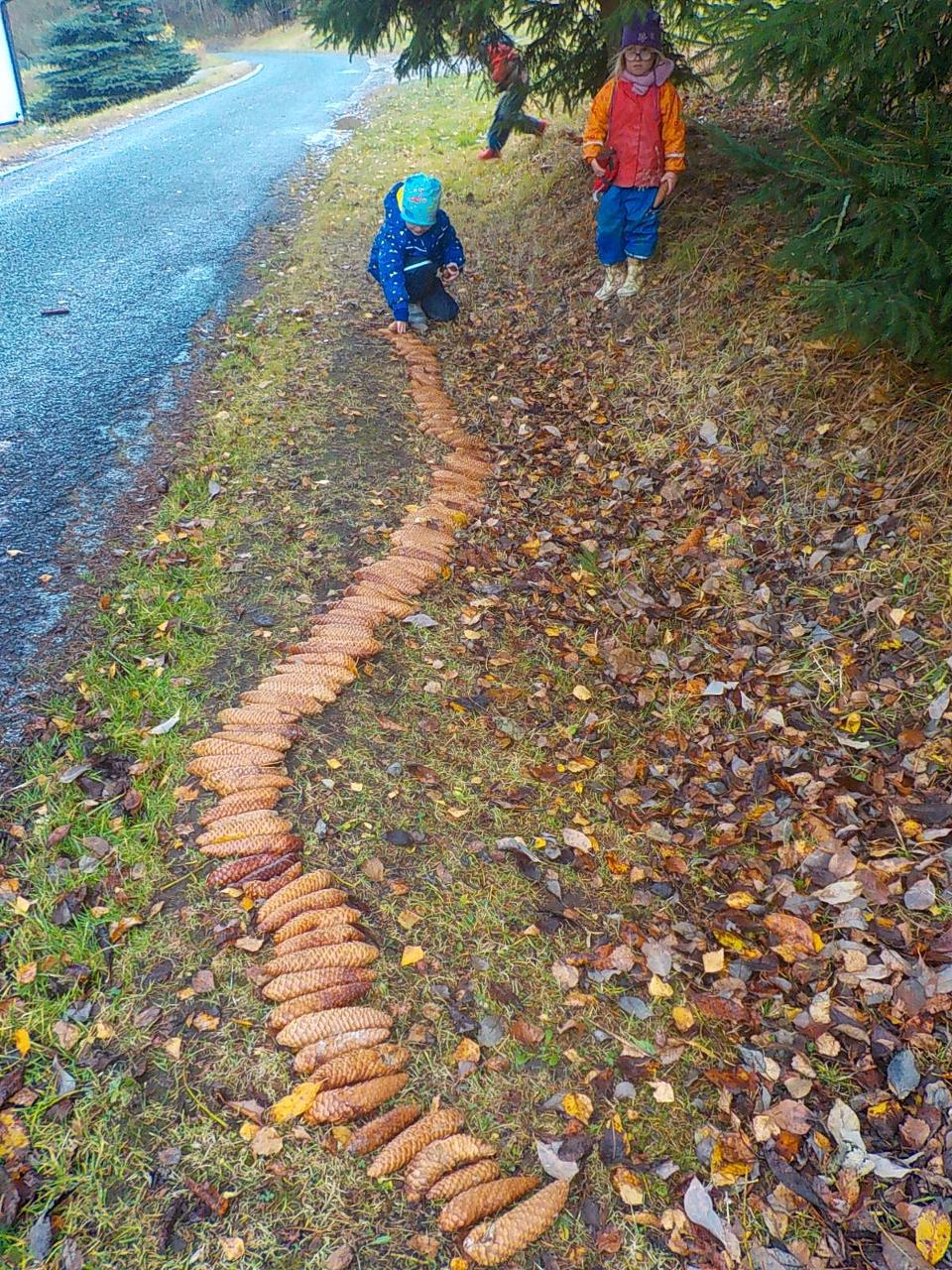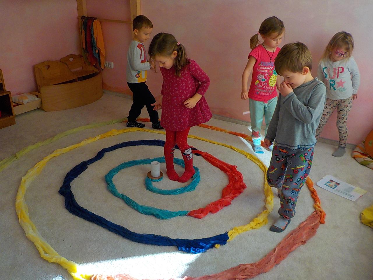 Začátek týdne začal velkolepě - je tu oslava dalších narozenin - veliká slavnost! A konec patřil slavnosti také - tentokrát jiné - tiché adventní spirále. Všechny naše aktivity směřovaly k jejímu vyvrcholení a tvar spirály nás provázel téměř každou aktivitou. Malovali jsme ji, modelovaly, skládali z kaštanů, navlékali z korálků, pekli, tvořili na koberci z šátků a procházeli jí. Připomněli jsme si, že každý máme svého anděla strážného a zahráli si hru na "Otce Jakuba" - tak jako v pohádce. Zpívali jsme písně a rozjímali. Ale nejen to, venku jsme pěkně řádili - stromy byly naším domovem, křoví naší džunglí, šišky naší cestou a první led s velkou radostí naší svačinou...