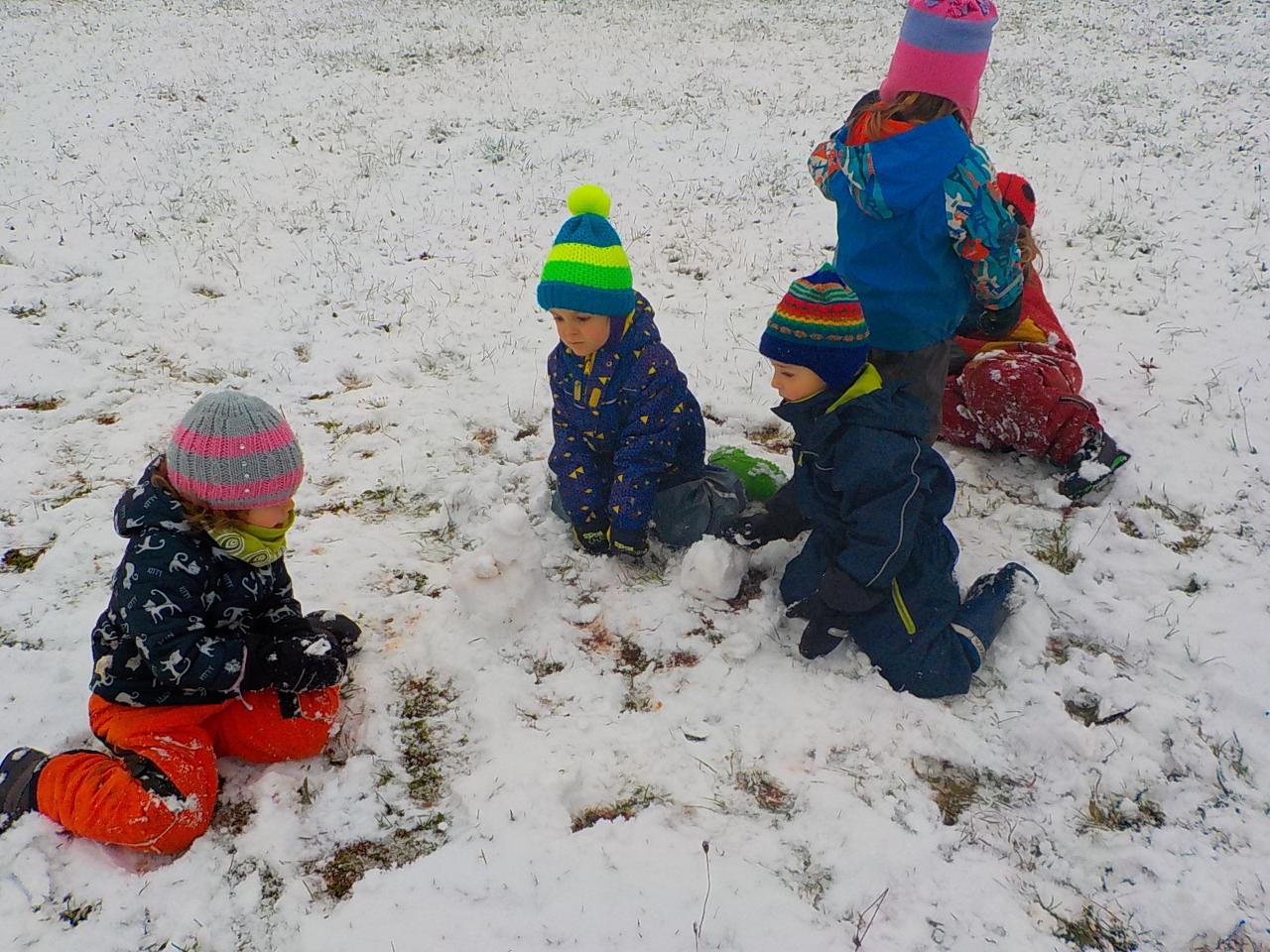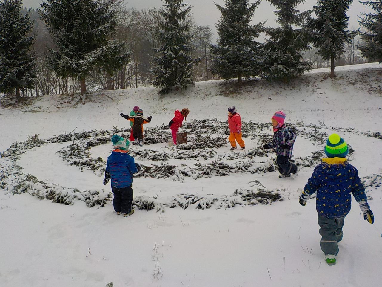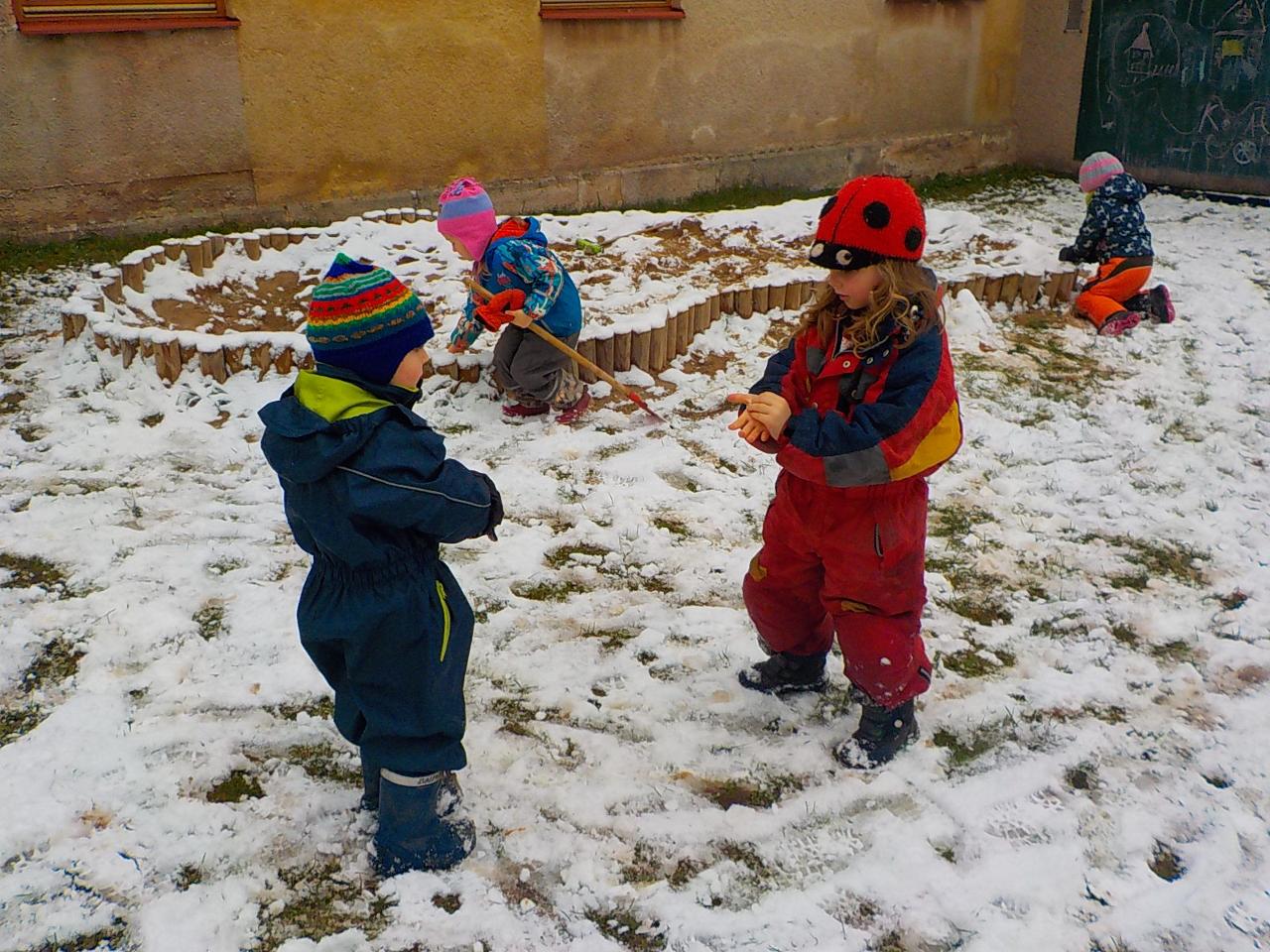 Tento týden byl trochu jiný – rozdělený na dvě části a dvě témata. V budově totiž dva dny probíhala výměna jističe a ve středu nás čekala adventní slavnost - spirála, tentokrát trochu jinak, než jsme zvyklí, nikoli společně a uvnitř, ale v intimitě rodiny a venku, za namodralého sněhu a svitu měsíce. A v druhé polovině týdne nás už čekalo téma nadcházejícího Sv.Mikuláše. Máme radost ze sněhu, je ho pořádně, děláme koule a sněhuláčky, pozorujeme stopy. Oblečení do sněhu a teplé šály a rukavice se opravdu hodí, i když tento týden si na ně teprve zvykáme a zdoláváme různé obtíže s nimi spojené. Vyprávíme si o Sv. Mikuláši obdarovateli, který se svými služebníky připlul od východu, aby podaroval všechny hladové děti z jednoho města.
