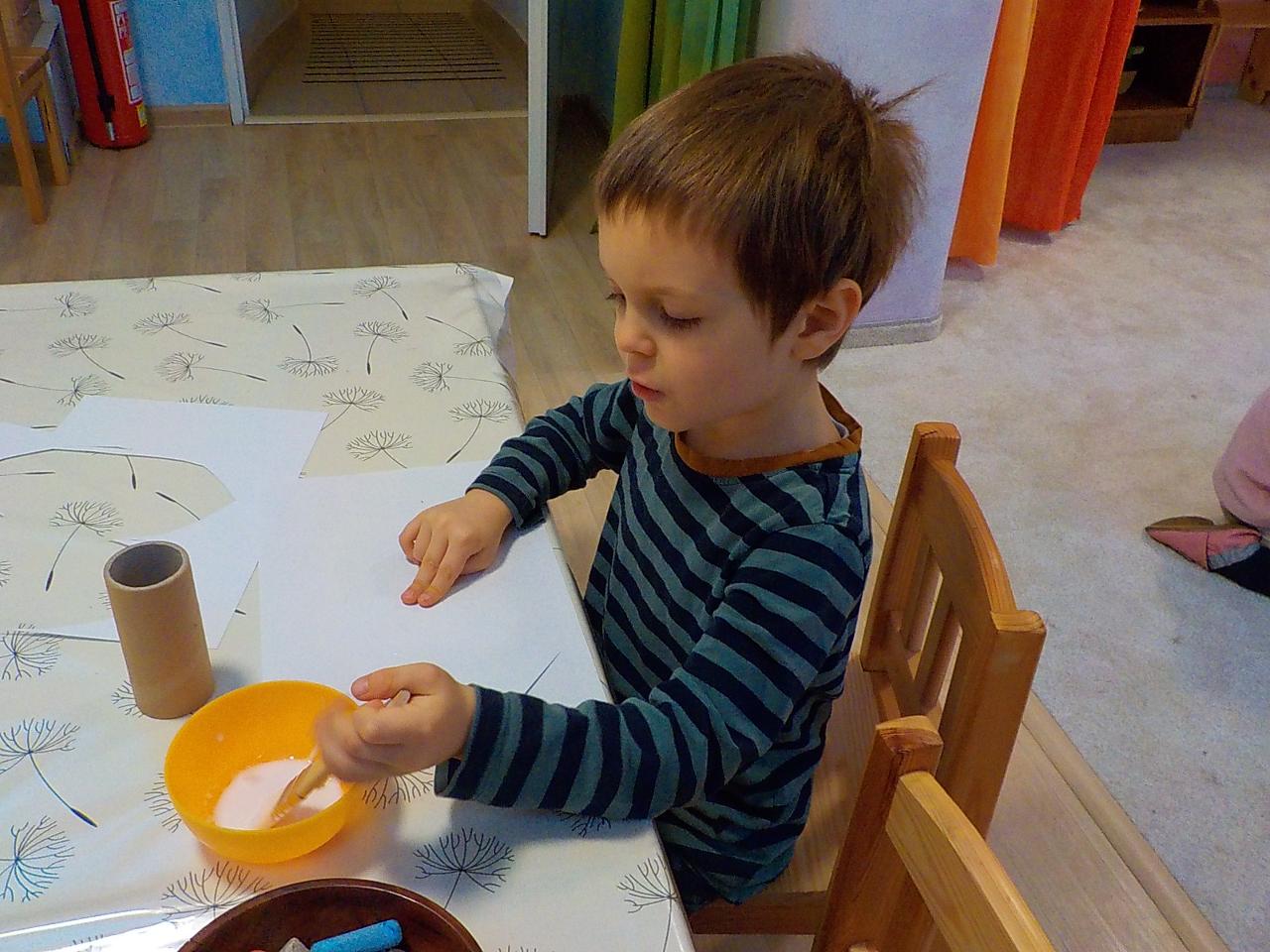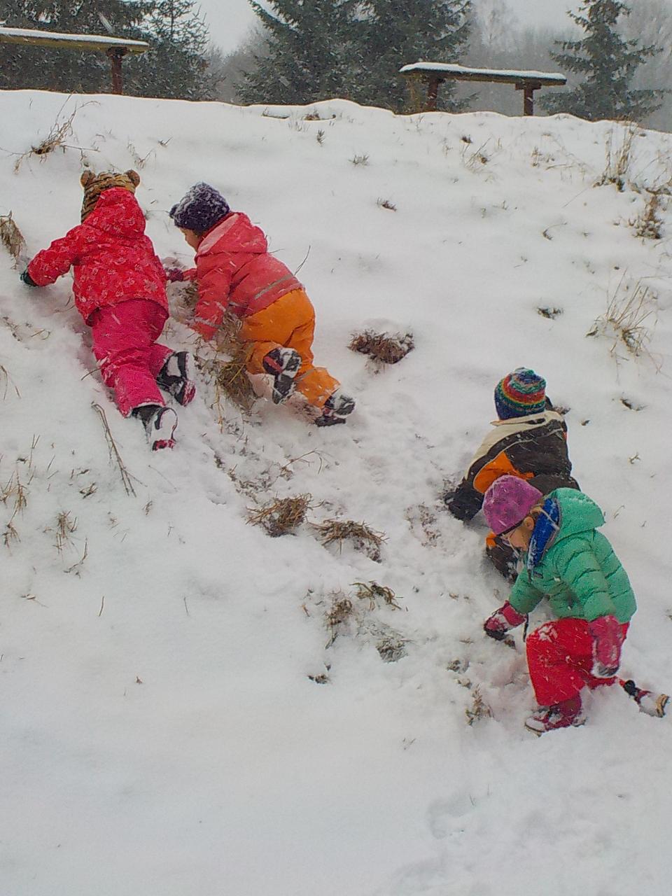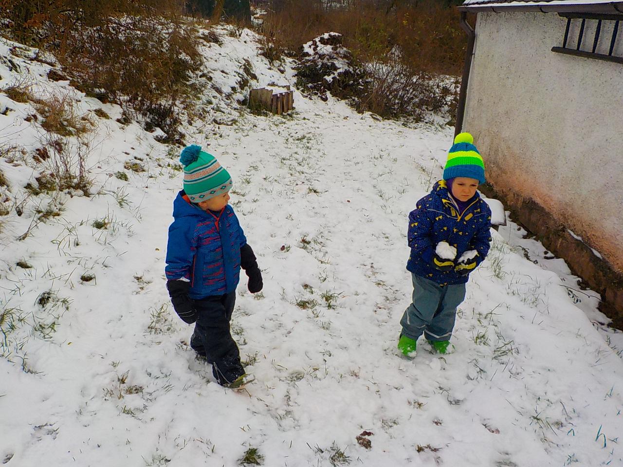 Tento týden byl trochu jiný – rozdělený na dvě části a dvě témata. V budově totiž dva dny probíhala výměna jističe a ve středu nás čekala adventní slavnost - spirála, tentokrát trochu jinak, než jsme zvyklí, nikoli společně a uvnitř, ale v intimitě rodiny a venku, za namodralého sněhu a svitu měsíce. A v druhé polovině týdne nás už čekalo téma nadcházejícího Sv.Mikuláše. Máme radost ze sněhu, je ho pořádně, děláme koule a sněhuláčky, pozorujeme stopy. Oblečení do sněhu a teplé šály a rukavice se opravdu hodí, i když tento týden si na ně teprve zvykáme a zdoláváme různé obtíže s nimi spojené. Vyprávíme si o Sv. Mikuláši obdarovateli, který se svými služebníky připlul od východu, aby podaroval všechny hladové děti z jednoho města.