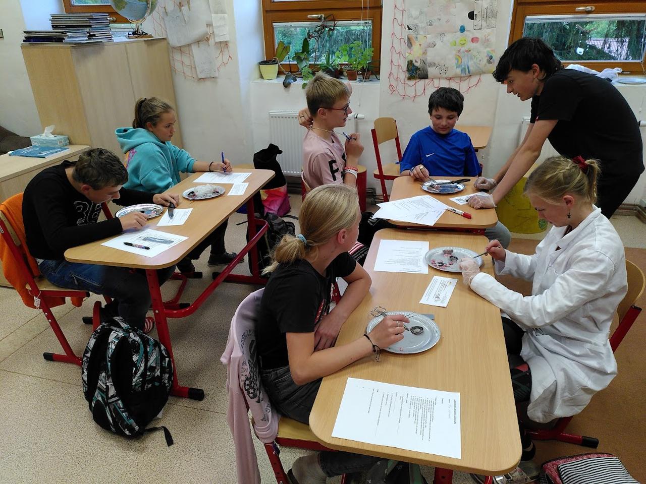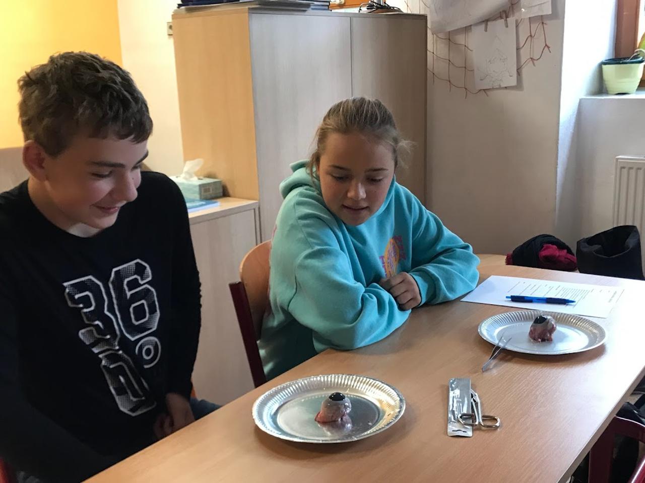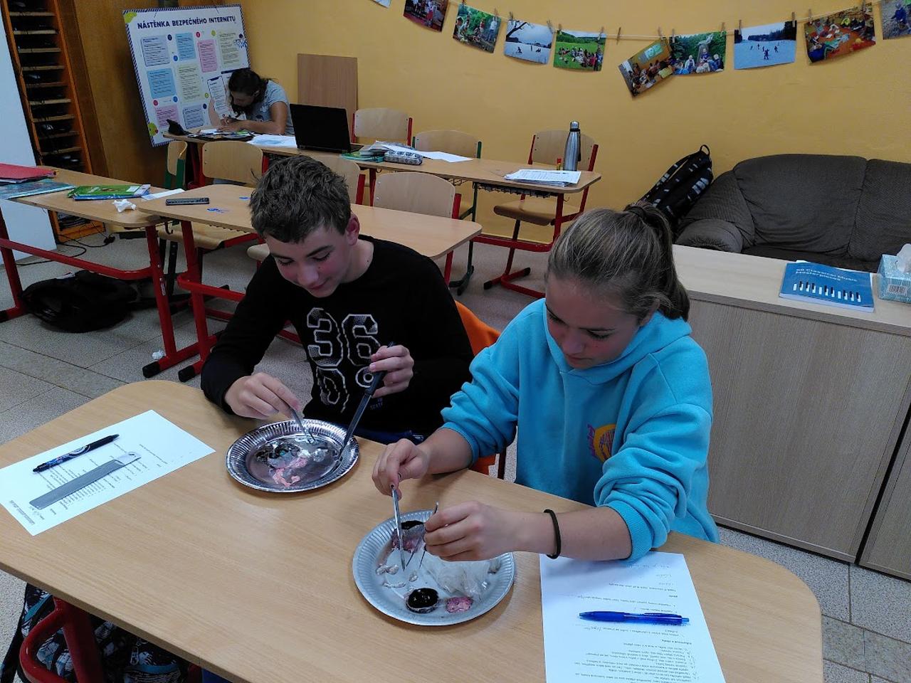 V přírodopise třída VII. a VIII. určovala a oddělovala jednotlivé části kravského oka a tvořila ve skupině papírový model.