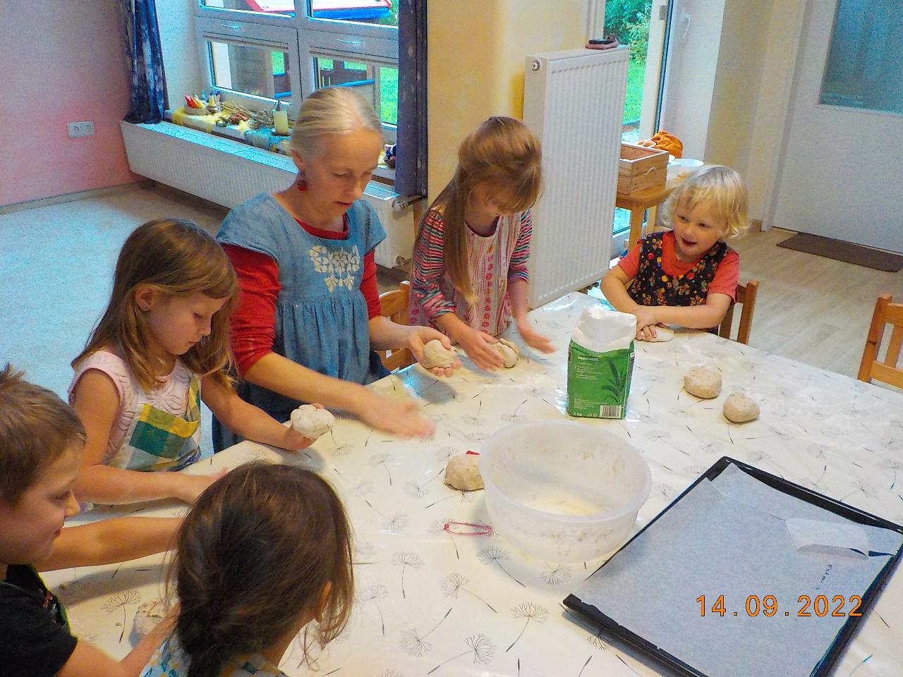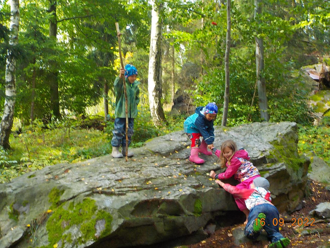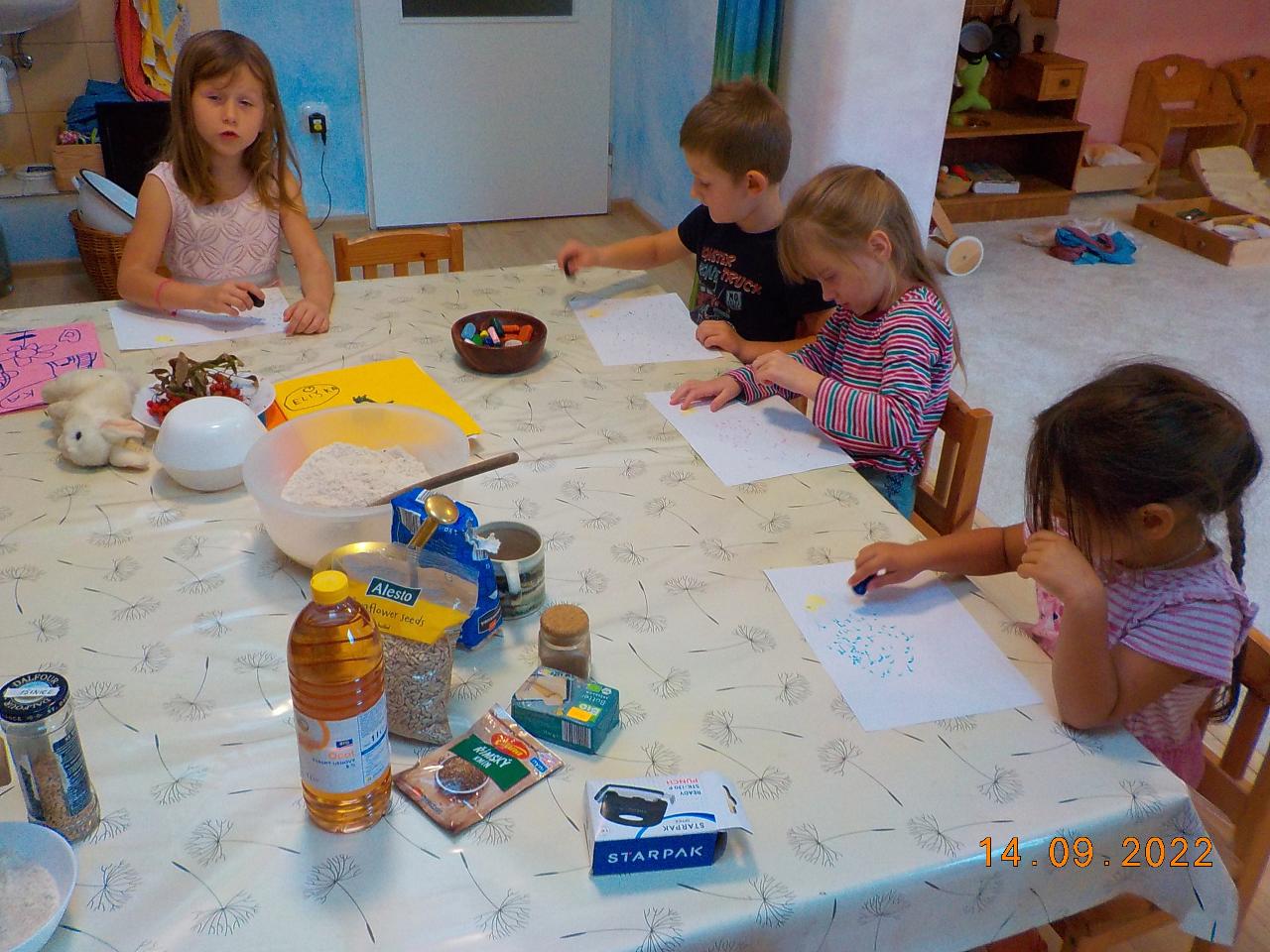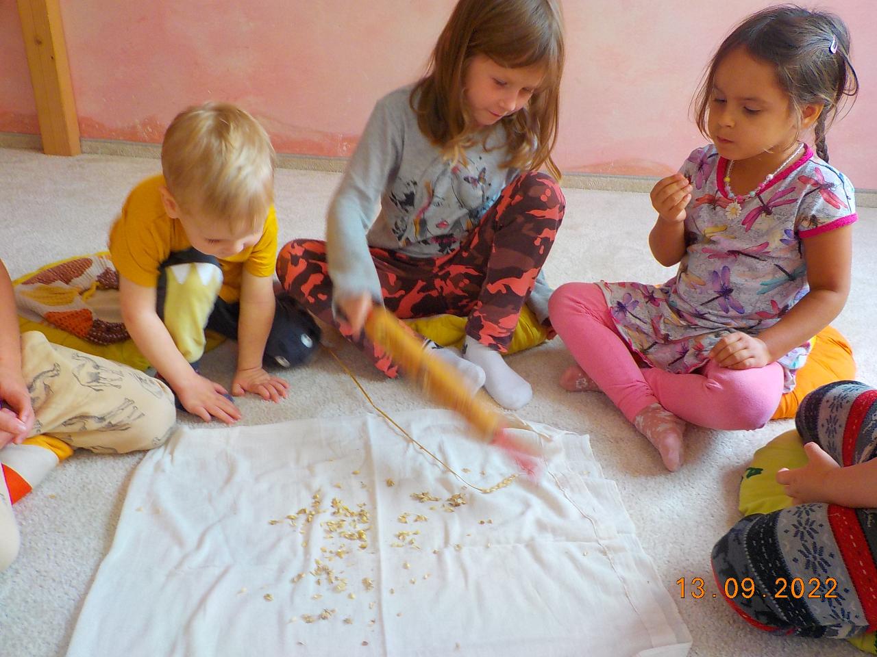 Posledních pár nevymlácených klásků obilí jsme tento týden spracovali. Prožili jsme společně celý proces - od setí obilí až po jeho zpracování (zpívali jsme, tančili, hráli si na sedláčka, mlátili obilí, mleli na mlínku mouku, zadělávali těsto a pochutnávali si na chlebíčku). Za dobře vykonanou práci přišlo chlebíčkové divadýlko - jaké bylo překvapení, když uvnitř bochníku byl domeček pro chlebíčkové dětičky. A krom toho všecho jsme každý den ať svítilo slunko či pršelo běhali po loukách a lesích - hráli jsme si na Šípkovou Růženku, které pomůže jen polibek, nasedali na větve jako na houpačky či koně. Předškoláci trénovali šikovnost svých rukou. A na závěr týdne jsme si společně užili oslavu prvních narozenin. Nebylo tomu jinak - skřítek opět přinesl pro oslavence malý dáreček.