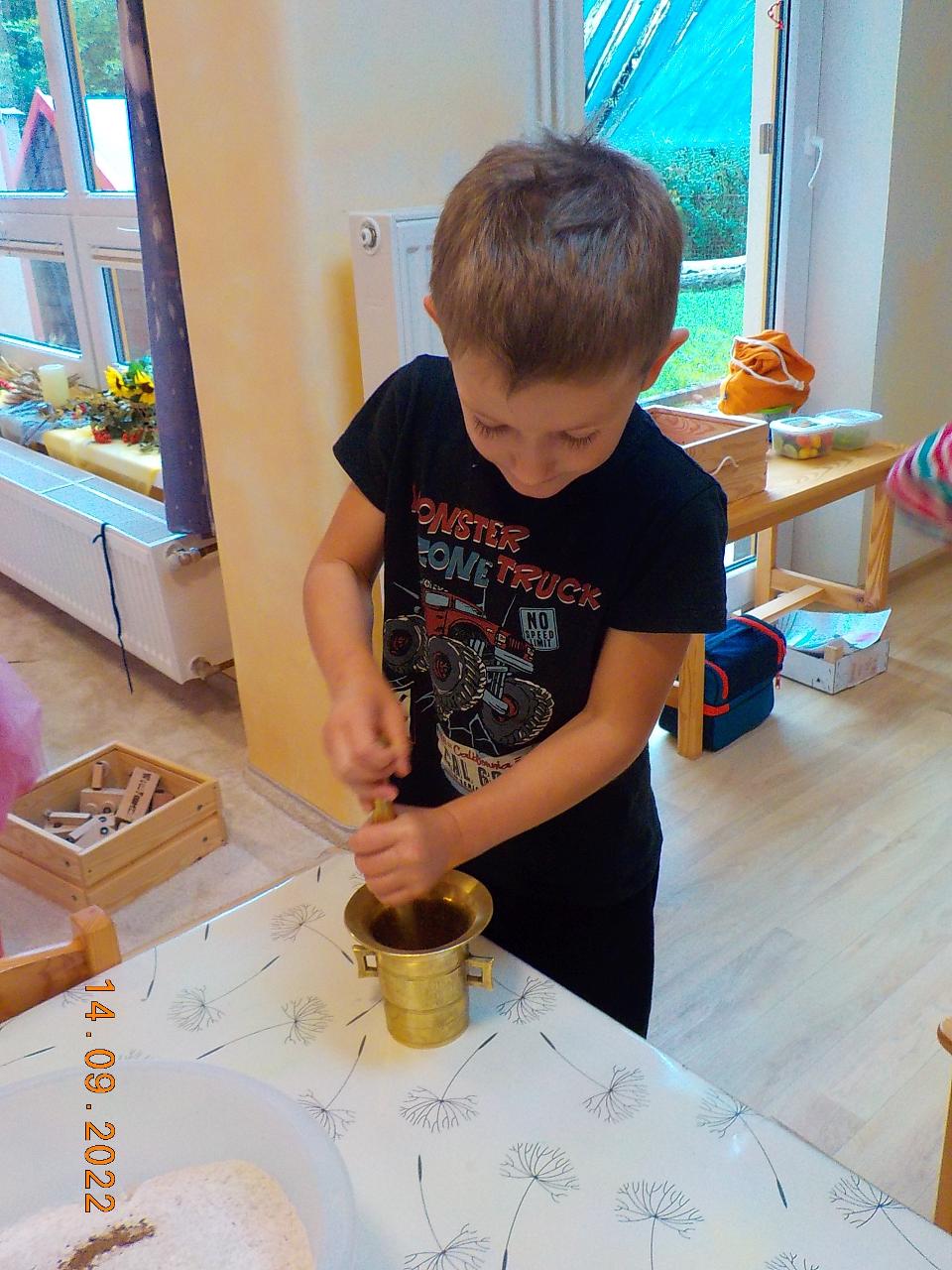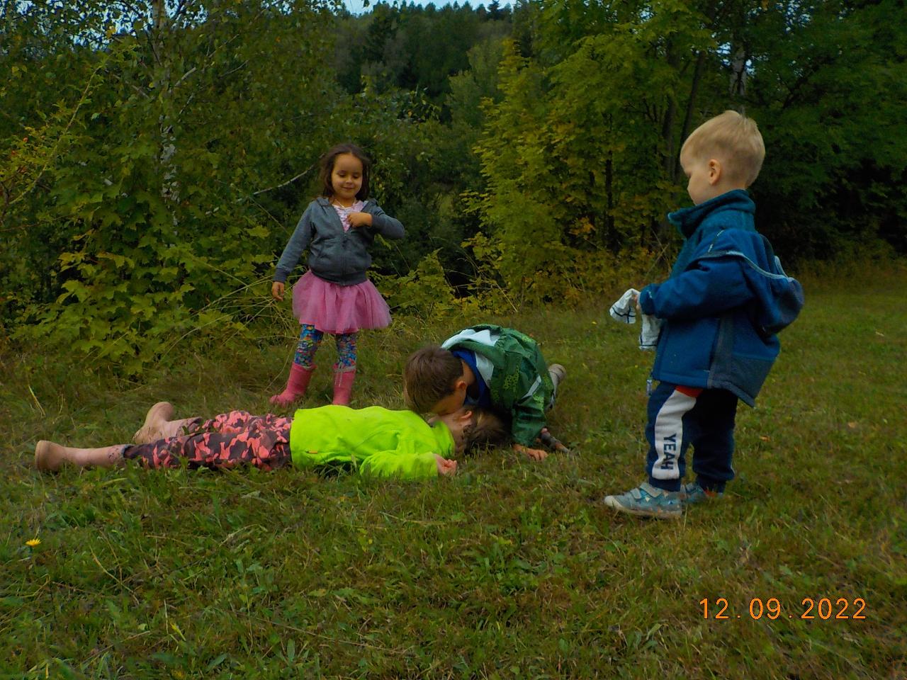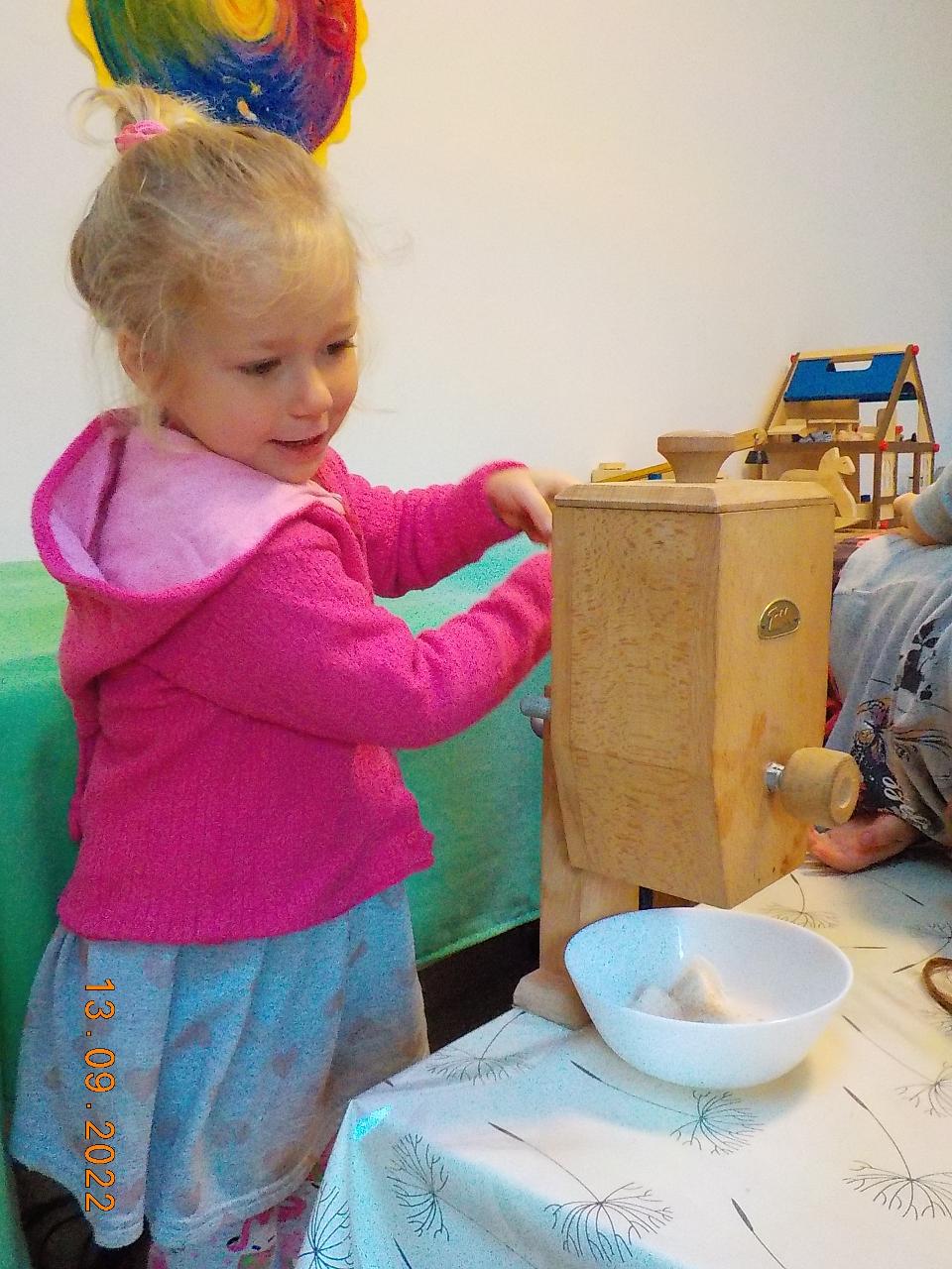 Posledních pár nevymlácených klásků obilí jsme tento týden spracovali. Prožili jsme společně celý proces - od setí obilí až po jeho zpracování (zpívali jsme, tančili, hráli si na sedláčka, mlátili obilí, mleli na mlínku mouku, zadělávali těsto a pochutnávali si na chlebíčku). Za dobře vykonanou práci přišlo chlebíčkové divadýlko - jaké bylo překvapení, když uvnitř bochníku byl domeček pro chlebíčkové dětičky. A krom toho všecho jsme každý den ať svítilo slunko či pršelo běhali po loukách a lesích - hráli jsme si na Šípkovou Růženku, které pomůže jen polibek, nasedali na větve jako na houpačky či koně. Předškoláci trénovali šikovnost svých rukou. A na závěr týdne jsme si společně užili oslavu prvních narozenin. Nebylo tomu jinak - skřítek opět přinesl pro oslavence malý dáreček.