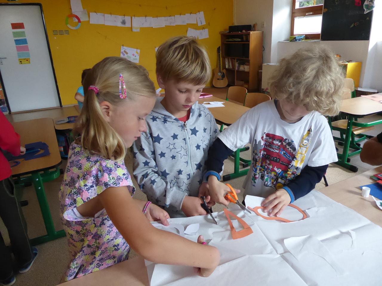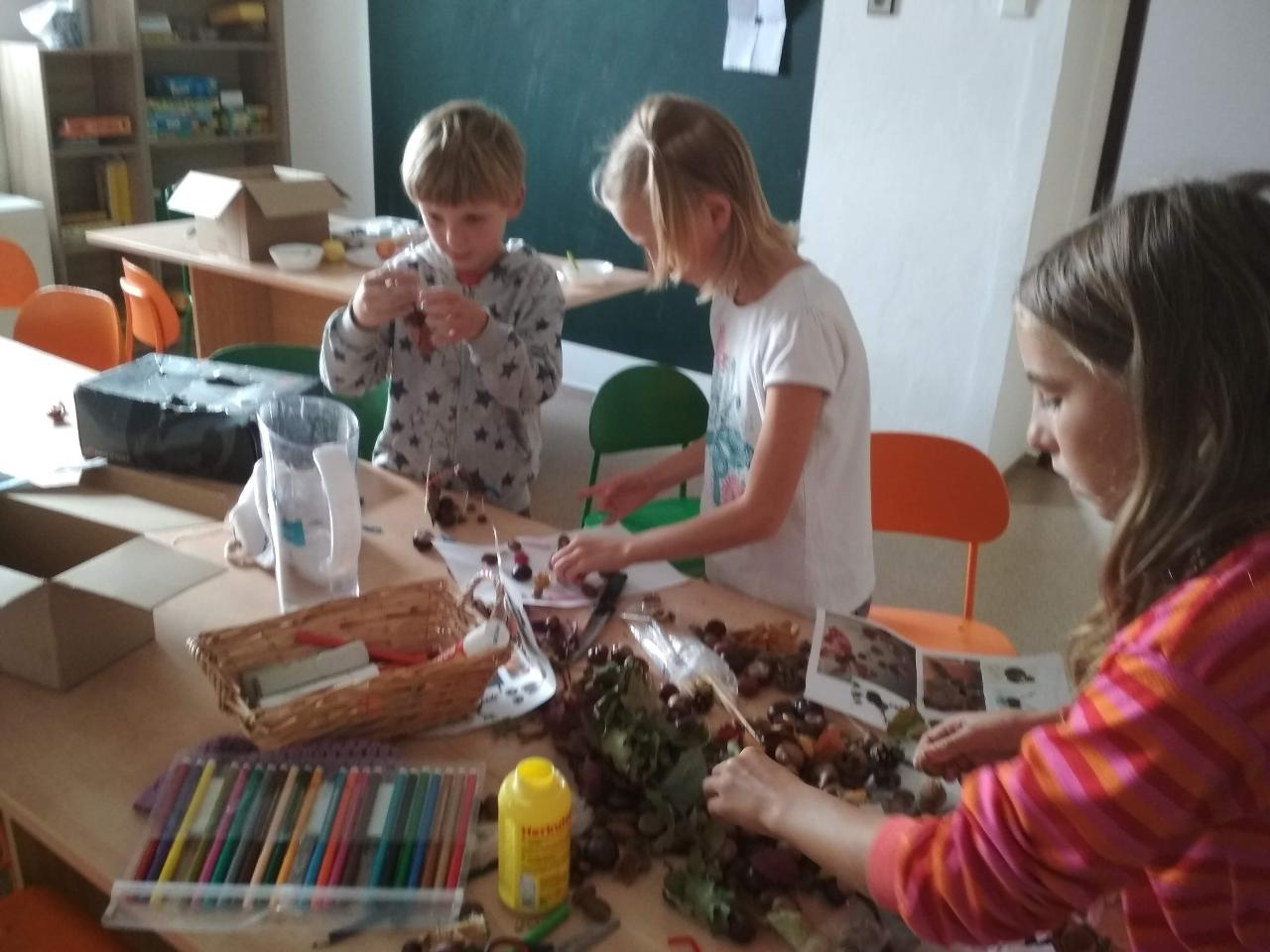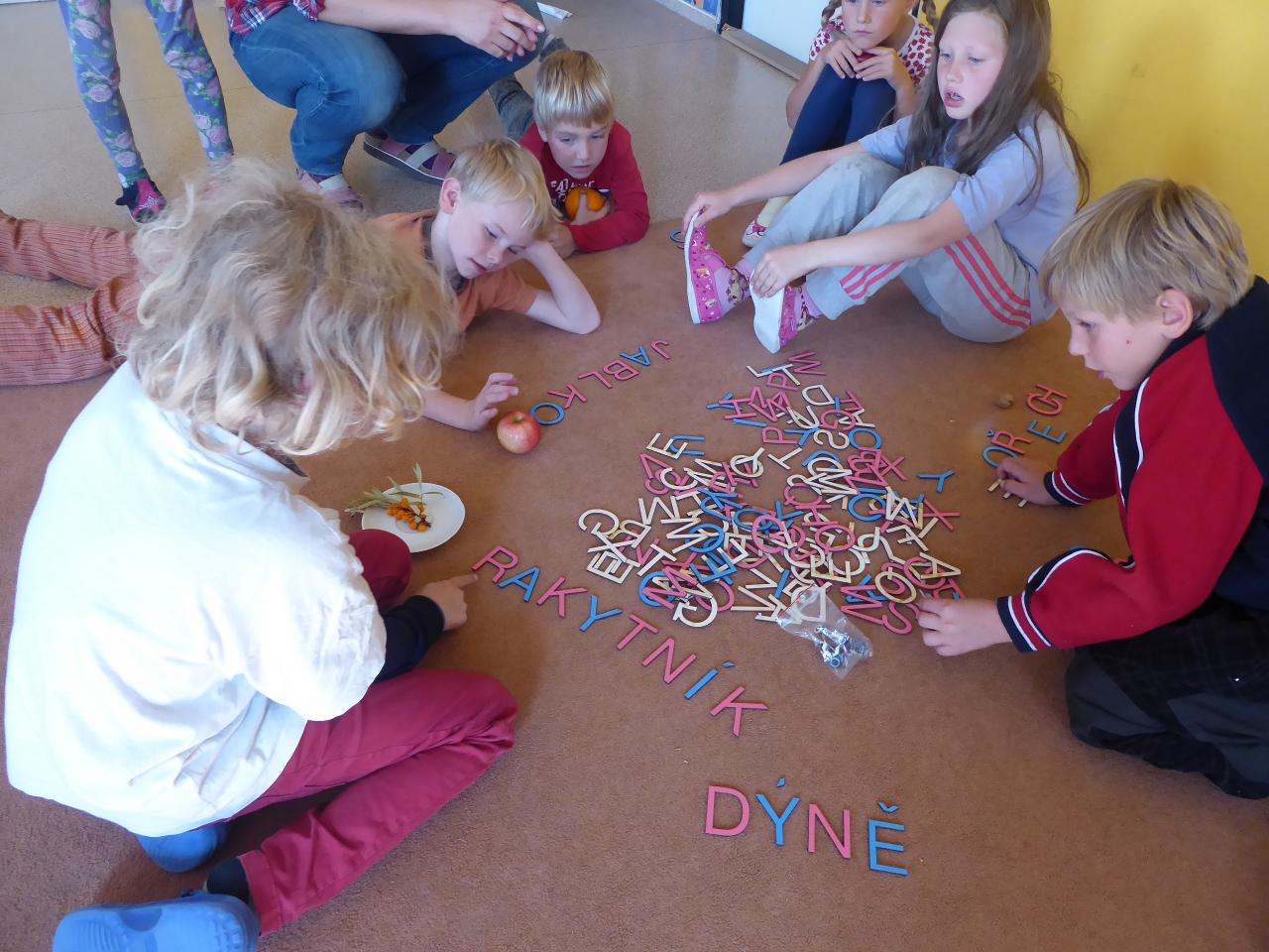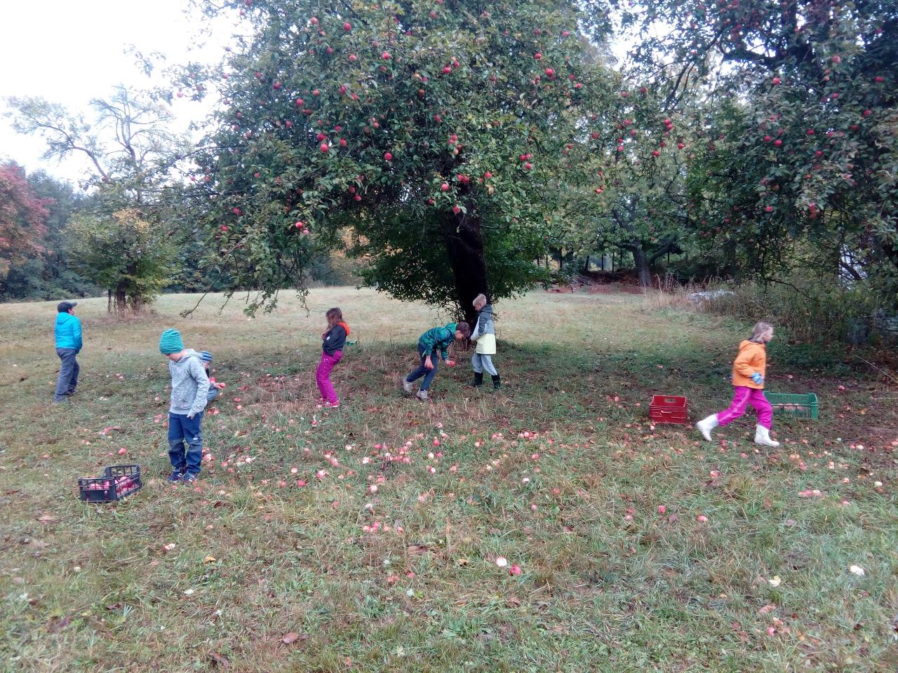 Tento týden jsme děkovali za podzimní úrodu a věnovali se více ovoci a zelenině, která u nás dozrává. Poznávali jsme jednotlivé druhy pomocí hmatu, chuti i očima:) Zaujalo nás i vyprávění maminky Cyrila o původu jabloní, díky kterému jsme se přenesli do Kazachstánu a prohlédli si zajímavé fotky ze života tamějších obyvatel. Ze čtvrtečního venkovního dne jsme si udělali den jablečný:) Ráno jsme nasbírali jablka, napekli štrúdly, pak jsme vyrazili moštovat k tatínkovi Otíka a ve škole jsme ještě malovali podzimními barvami. Celý týden jsme hojně tvořili různá stvoření a bytosti z donesených přírodnin. Nezapomněli jsme také pokročit v češtině, angličtině a matematice. Rádi také zpíváme a hrajeme na hudební nástroje.