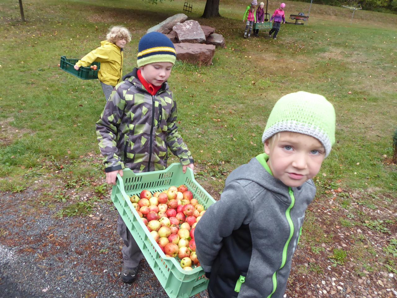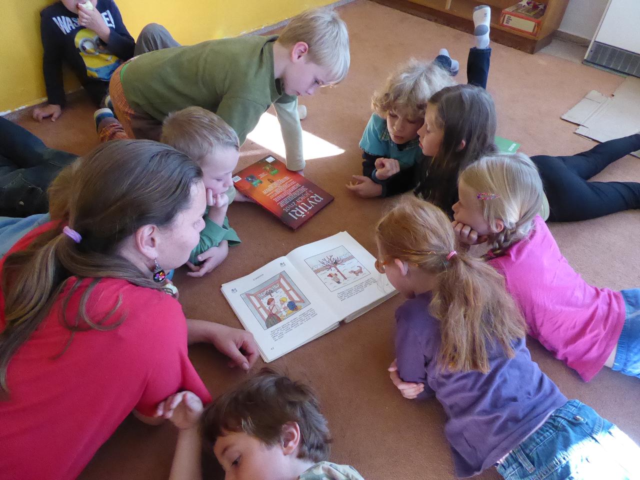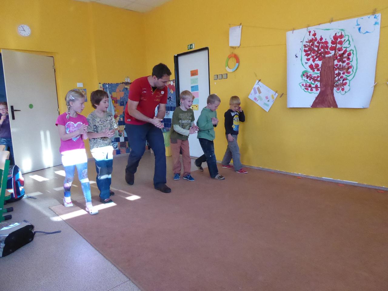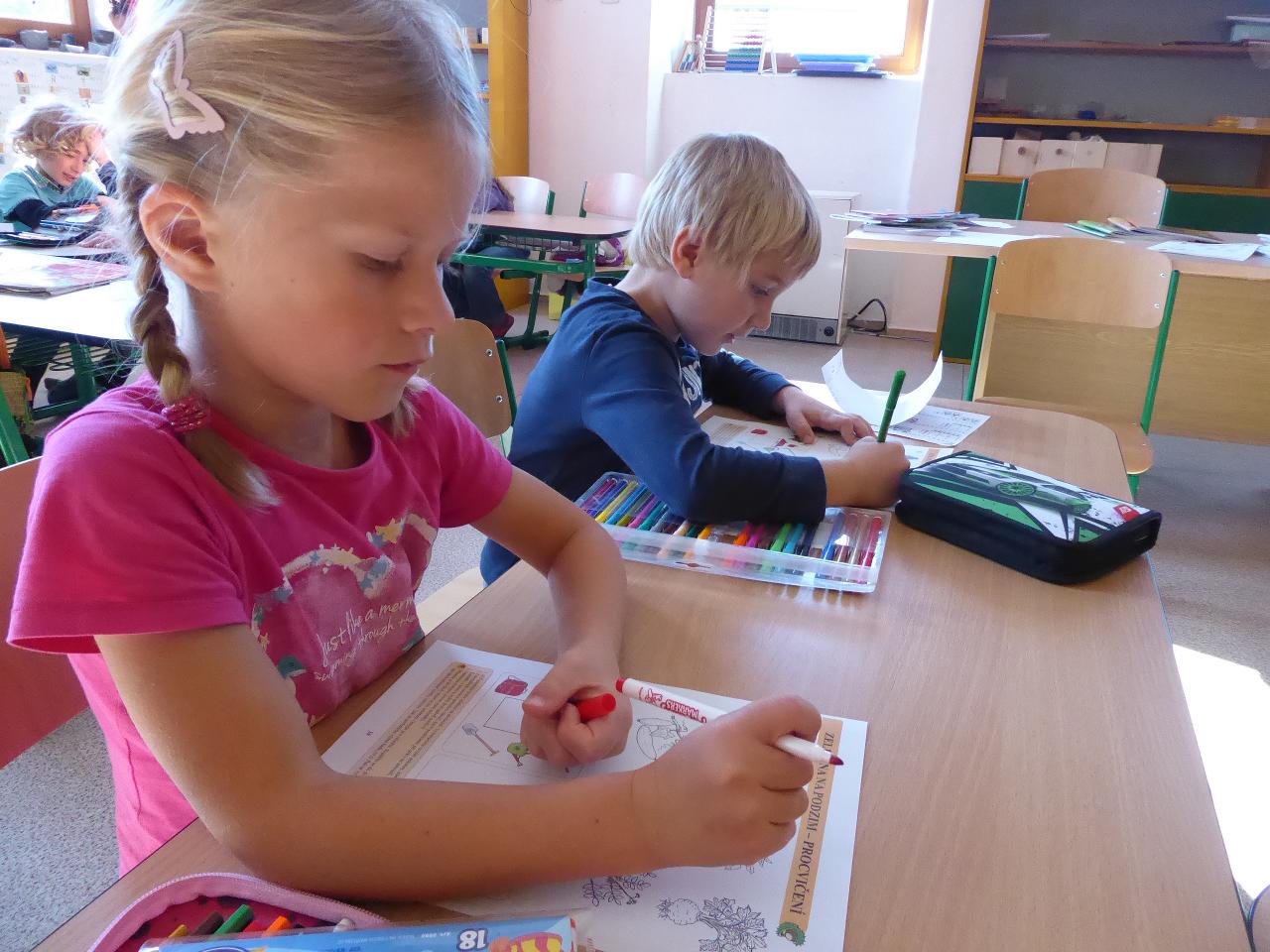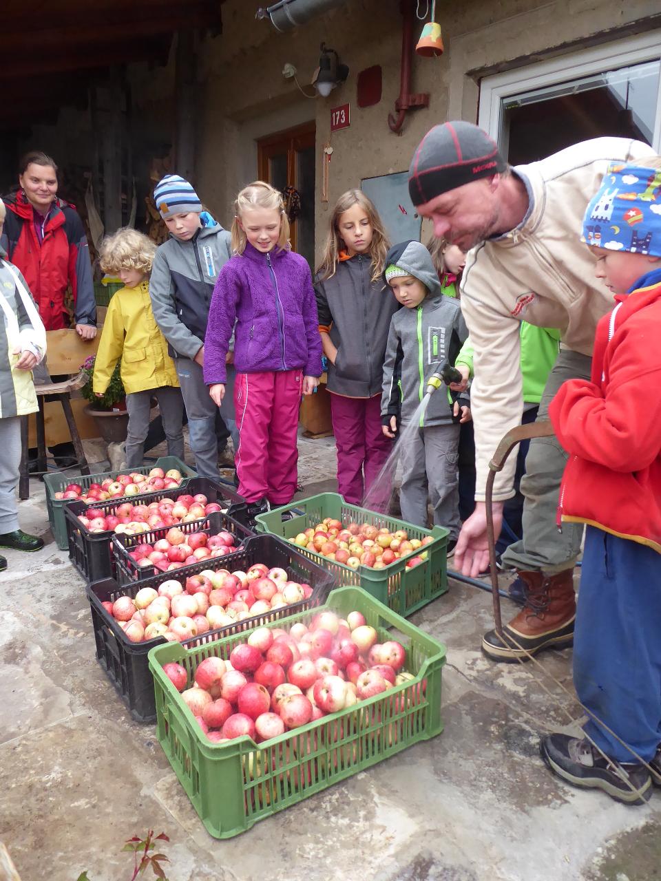 Tento týden jsme děkovali za podzimní úrodu a věnovali se více ovoci a zelenině, která u nás dozrává. Poznávali jsme jednotlivé druhy pomocí hmatu, chuti i očima:) Zaujalo nás i vyprávění maminky Cyrila o původu jabloní, díky kterému jsme se přenesli do Kazachstánu a prohlédli si zajímavé fotky ze života tamějších obyvatel. Ze čtvrtečního venkovního dne jsme si udělali den jablečný:) Ráno jsme nasbírali jablka, napekli štrúdly, pak jsme vyrazili moštovat k tatínkovi Otíka a ve škole jsme ještě malovali podzimními barvami. Celý týden jsme hojně tvořili různá stvoření a bytosti z donesených přírodnin. Nezapomněli jsme také pokročit v češtině, angličtině a matematice. Rádi také zpíváme a hrajeme na hudební nástroje.