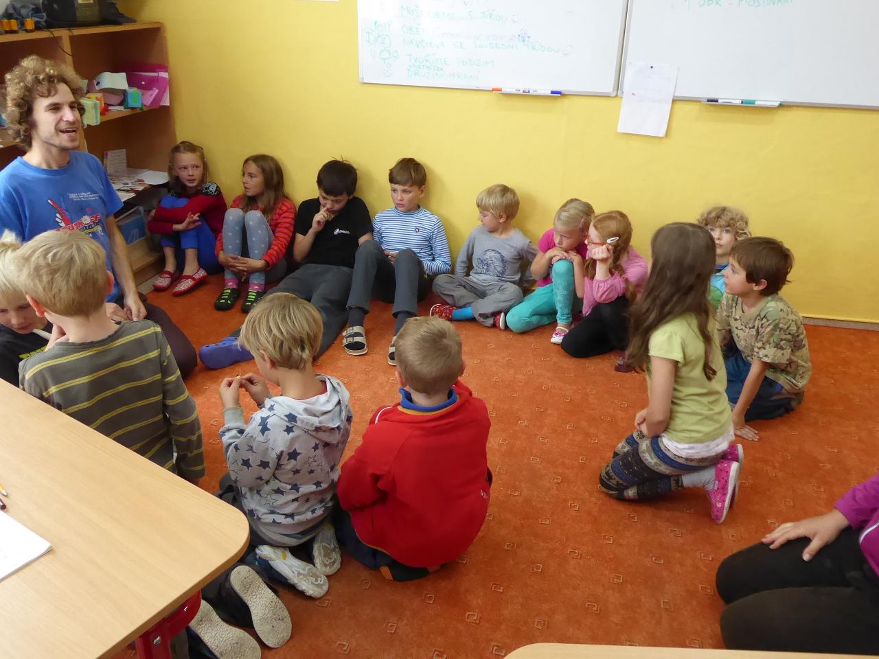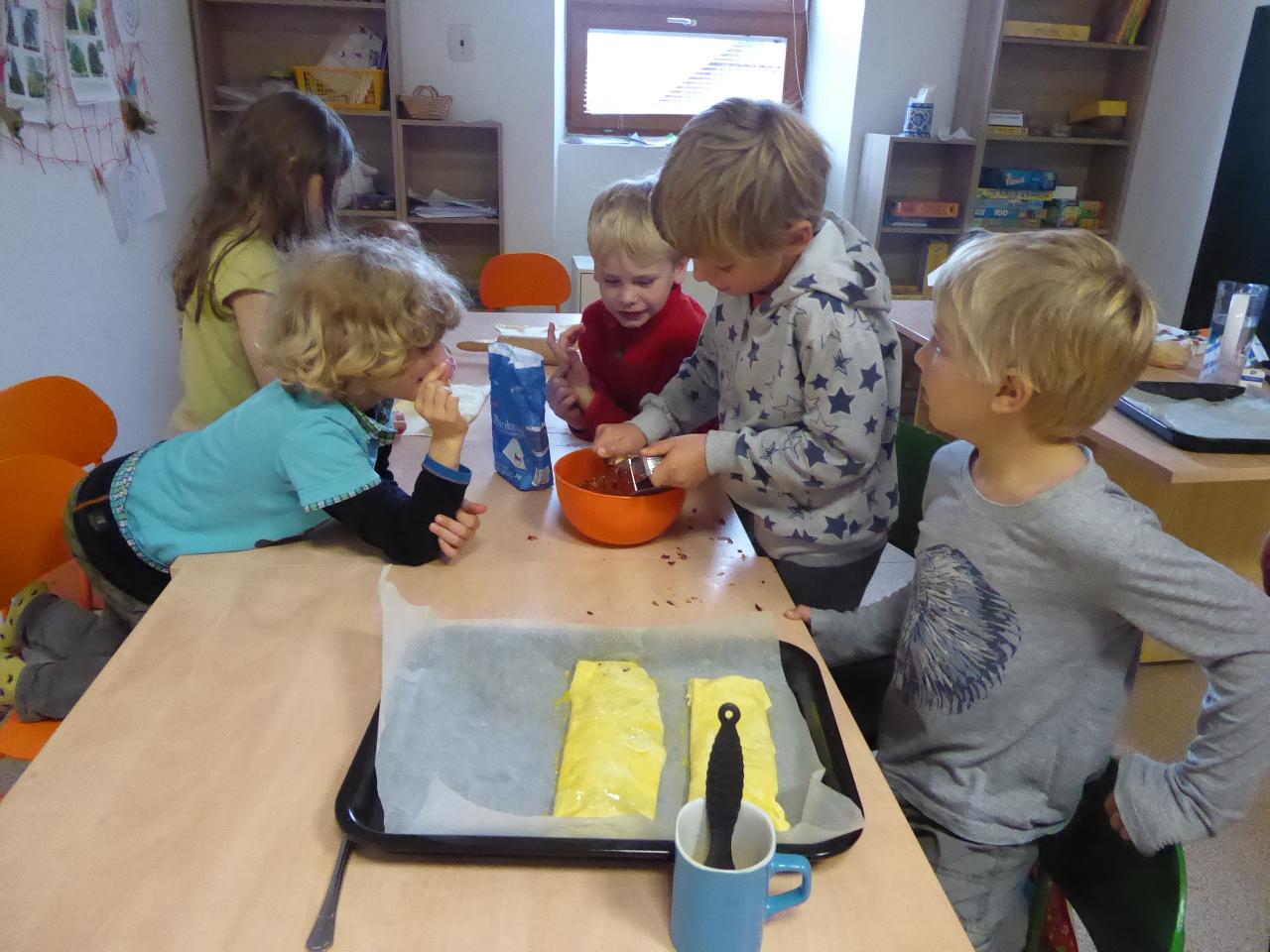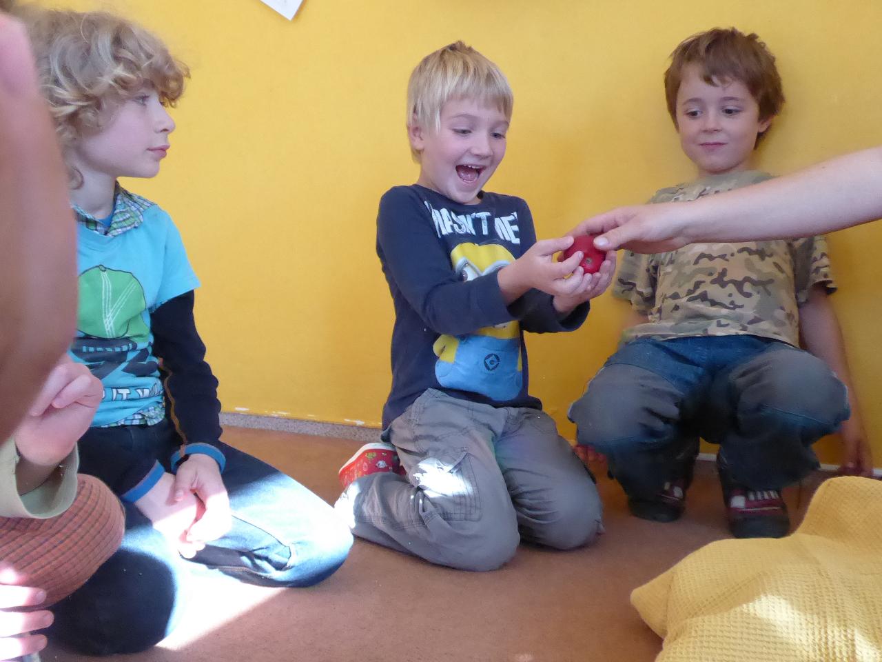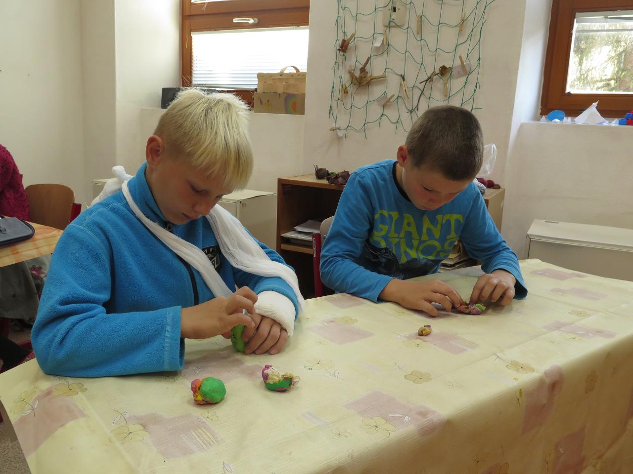 Tento týden jsme děkovali za podzimní úrodu a věnovali se více ovoci a zelenině, která u nás dozrává. Poznávali jsme jednotlivé druhy pomocí hmatu, chuti i očima:) Zaujalo nás i vyprávění maminky Cyrila o původu jabloní, díky kterému jsme se přenesli do Kazachstánu a prohlédli si zajímavé fotky ze života tamějších obyvatel. Ze čtvrtečního venkovního dne jsme si udělali den jablečný:) Ráno jsme nasbírali jablka, napekli štrúdly, pak jsme vyrazili moštovat k tatínkovi Otíka a ve škole jsme ještě malovali podzimními barvami. Celý týden jsme hojně tvořili různá stvoření a bytosti z donesených přírodnin. Nezapomněli jsme také pokročit v češtině, angličtině a matematice. Rádi také zpíváme a hrajeme na hudební nástroje.