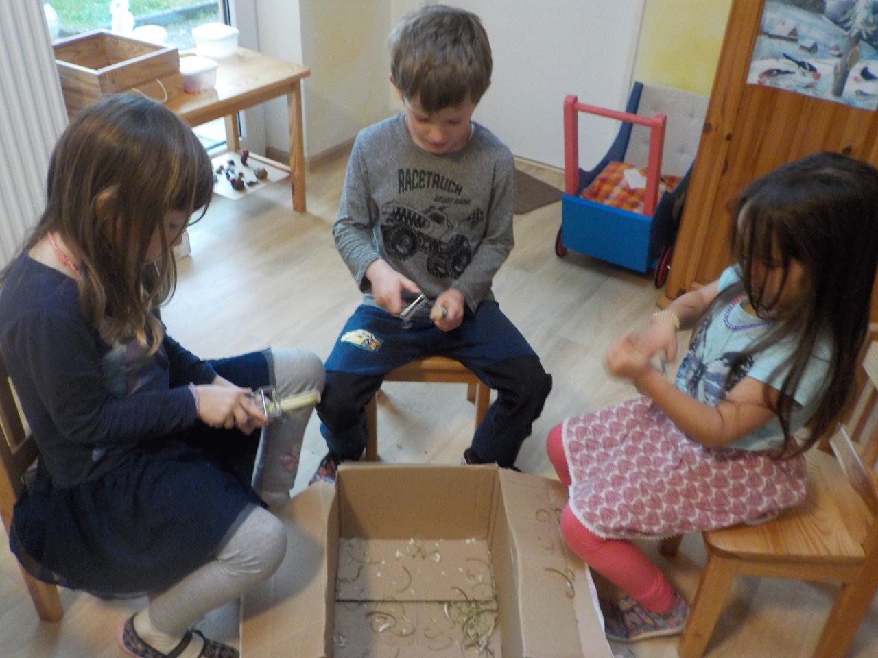 Zima už se pomalu vkrádá, světla je málo a chlad a mlha všude, sluníčka jen pomálu. Jsme dobře připraveni? Jsou všechny dírky mechem ucpané? Zásoby jídla na celou zimu? Dříví nasbírané a narovnané? Tak jako malí broučci jsme se chystali. Křížaly už jsou usušené a teď to dříví - s velkou chutí jsme se pustili do práce a z obyčejných klacíků pomocí nožíků a škrabek si vyrobili dříví nejen na zimu - máme dřívka jako hudební nástroj. Nechybělo ani zpívání, cvičení, malování, modelování i tvoření. Tak a teď ať si třeba mrzne...