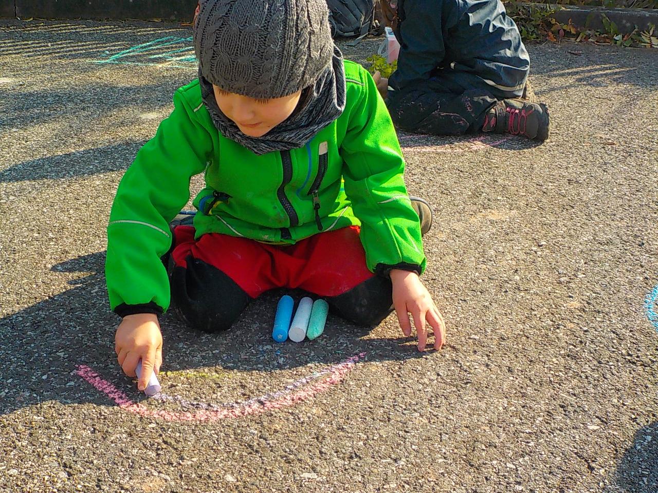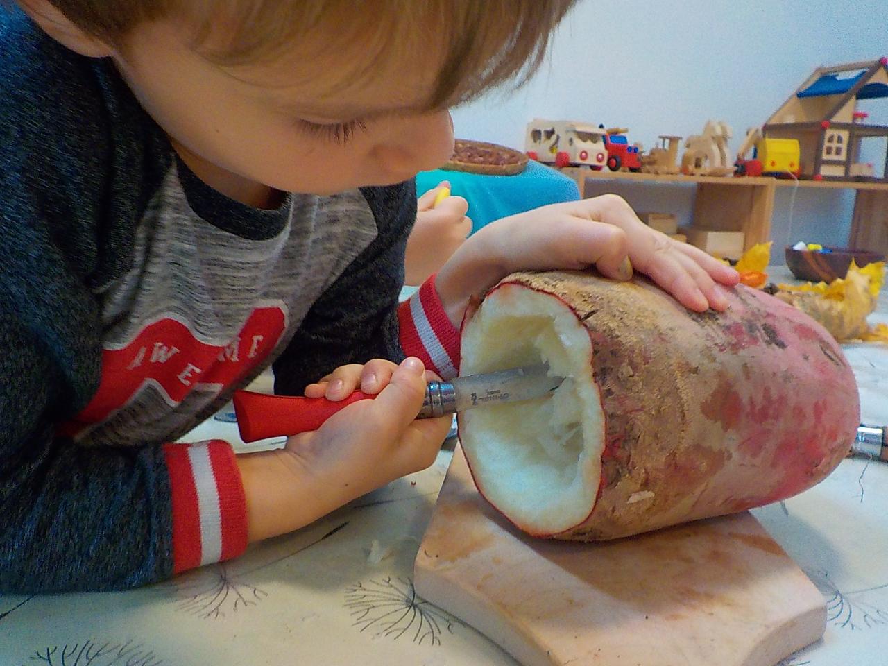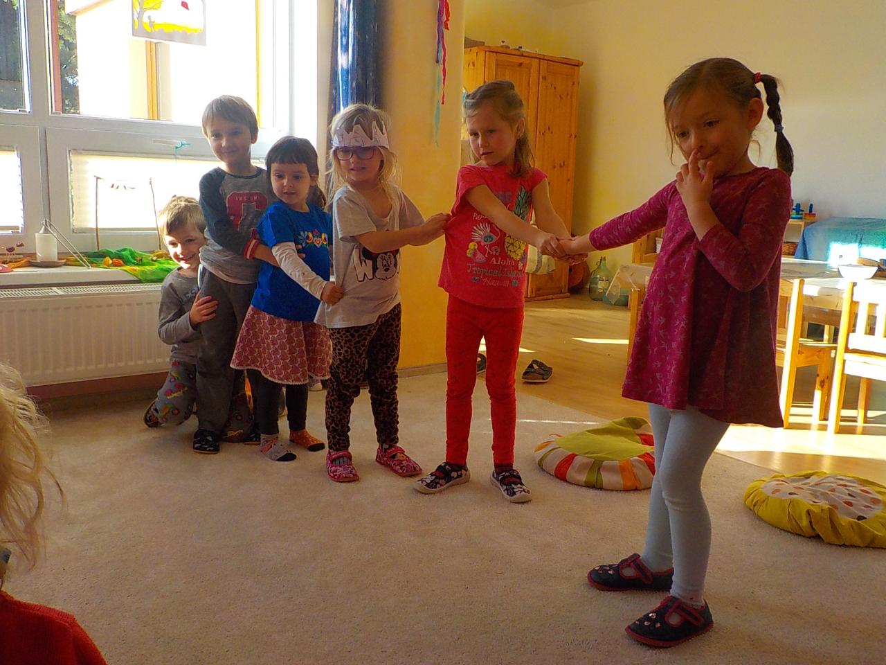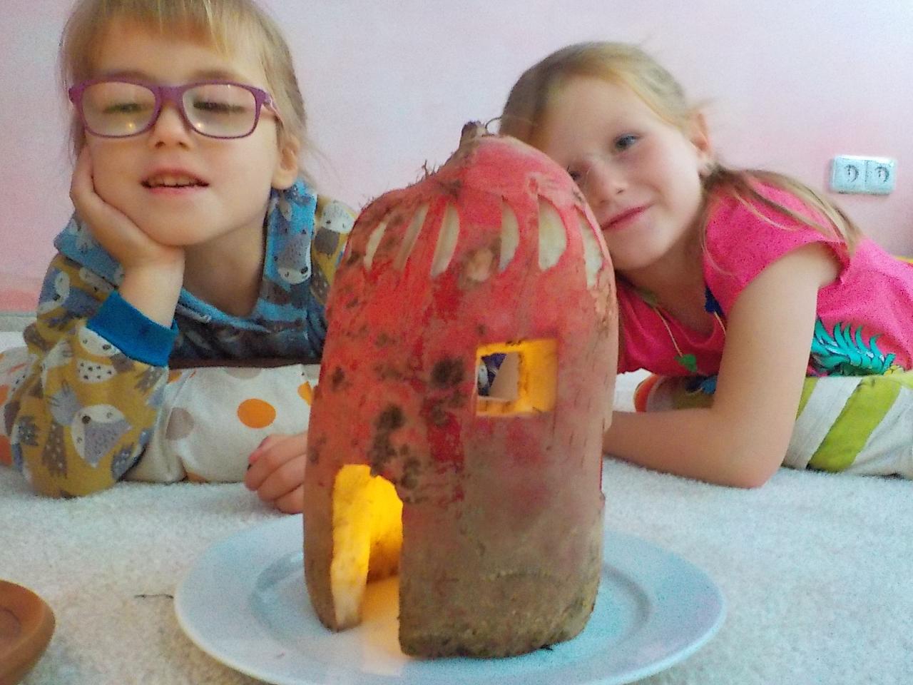 Krásných slunečných dní jsme s radostí využili - malování křídami na cestě, vyhřívání se, hra na schovávanou, hledání barevných lístků, válení sudů v trávě, průzkum potůčku a posílání lodiček z listí. Zato ty mlhavé dny byly jako stvořené pro tvorbu naší lucerničky z řepy - ta pak mohla děti vítat při příchodu po zbytek týdne. O řepě jsme si zahráli pohádku a všichni pečlivě tahali, až vytáhli. Říkanka o dýni nás provázela při výrobě dýniček z kynutého těsta, na kterých jsme si pochutnali a dýniček papírových. K umocnění celé atmosféry přispěla Péťa svým dušičkovým divadýlkem.