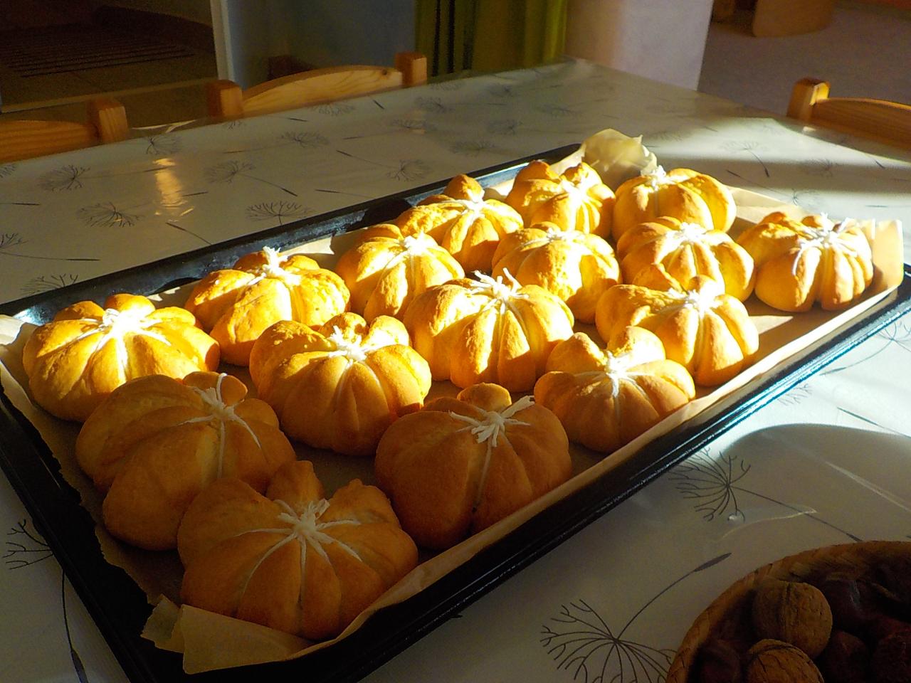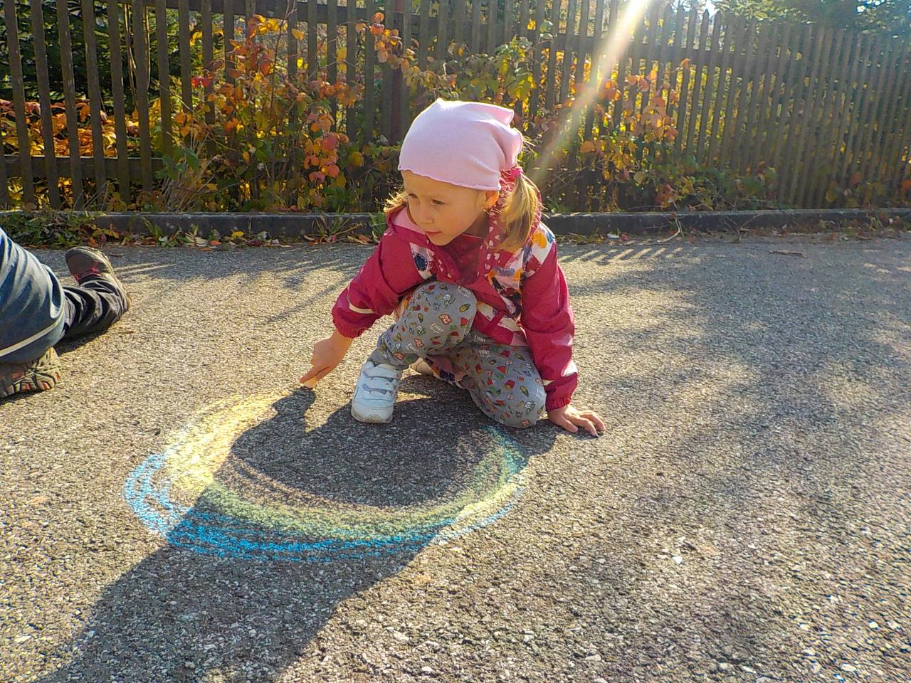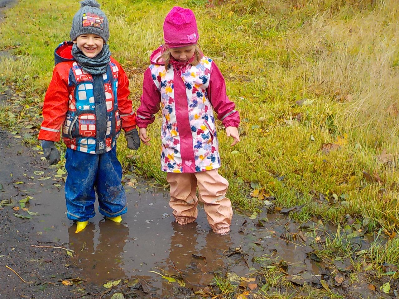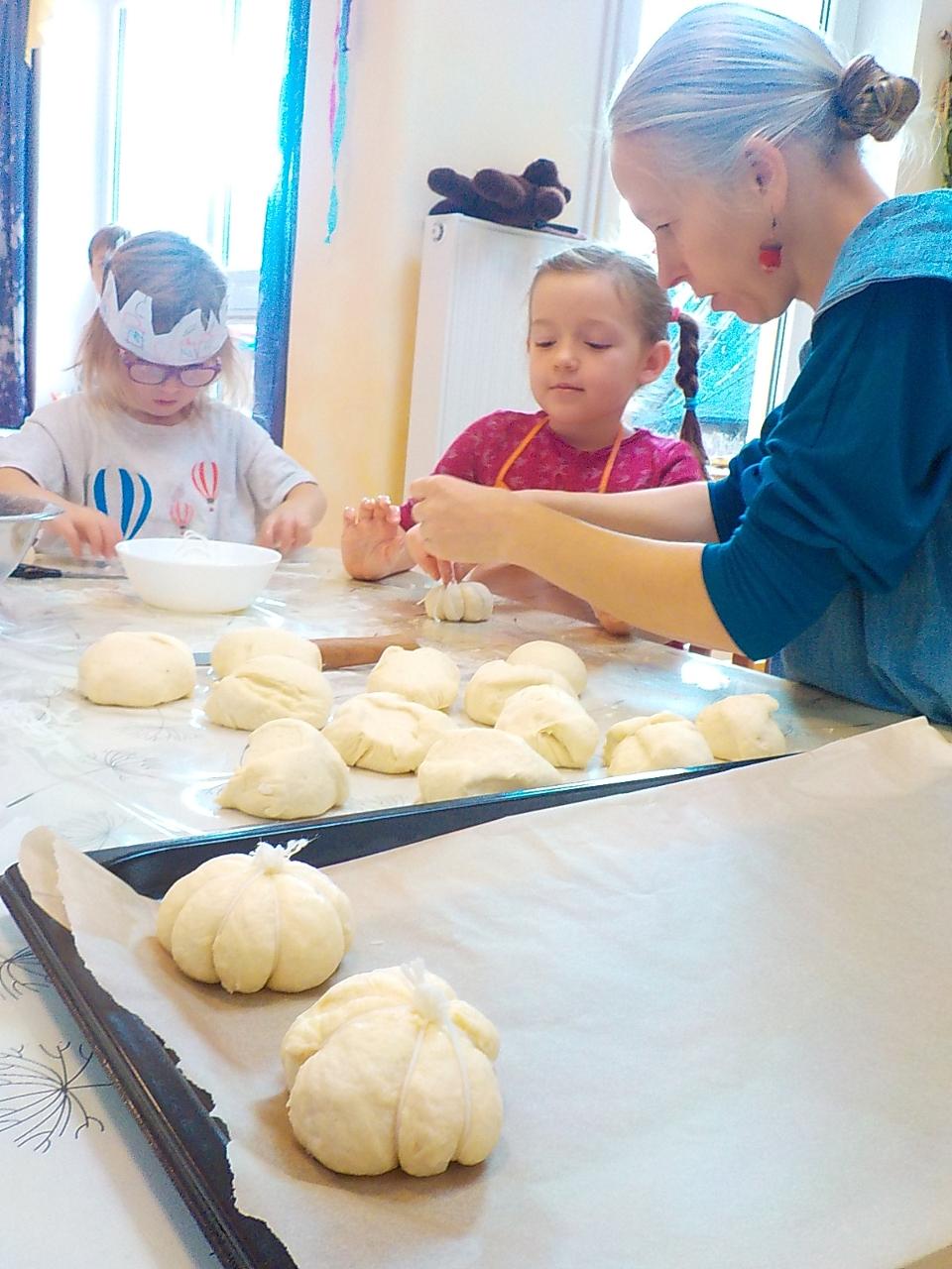 Krásných slunečných dní jsme s radostí využili - malování křídami na cestě, vyhřívání se, hra na schovávanou, hledání barevných lístků, válení sudů v trávě, průzkum potůčku a posílání lodiček z listí. Zato ty mlhavé dny byly jako stvořené pro tvorbu naší lucerničky z řepy - ta pak mohla děti vítat při příchodu po zbytek týdne. O řepě jsme si zahráli pohádku a všichni pečlivě tahali, až vytáhli. Říkanka o dýni nás provázela při výrobě dýniček z kynutého těsta, na kterých jsme si pochutnali a dýniček papírových. K umocnění celé atmosféry přispěla Péťa svým dušičkovým divadýlkem.