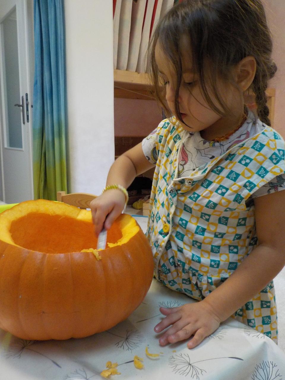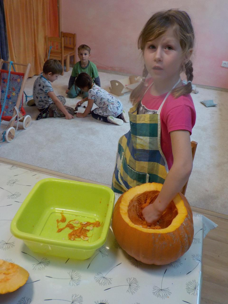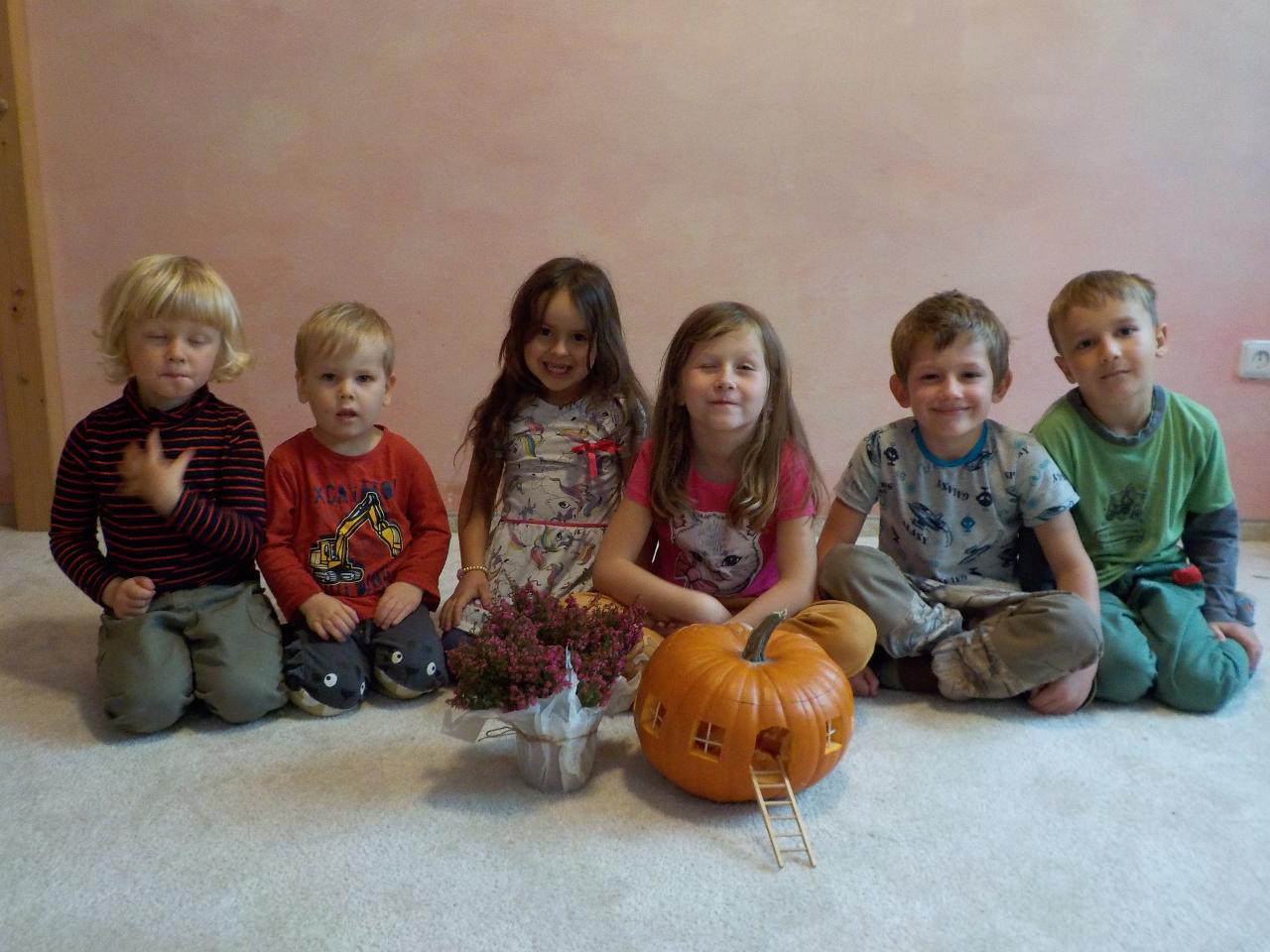 Čas dušičkový, ale počasí babího léta, tak se nám s radostí v přírodě užívalo sluníčka a nikdo z nás ani nechtěl věřit, že je čas dušiček. Přesto jsme dýni jako domeček vydlabali a rozsvítili ji před školkou, aby se každý brouček či skřítek mohl v ní přes noc ohřát. Z dýňového těsta jsme si upekli houstičky jako dýničky. Péťa nám zahrála dušičkové divadýlko. Nechybělo ani cvičení fyzické či předškolácké a hra a hra a hra.