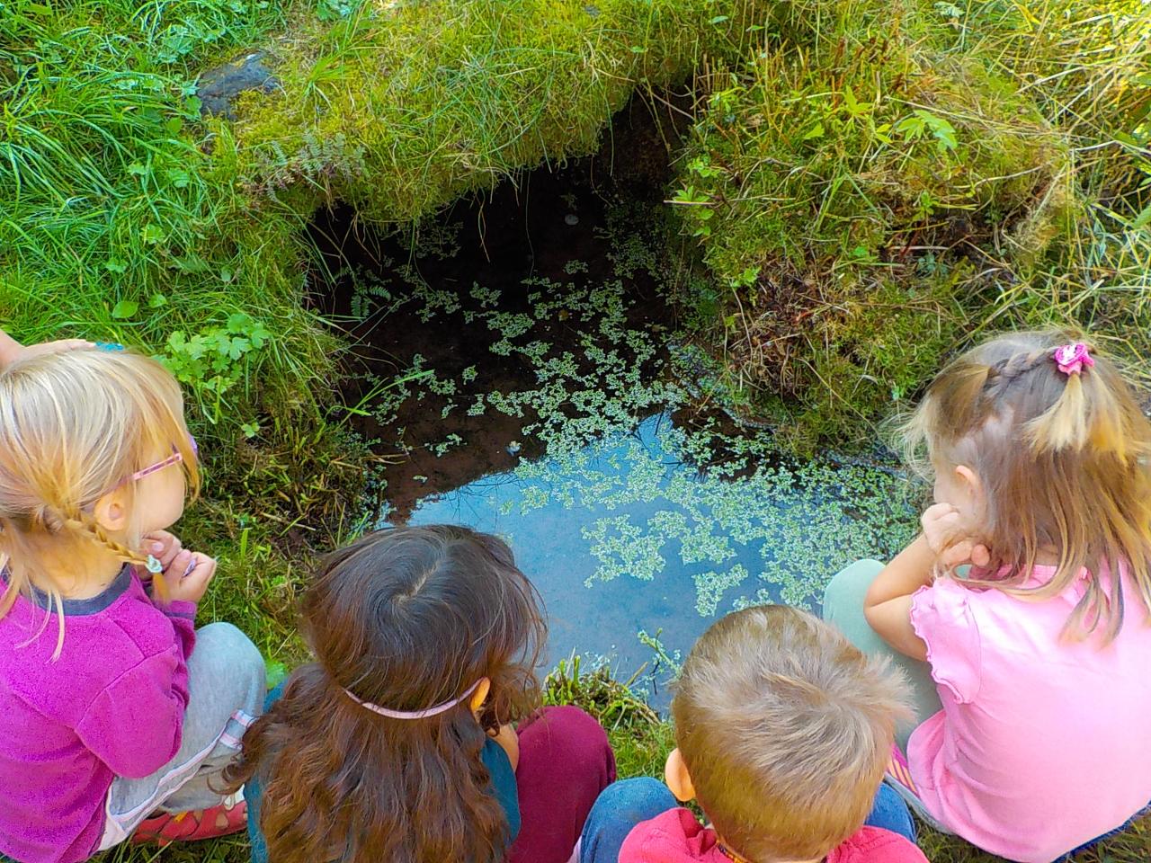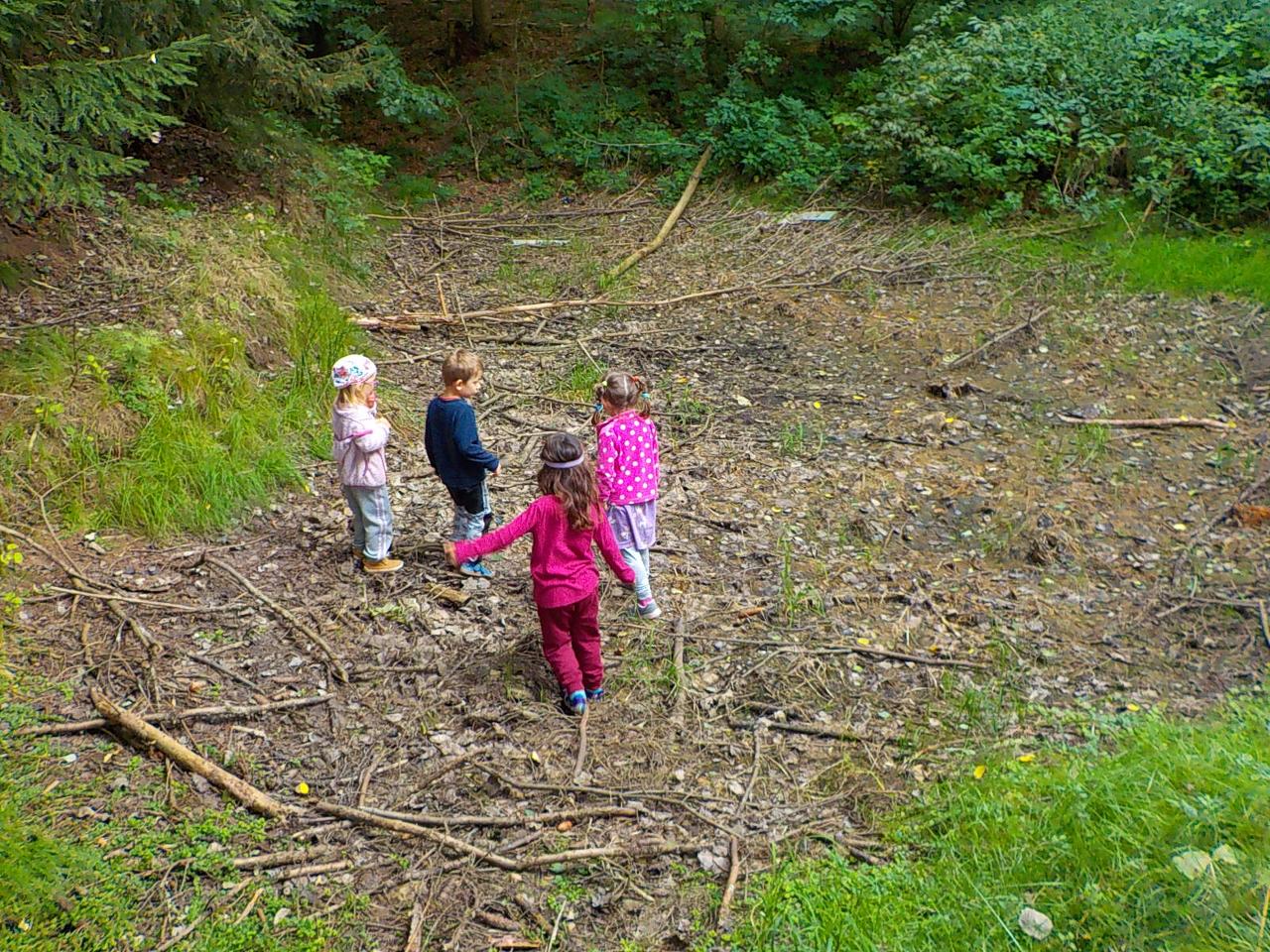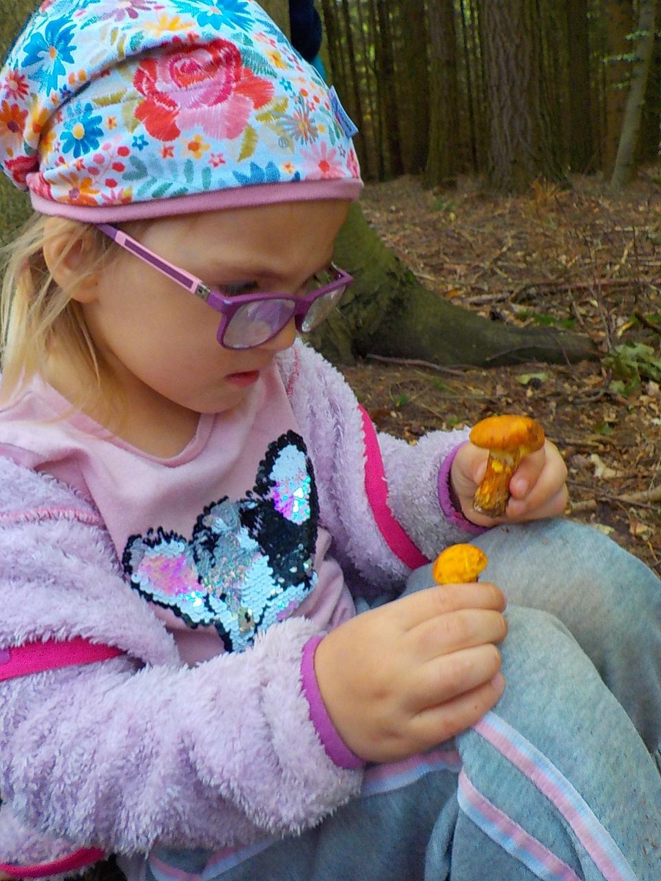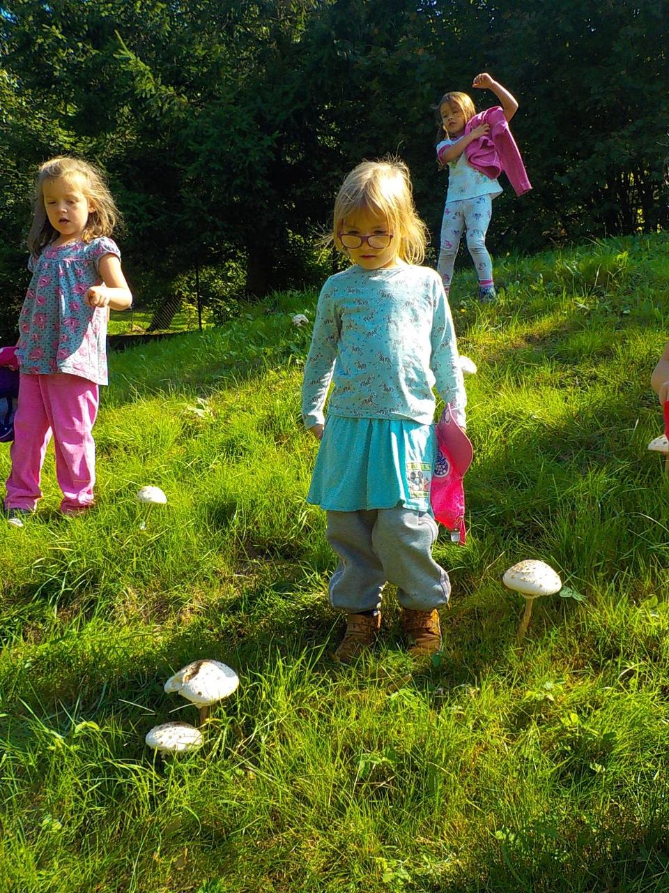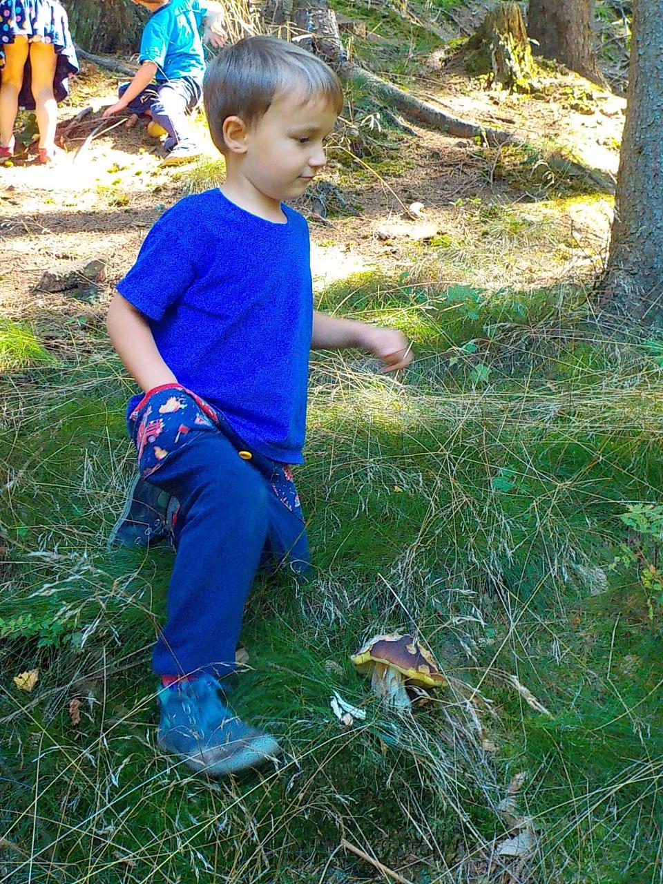 Celý týden zpíváme povídáme si o houbičkách, v lese "Vysočáku" i v houští si hrajeme na Kateřinu z pohádky, našli jsme pár klouzků a bedly. Vypadá to, že na houby je tento týden sucho, ale my se z toho hřejivého slunce radujeme. Hrajeme si na písku, lezeme na lísku, uzobáváme ostružiny, pozorujeme myšku, ještěrku, slepýše i brouky a vyschlý rybník. Houby jsme si upekli z těsta i vymodelovali z včelího vosku, udělali zápichy a vyrobili z papíru. V pátek nás čekalo houbičkové divadýlko.