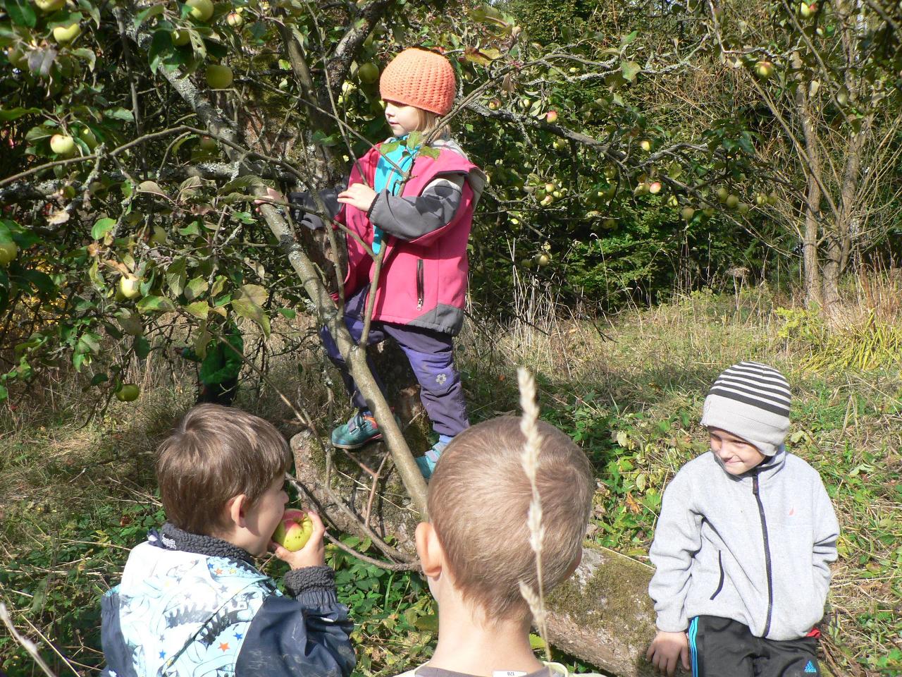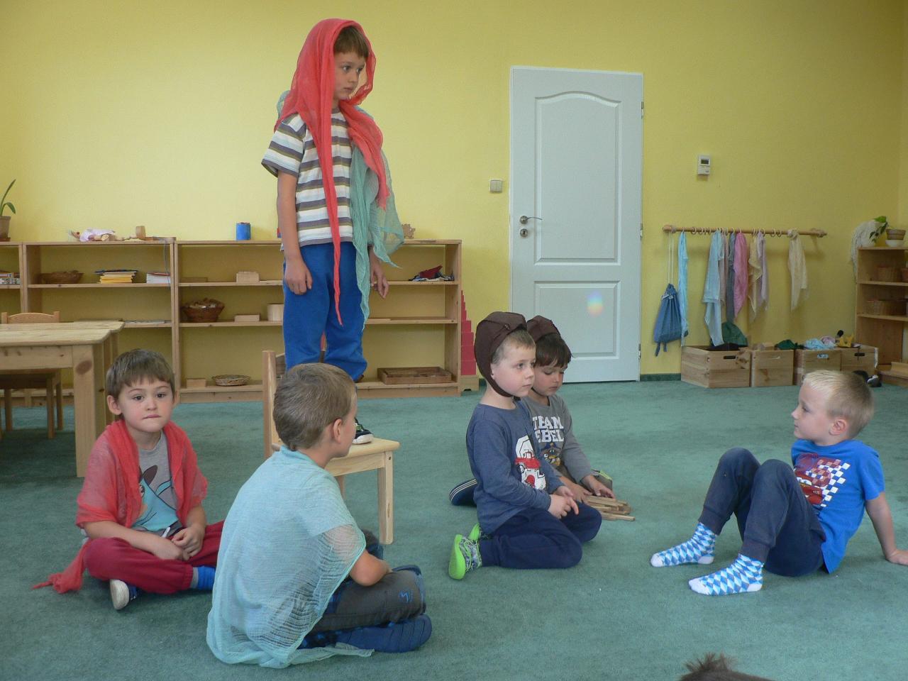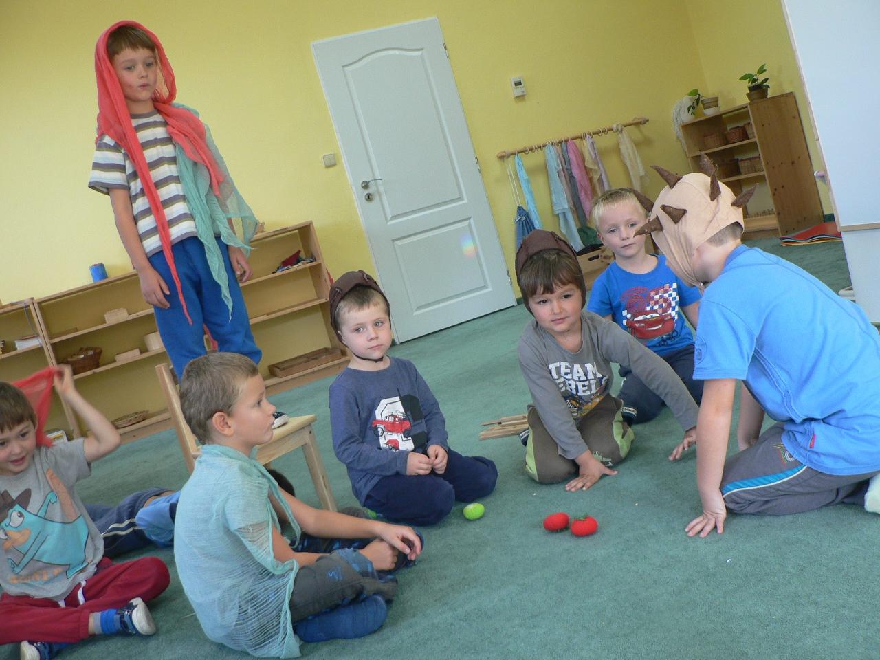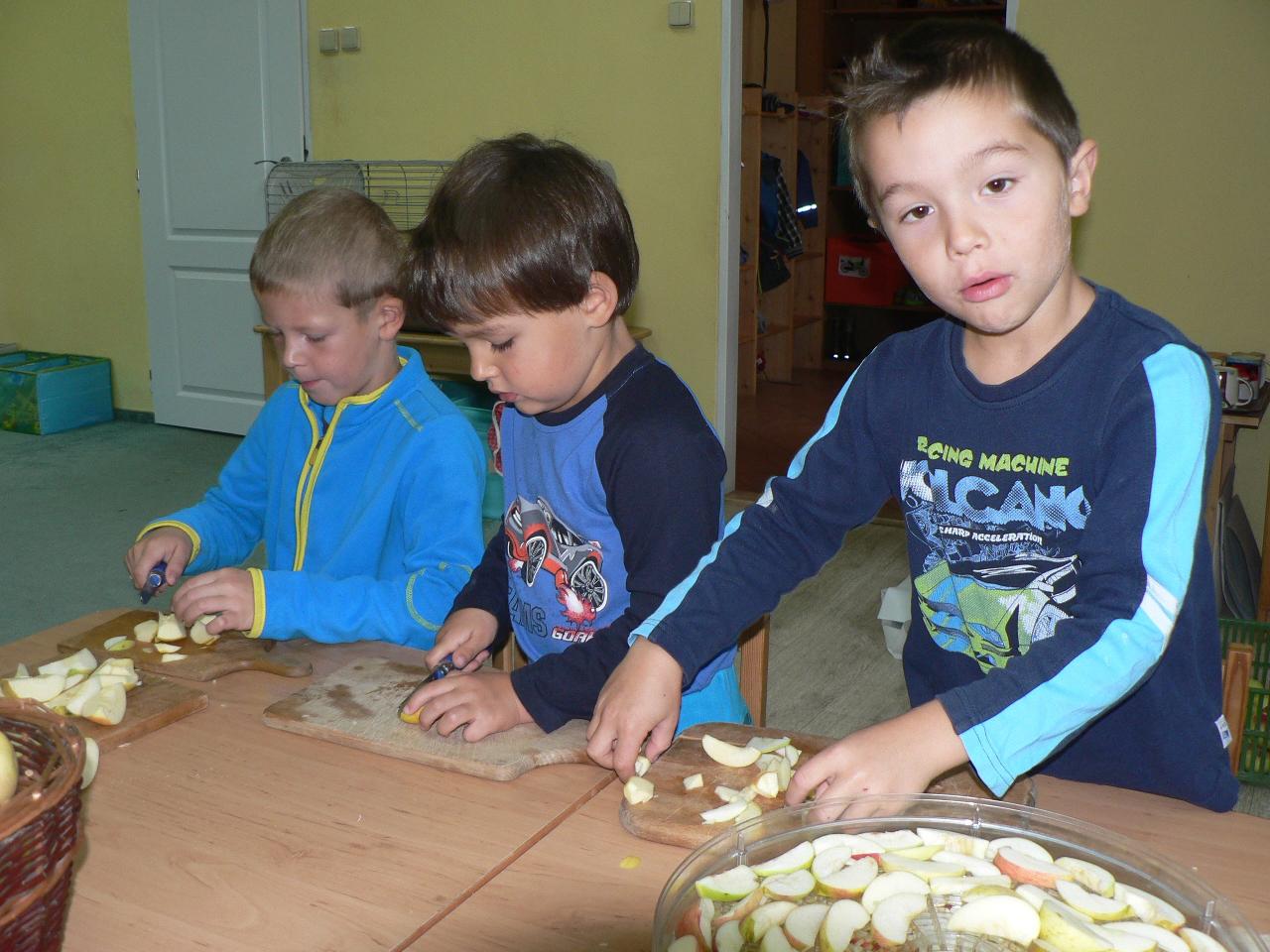 Vyprávíme pohádku O hamižném ježkovi Vítkovi, který chtěl všechna jablíčka z jabloňového sadu jen pro sebe. S dětmi jsme se tak dostali k povídání o tom, co to vlastně hamižnost je. Jaké to je, když je někdo lakomý a jaké to je chovat se kamarádsky a umět se s druhými rozdělit. Dozvěděli jsme se také spoustu zajímavých informací o ježcích – o tom, jak žijí, kde tráví zimu, co jim doopravdy chutná a čím jsou pro nás užiteční. Dalším tématem byla jablíčka a zásoby na zimu, vyzkoušeli jsme si česání jablek česáčkem a zjistili jsme, že je k tomu zapotřebí nejen trocha zručnosti a šikovnosti, ale také trpělivosti. Z načesaných jablek jsme pak společně krájeli a sušili křížaly na zimu. Ježečky jsme také malovali, lepili a dostali se nám i do her a písniček.