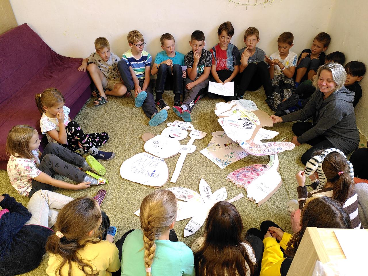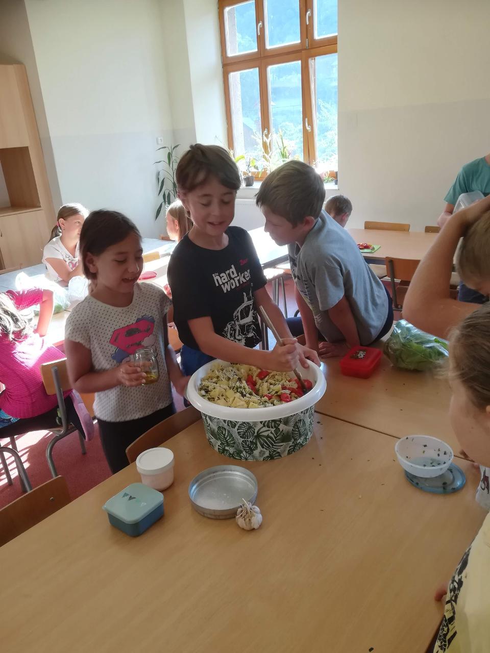 Tento týden jsme prožili v běžném rytmu nového rozvrhu pro tento rok, zopakovali jsme si již nějaké učivo z loňského ročníku i začali tvořit narozeninové plakáty vázané na roční období. Ve čtvrtek jsme se vydali na putování v okolí školy. Obědem se nám stal společně vytvořený báječný těstovinový salát. Každý přiložil ruku k dílu nejen z domova přinesených surovin, ale i krájením, mícháním a hlavně pojídáním. Při putování jsme si vyprávěli ještě zážitky z prázdnin a vytvořili si plakáty s pravidly třídy. Nakonec jsme se setkali i s ostatními třídami a zahráli společnou hru. Bouřka nás ke konci trošku vyrušila a tak jsme do školy běželi, co nám nohy stačily.