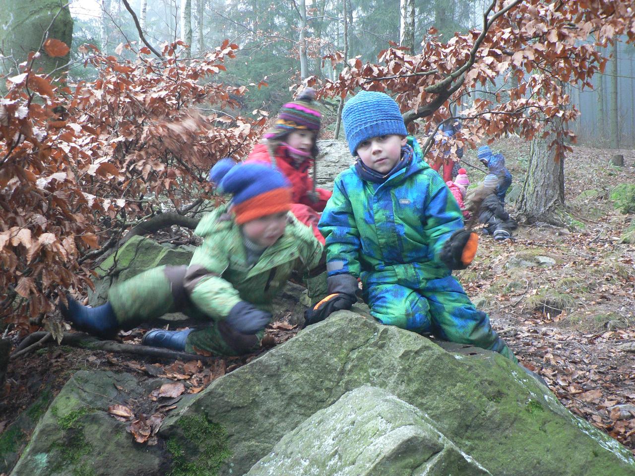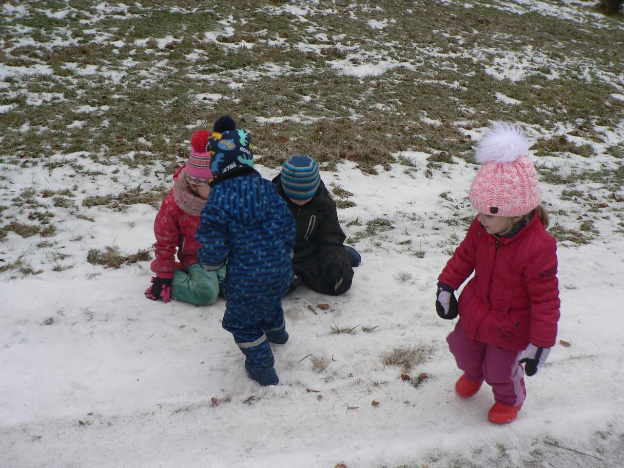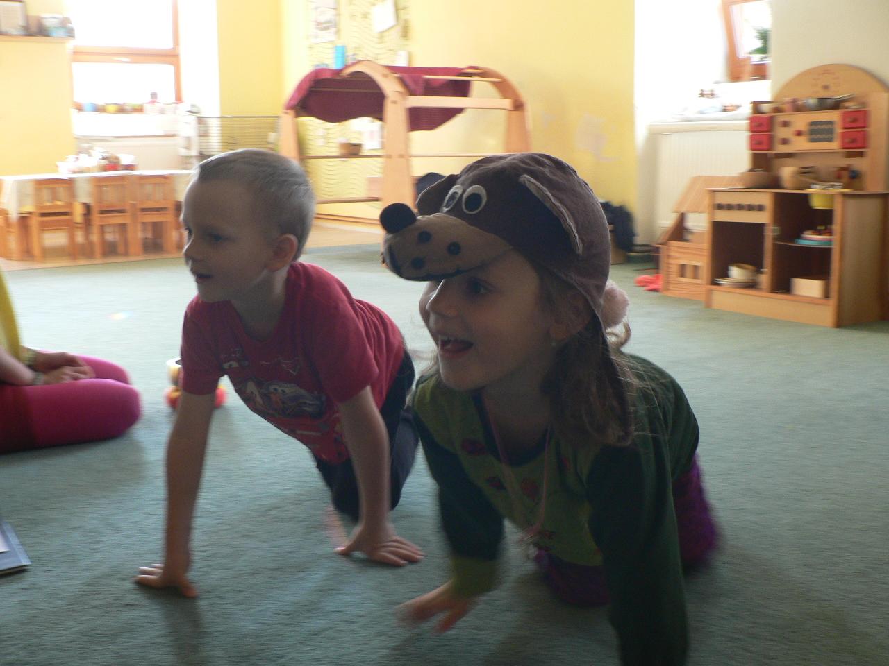 Tento týden jsme strávili ve společnosti medvídka Brumly, kterému se v zimě vůbec nechtělo spát a zažil díky tomu velké dobrodružství. Díky Brumlovi jsme zjistili, proč je pro medvědy zimní spánek tak důležitý a dozvěděli se o těchto velkých šelmách spoustu dalších zajímavostí. Třeba to, jak poznáme, že v lese žije medvěd, čím se takové velké zvíře živí, kdy se rodí mláďata, kde nejraději přezimuje a zda je pro člověka nebezpečný. Zjistili jsme také, že je více druhů medvědů a jak je od sebe můžeme poznat. Poznávali jsme také další zvířata, která v zimě spí a podle stop zjišťovali, která jsou vzhůru a můžeme je v lese zahlédnout nebo potkat u krmelce. Z papíru jsme vystřihovali a lepili medvědy v jeskyni, tiskli na papír stopy a otisky různých lesních zvířat, tvořili puzzle ze špachtlí a obrázkových ubrousků nebo malovali vánici prstovými barvami. Zpívali jsme medvědí písničku a vyzkoušeli si také medvědí bubnování. Venku nás provázelo proměnlivé počasí od sychravého mrholení, mlhavé dny až po krásně slunečno. Byl to velmi pestrý týden a jsme zvědaví, jaká překvapení nám přinese ten příští.