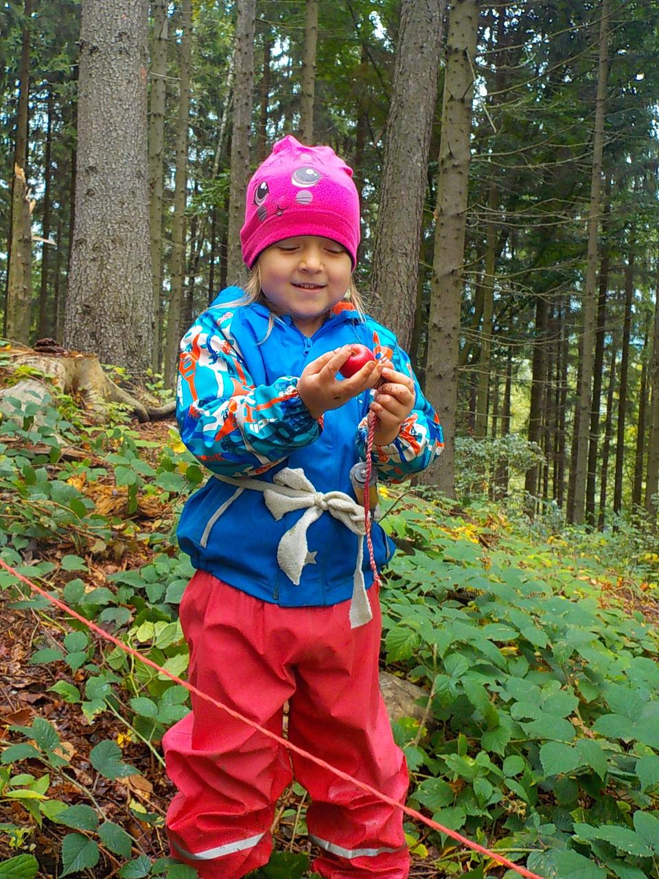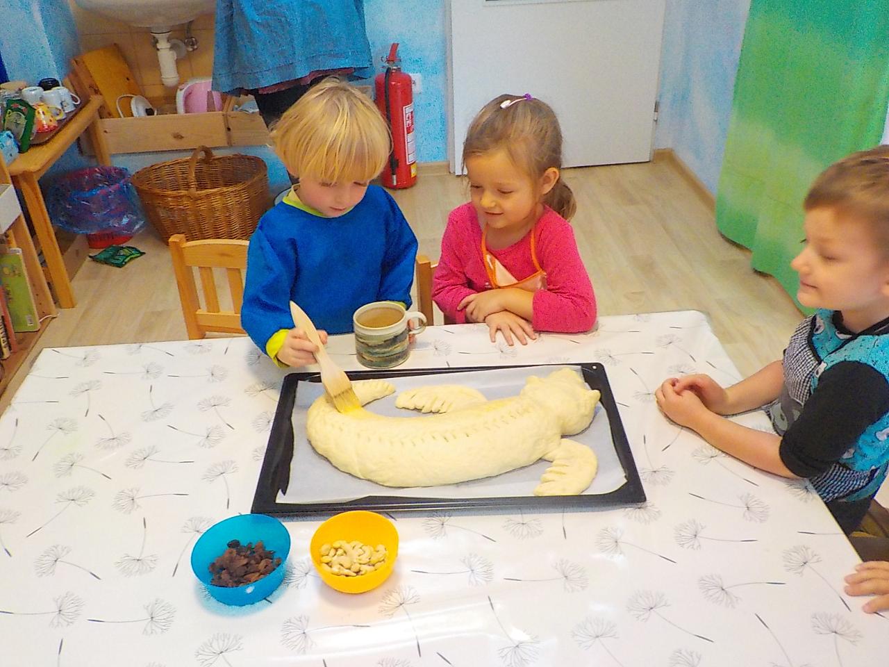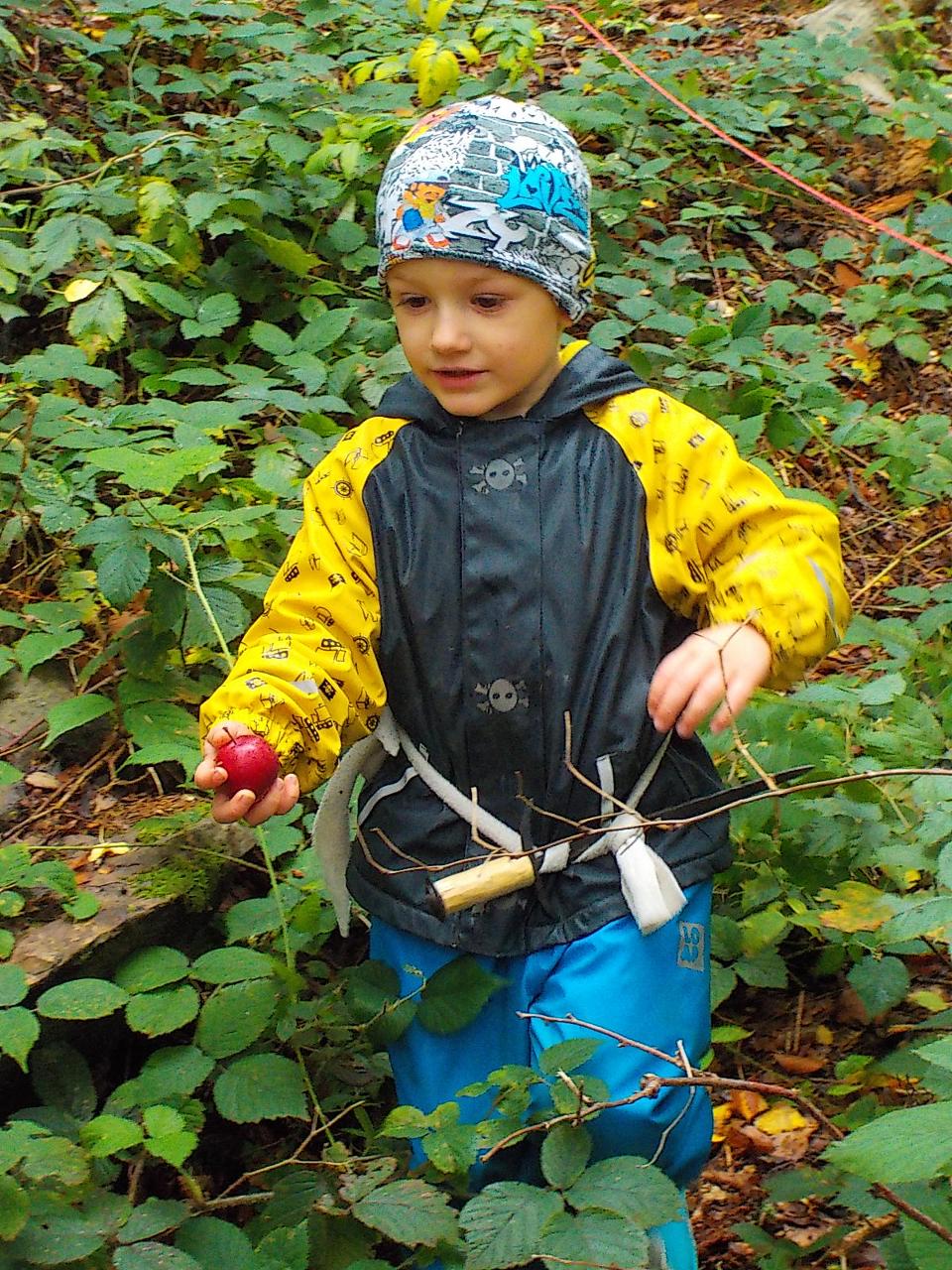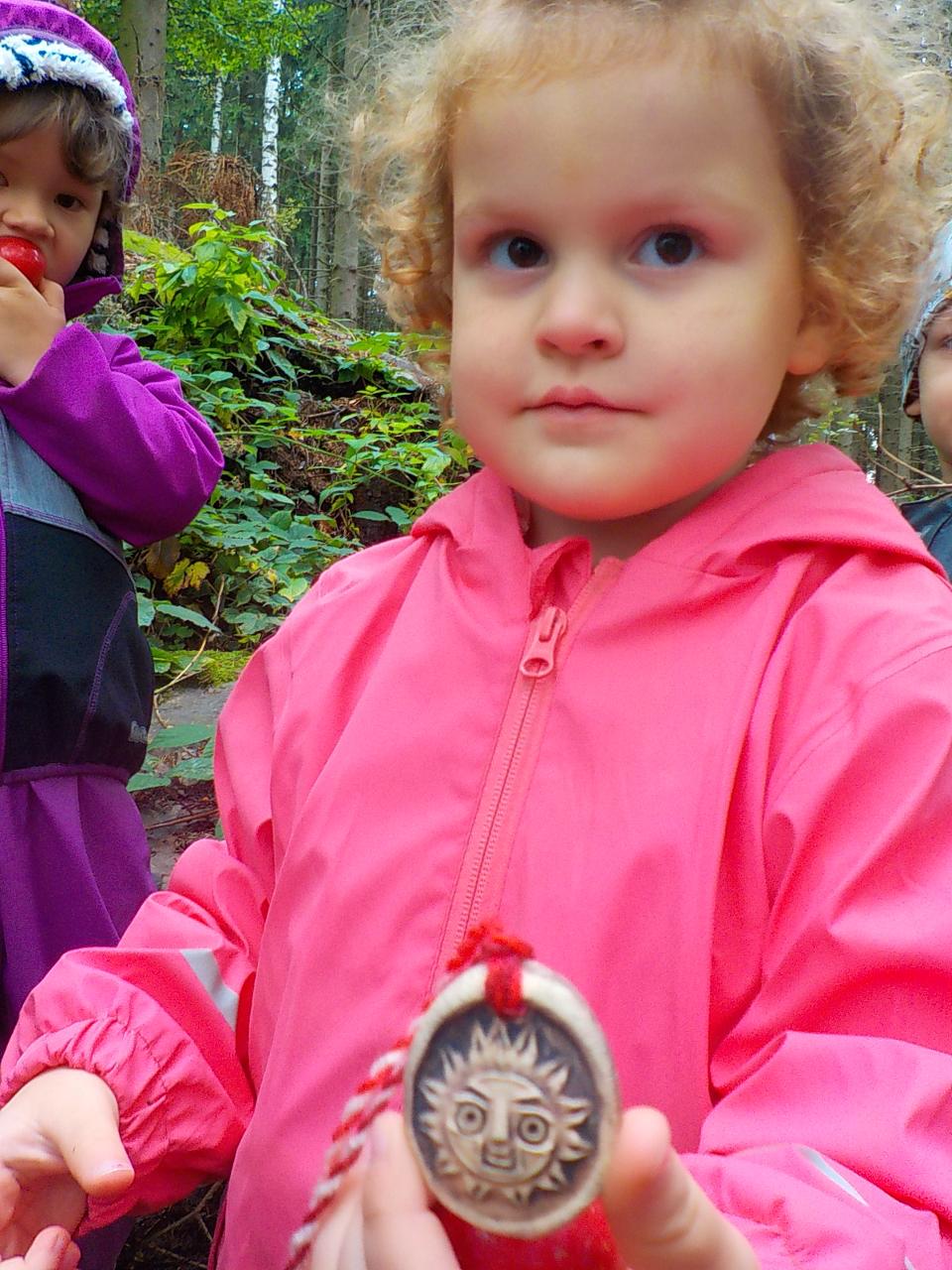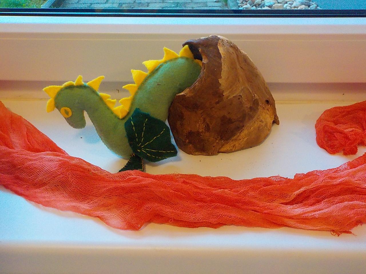 Po slunečných dnech se obloha zatáhla, jakoby Slunce svými křídly zastínil drak. Však jsme to také viděli v Pétině divadýlku, jak Michael s drakem odvážně bojoval a vyhrál. A jakou sílu a odvahu a teplo asi musí mít kovář ve své kovárně, když ková kladiva, podkovy a meče rytířům… To my, když se obloha trochu vyjasnila, jsme také vyzkoušeli velikost své odvahy. Posíleni písní a příběhy jsme se vydali stopách do lesa ke dračí skále a tam, vyzbrojeni železným mečem a duševním štítem se vydal jeden za druhým vpřed. Na konci cesty, každý nalezl kouzelné jablíčko a sluníčko, které mu bude připomínat odvahu a jasnost svatého Michaela. Do jednoho velkého draka jsme se také ve čtvrtek zakousli při svačině – upekli jsme ho z kynutého těsta, máku a jablek. Draka jsme si také ve čtvrtek vystřihovali podle ruky a v pátek vyrobili z javorových listů.