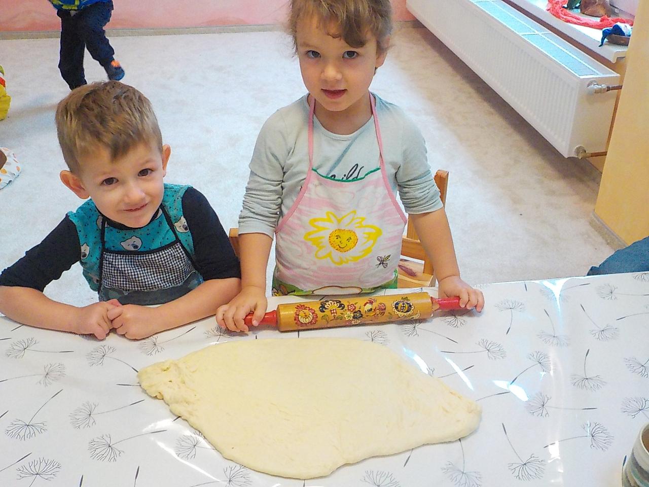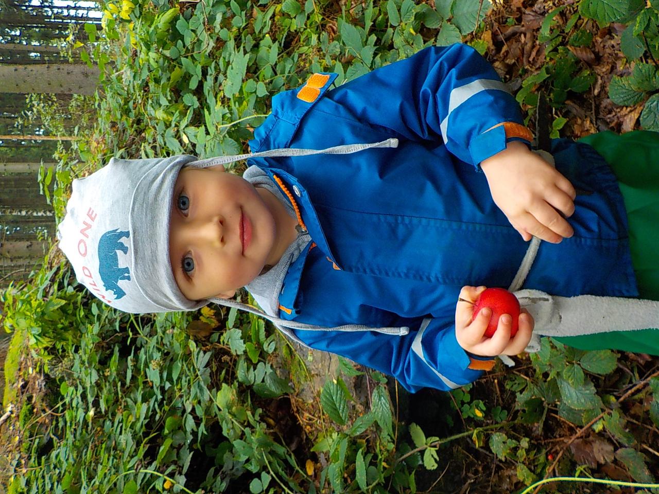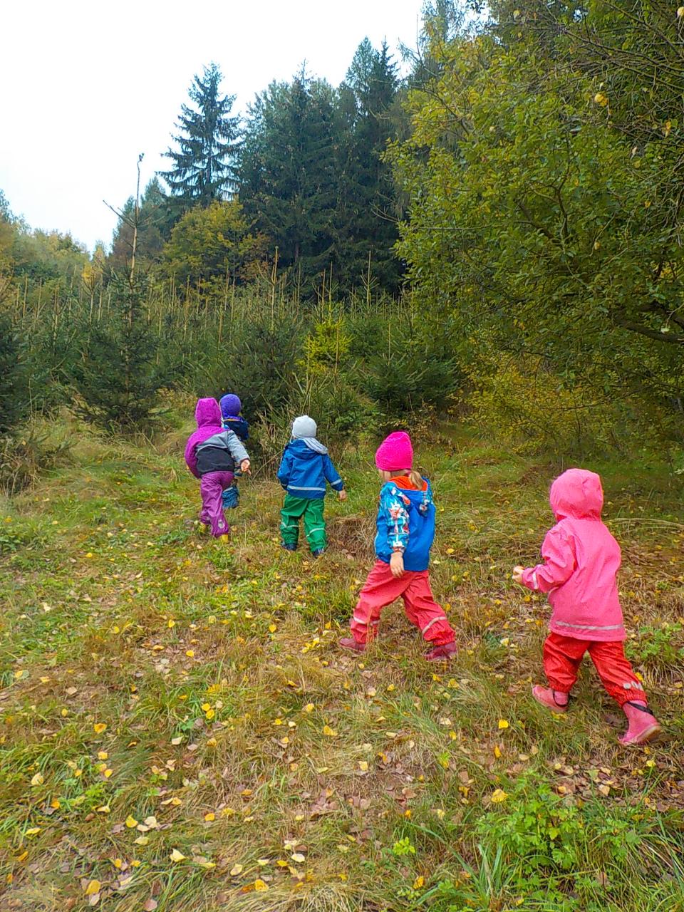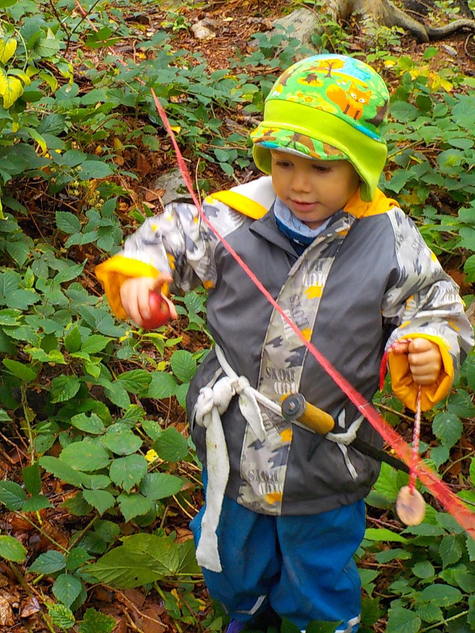 Po slunečných dnech se obloha zatáhla, jakoby Slunce svými křídly zastínil drak. Však jsme to také viděli v Pétině divadýlku, jak Michael s drakem odvážně bojoval a vyhrál. A jakou sílu a odvahu a teplo asi musí mít kovář ve své kovárně, když ková kladiva, podkovy a meče rytířům… To my, když se obloha trochu vyjasnila, jsme také vyzkoušeli velikost své odvahy. Posíleni písní a příběhy jsme se vydali stopách do lesa ke dračí skále a tam, vyzbrojeni železným mečem a duševním štítem se vydal jeden za druhým vpřed. Na konci cesty, každý nalezl kouzelné jablíčko a sluníčko, které mu bude připomínat odvahu a jasnost svatého Michaela. Do jednoho velkého draka jsme se také ve čtvrtek zakousli při svačině – upekli jsme ho z kynutého těsta, máku a jablek. Draka jsme si také ve čtvrtek vystřihovali podle ruky a v pátek vyrobili z javorových listů.