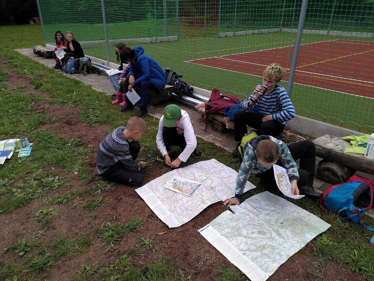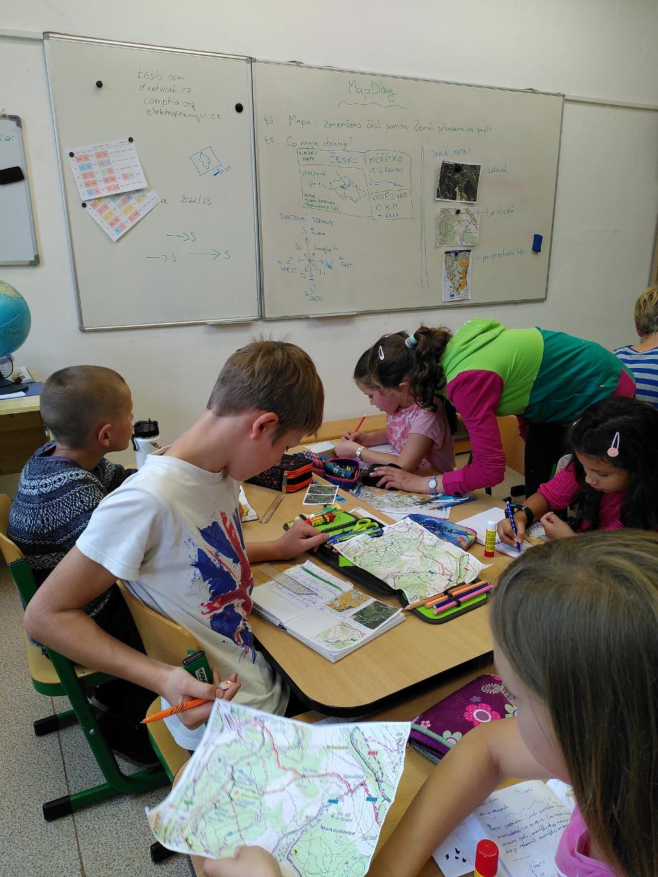 V průběhu září jsme se vypravili do světa map. Poznali jsme rozmanitost map i co vše a jak nám mapy dokážou říci. Hledali jsme, co mapa musí obsahovat, aby byla mapou. V rámci venkovního dne jsme se učili najít se na mapě, zorientovat ji a porozumět mapovým znakům. Dále jsme putovali okolím školy za pomocí turistické mapy a mapy na orientační běh. Vše jsme si také zaznamenali do výletníčku a tak již známe hlavní i vedlejší světové strany česky i anglicky. Navázali jsme na první týden i v dalších předmětech, zpívali a poznávali nové učebnice.
