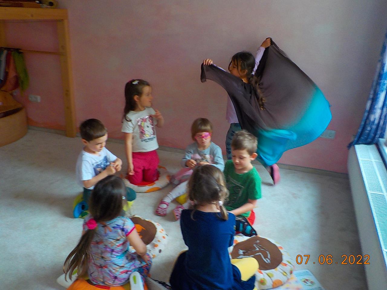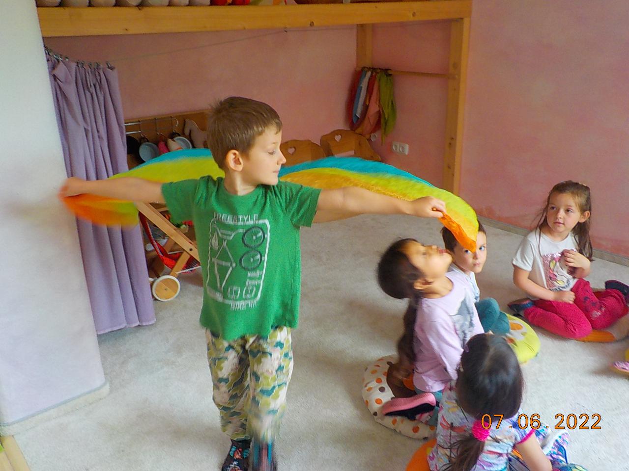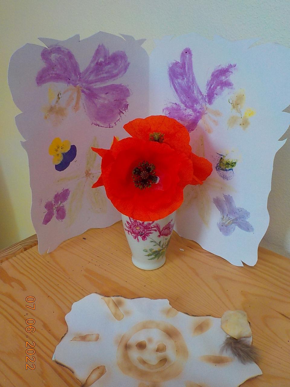 S příběhem panenky Malenky (z minulého týdne) jsme se dostali do květinové říše, kde se panenka stala královnou a narostla jí křídla. I nám narostla - sice jen hedvábná, ale krásně vlála. V pohádce o motýlovi Duháčkovi jsme se dozvěděli, co je to pýcha, jaké je to být krásný, jaké je to přijít o přátele i o odpuštění. Motýli se obtiskli i na papíře, vyráběli jsme je z dřívek a a vlny - kde jsme si krásně protrénovali motoriku. A to, že se pestrobarevný motýl dá i upéct z těsta, bylo zajímavé poznání. Každý den na čerstvém vzduchu, pozorování květin a motýlů okolo nás - jen se nám zdá, že jich je čím dál méně...