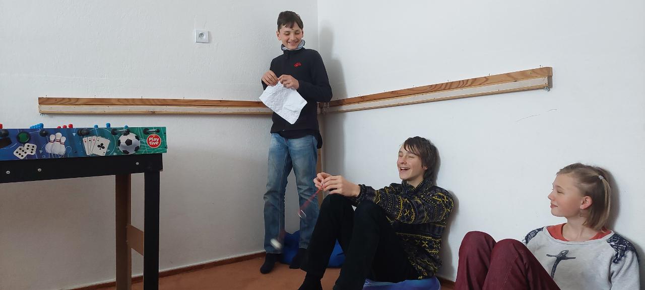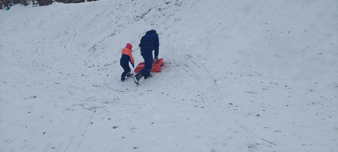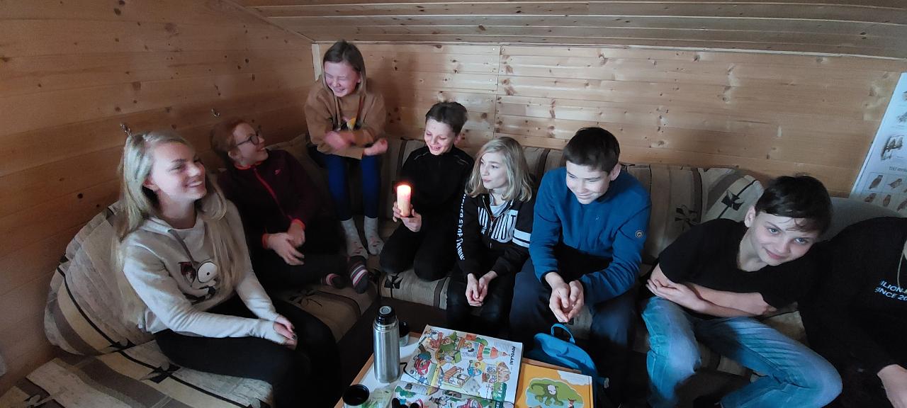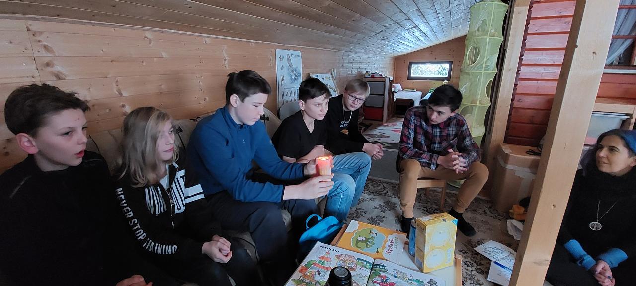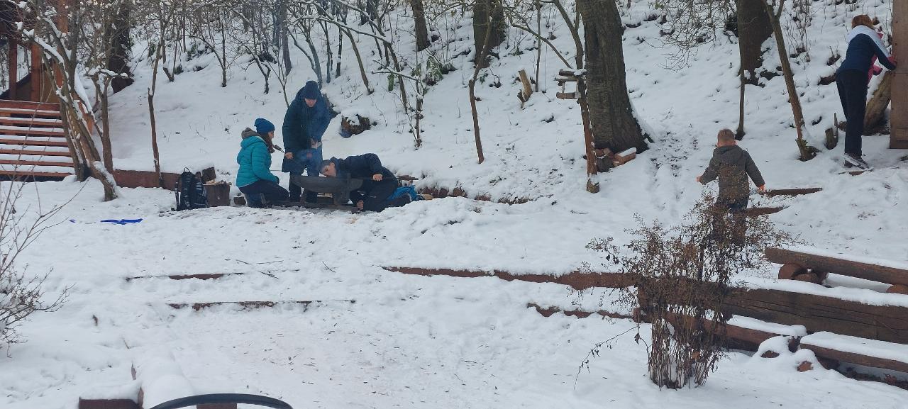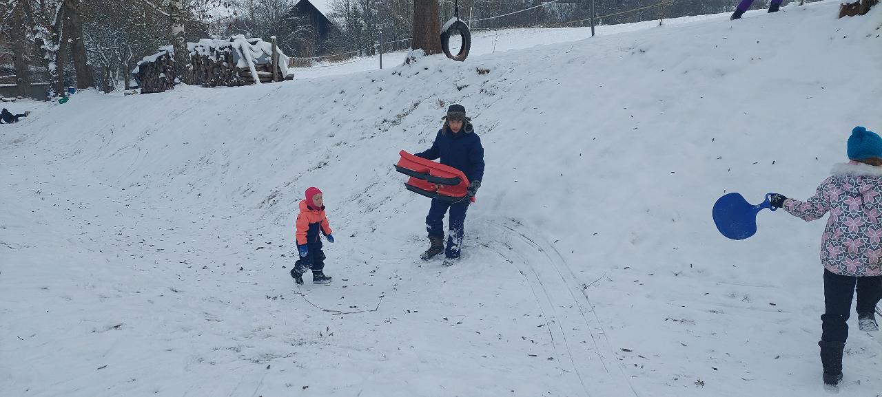 Školáci pak uvařili společně polévku a po jídle jsme venku využili bohaté sněhové nadílky a s dětmi z lesní školky jsme si užili hrátky na sněhu. Také jsme si na ohni opekli špekáčky.