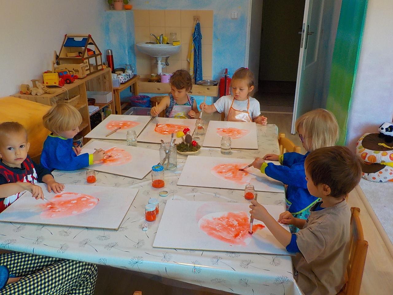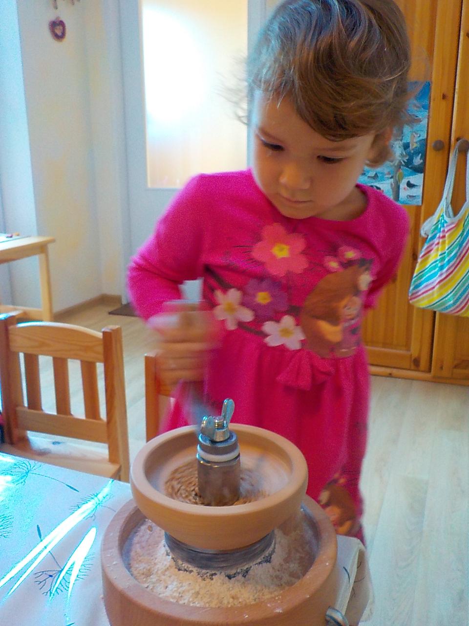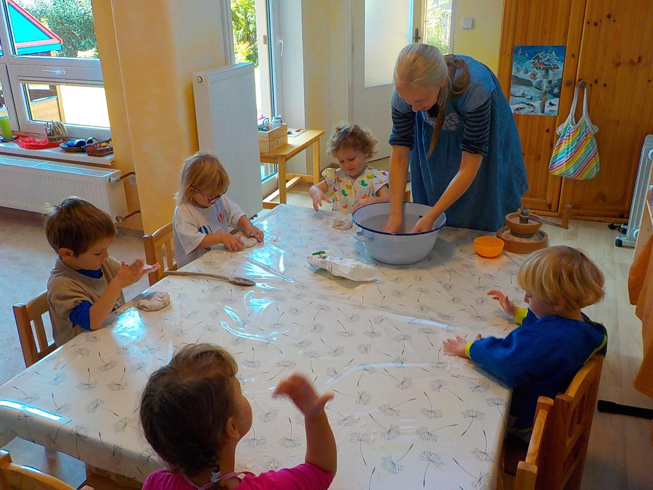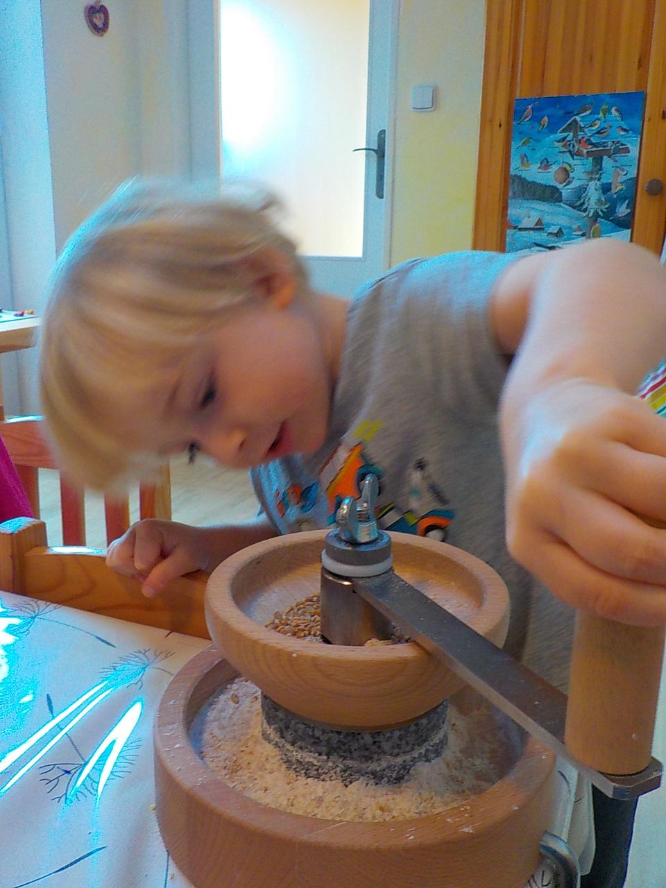 Víte-li pak, jak sedláček obilíčko seje, seče, váže, mlátí, mele a peče? My už to víme. Semínkem v zemi to začalo a semínkem v podobě rozemleté mouky a upečeného chlebíčka to končí. Každá z té dlouhé řady činností má své kouzlo. Klásky jsme vymlátili a zrnka posbírali, na mlýnku namleli a v míse promísili a výsledkem byl ve čtvrtek chutný chlebíček. To, že v chlebíčku je něco moc krásného schovaného nám ukázala Péťa se svým divadýlkem z chlebové střídy. A že to není jen tak a chce to trochu síly, jsme si mohli vyzkoušet při pátečním tvoření, kdy jsme si ze střídy vyráběli kuřátko. Vyprávěli jsme si totiž pohádku o kuřátku a obilí. Nové děti se učí napjatě poslouchat, zpívají s námi i tančí, dokáží počkat na domluvených místech. Tento týden nám sluníčko žehnalo každý den. Radostná byla i oslava Anežčiných narozenin – všichni se svíčkou v ruce mohli vyslovit pro ni přání, přidal se i skřítek s malým dárečkem. A mnohokrát děkujeme za výborný dort. Ale my všichni mravenečci jsme také dostali tento týden dárek, totiž nové hrníčky, jen naše, které si v jídelně hned poznáme. Jsou krásně průhledné, takže si to, co pijeme, i to co je za tím, můžeme dobře prohlédnout a někdy je to docela šišaté překvapení :-).