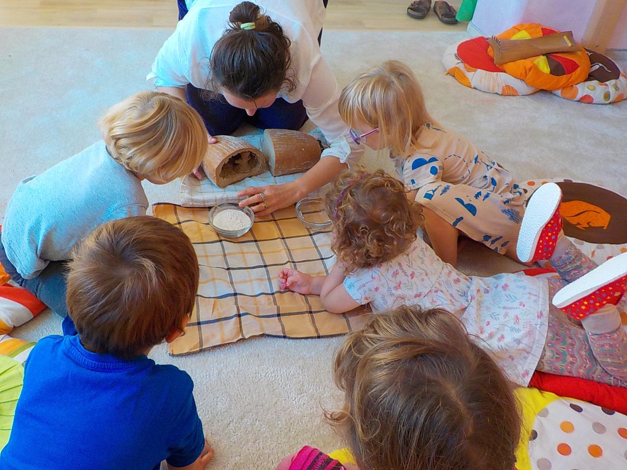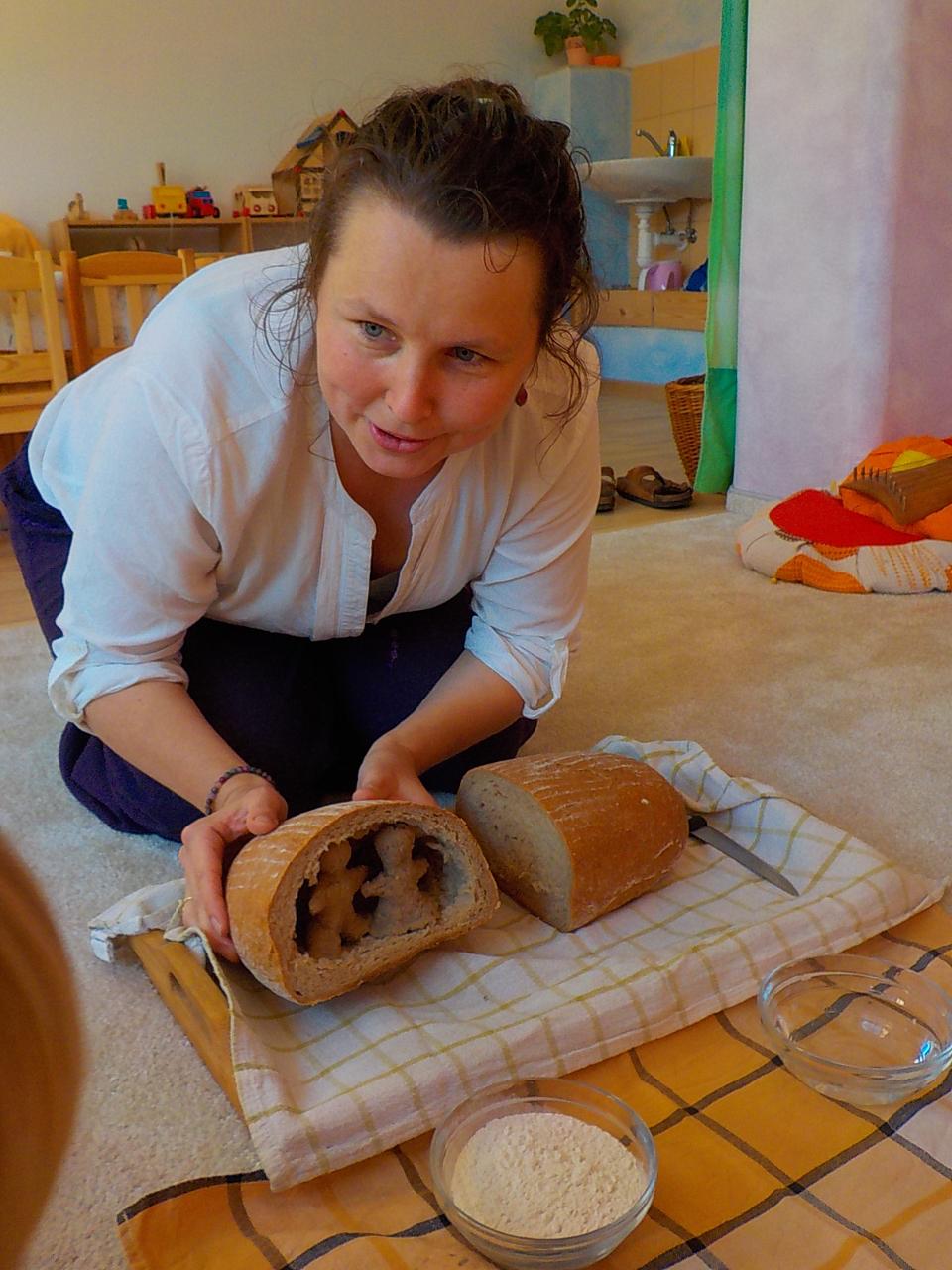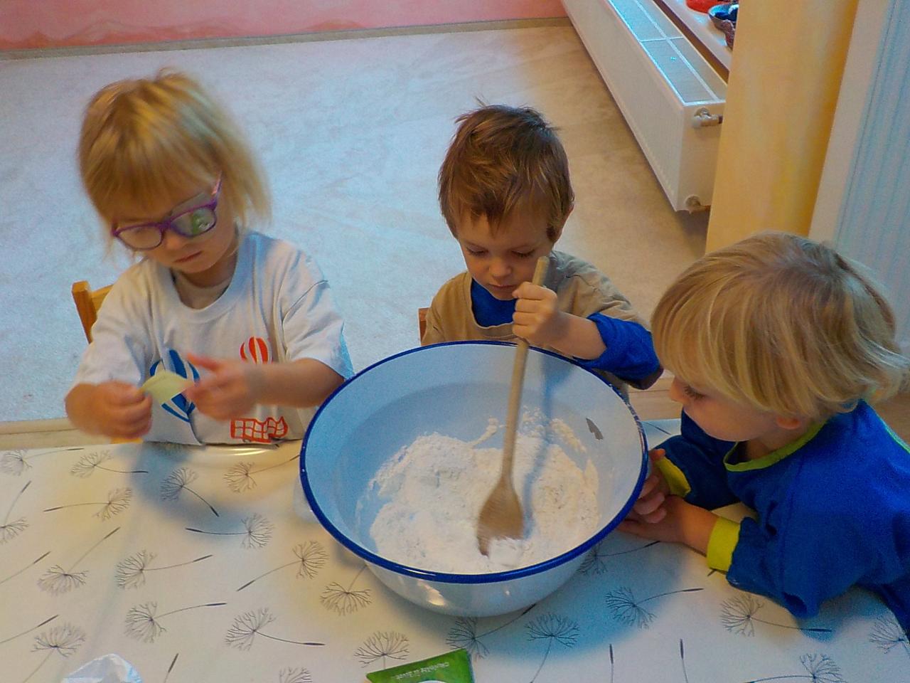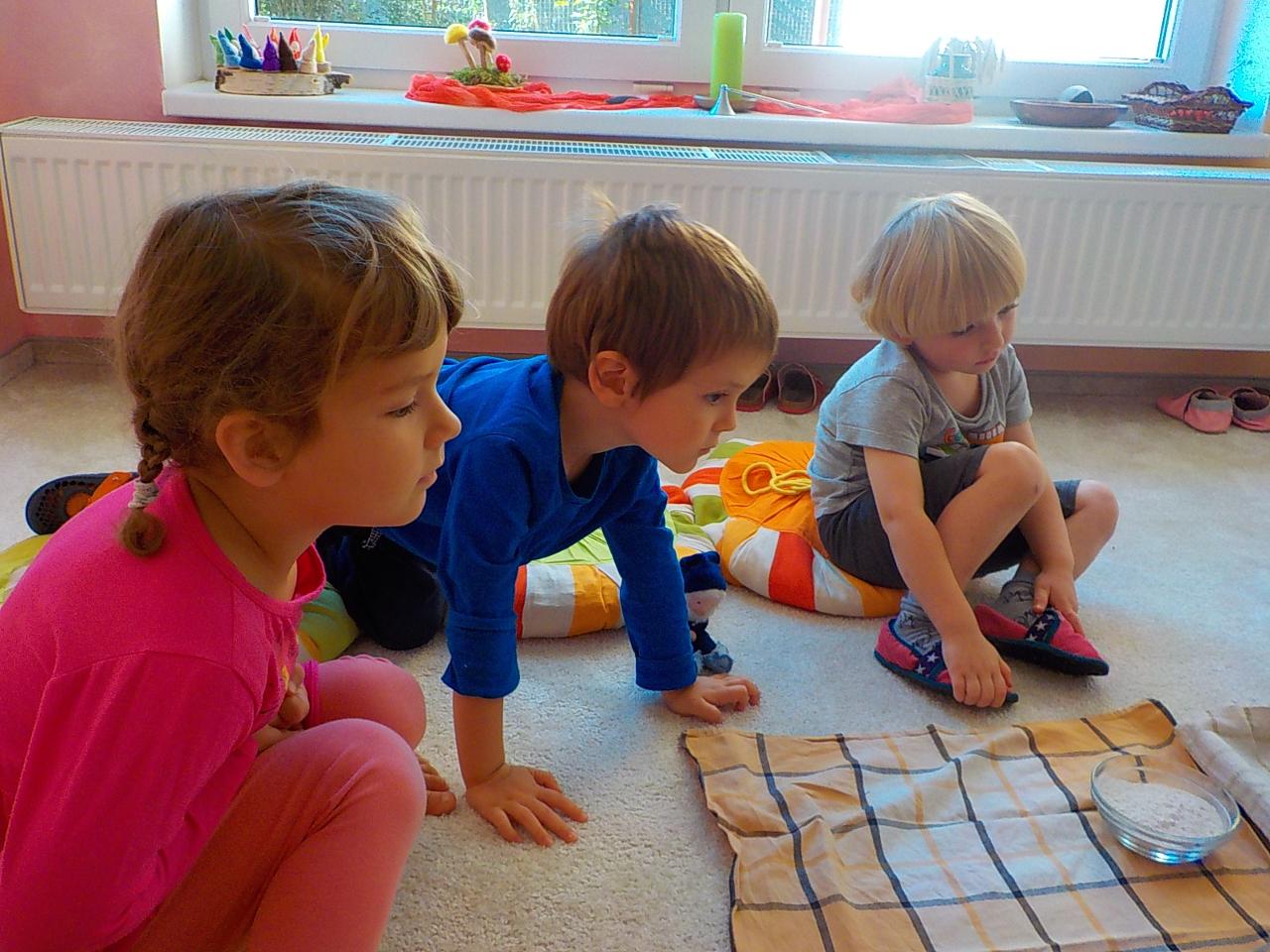 Víte-li pak, jak sedláček obilíčko seje, seče, váže, mlátí, mele a peče? My už to víme. Semínkem v zemi to začalo a semínkem v podobě rozemleté mouky a upečeného chlebíčka to končí. Každá z té dlouhé řady činností má své kouzlo. Klásky jsme vymlátili a zrnka posbírali, na mlýnku namleli a v míse promísili a výsledkem byl ve čtvrtek chutný chlebíček. To, že v chlebíčku je něco moc krásného schovaného nám ukázala Péťa se svým divadýlkem z chlebové střídy. A že to není jen tak a chce to trochu síly, jsme si mohli vyzkoušet při pátečním tvoření, kdy jsme si ze střídy vyráběli kuřátko. Vyprávěli jsme si totiž pohádku o kuřátku a obilí. Nové děti se učí napjatě poslouchat, zpívají s námi i tančí, dokáží počkat na domluvených místech. Tento týden nám sluníčko žehnalo každý den. Radostná byla i oslava Anežčiných narozenin – všichni se svíčkou v ruce mohli vyslovit pro ni přání, přidal se i skřítek s malým dárečkem. A mnohokrát děkujeme za výborný dort. Ale my všichni mravenečci jsme také dostali tento týden dárek, totiž nové hrníčky, jen naše, které si v jídelně hned poznáme. Jsou krásně průhledné, takže si to, co pijeme, i to co je za tím, můžeme dobře prohlédnout a někdy je to docela šišaté překvapení :-).