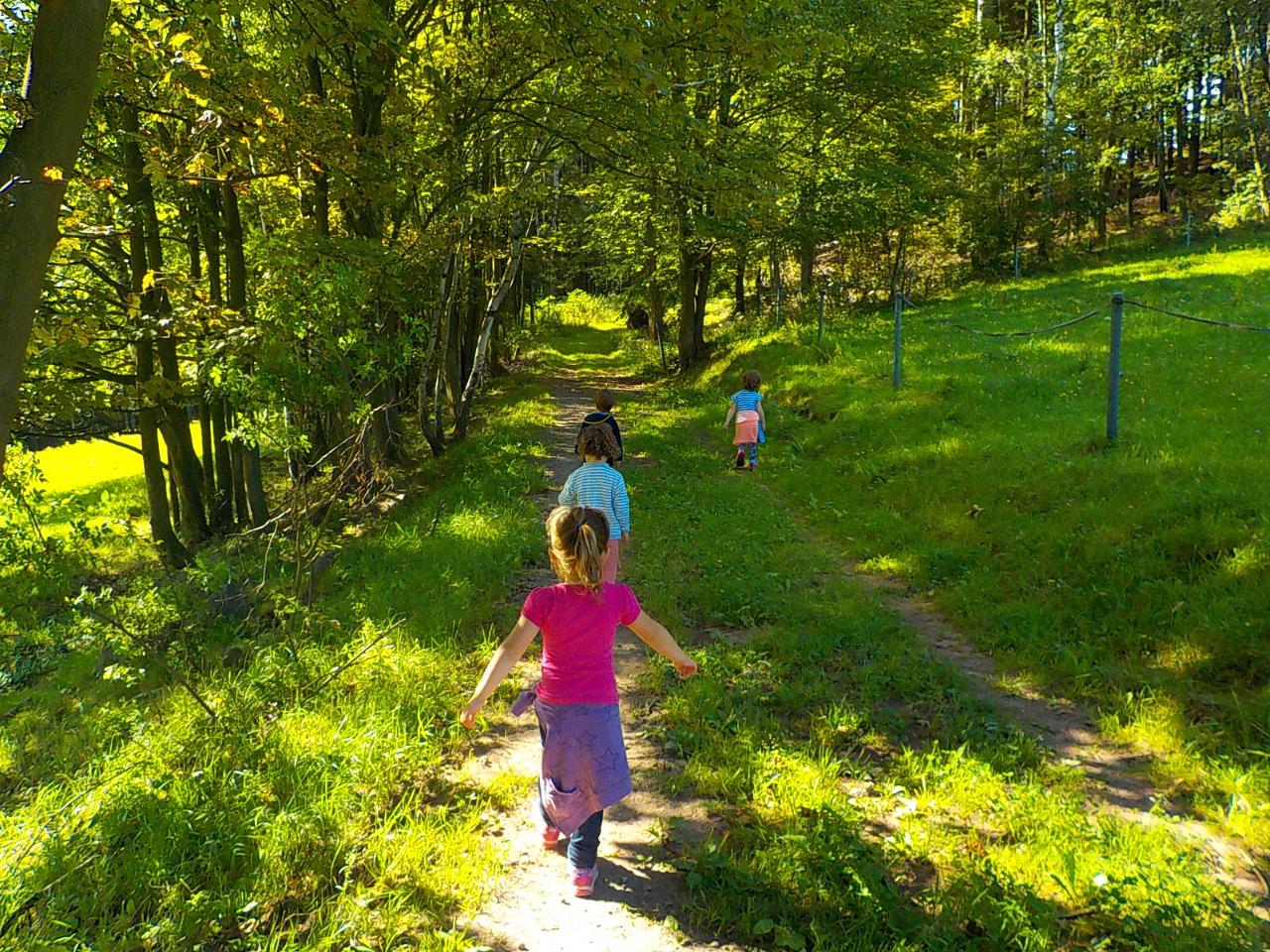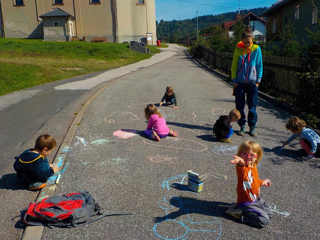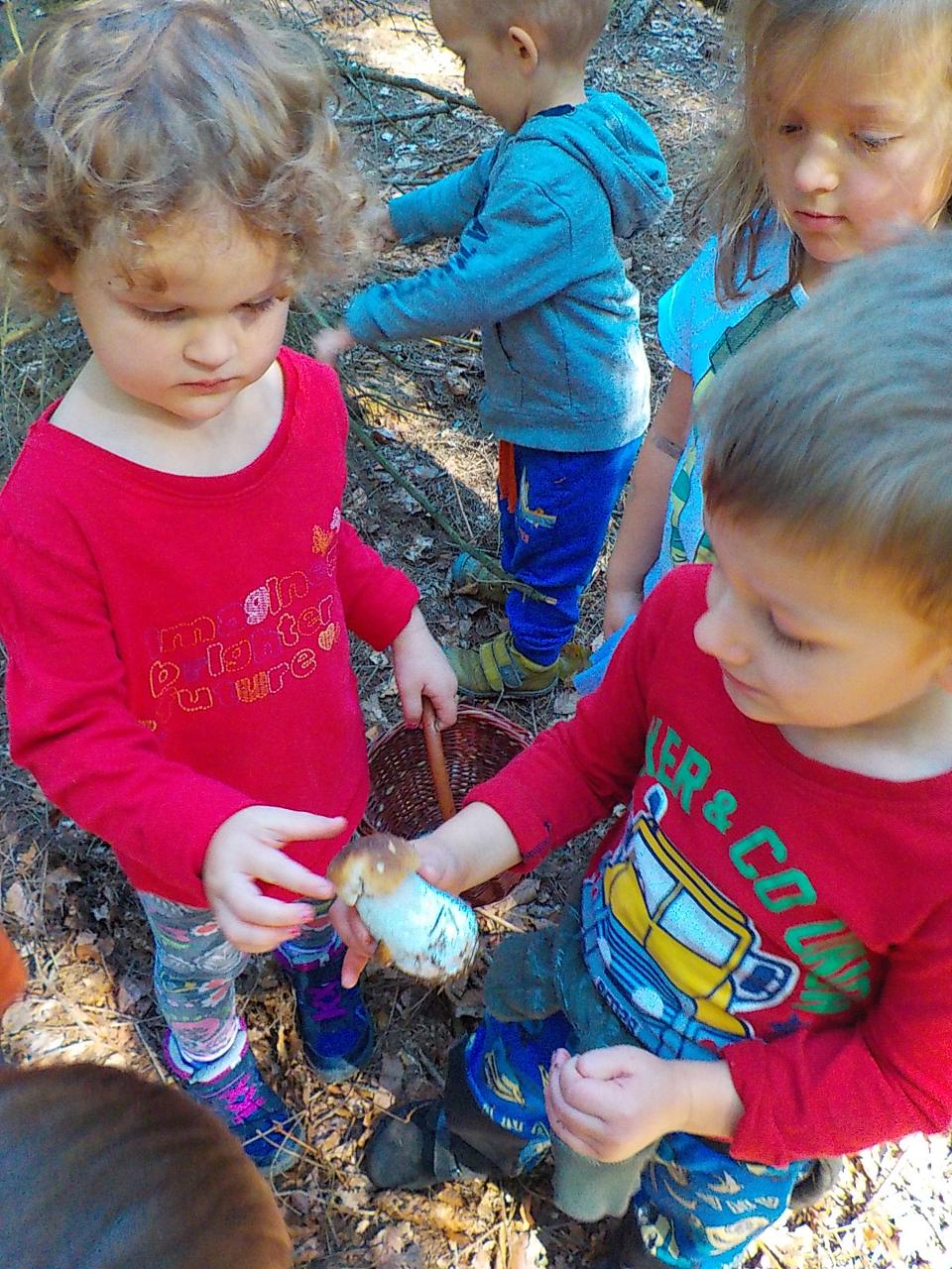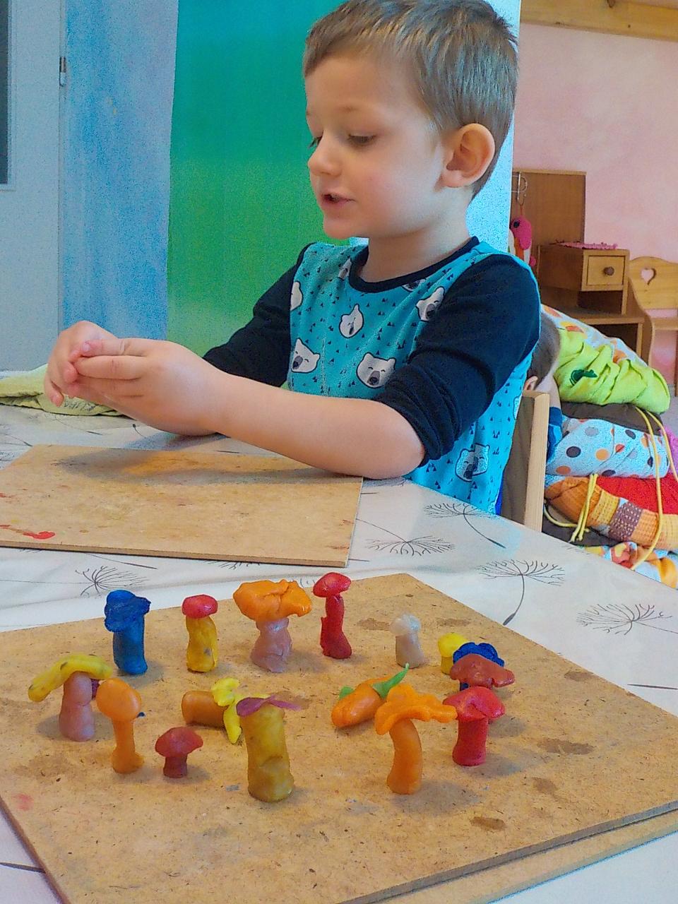 Ať uděláme krok kamkoli, všude narazíme na klobouček na nožce, celý les voní houbami a my jsme jak Kateřina v naší pohádce o uplakané muchomůrce – když už je košík plný, stejně jdeme dál a jen pozorujeme – ty červené muchomůrky jsou nejkrásnější. Tančíme jim a zpíváme houbí písničku „í í í apa apa í“… Houby se nám povedlo vymodelovat z včelího vosku, upéct z listového těsta, vystříhat a vybarvit z papíru i ušít z filcu a vyzdobit jim kloboučky plstěním ovčí vlny. A když jsme zrovna nebyli na houbách, kreslili jsme křídami na tabuli i na asfalt, trhali kytičky, běhali a učili se na sebe čekat na domluvených místech.