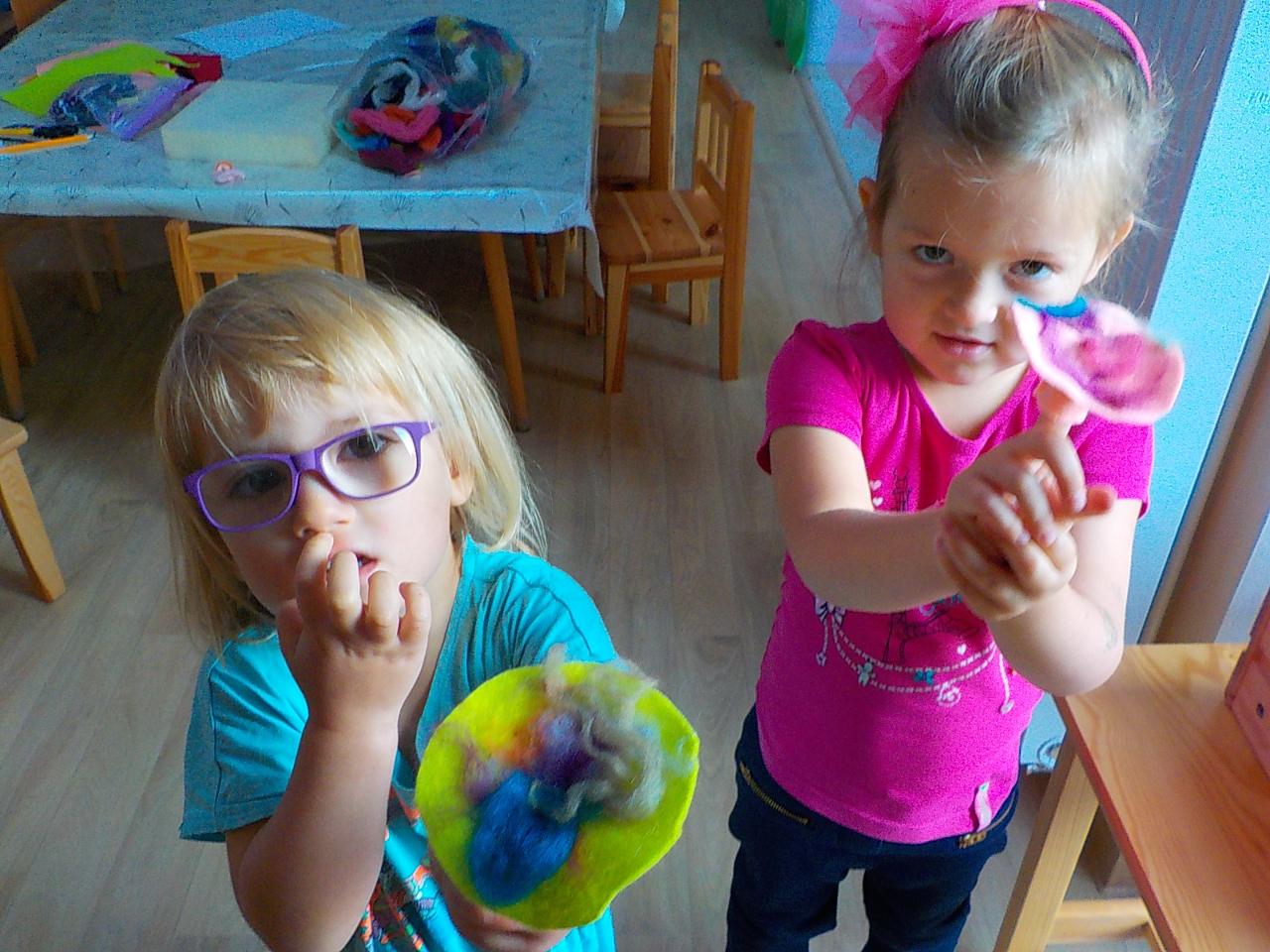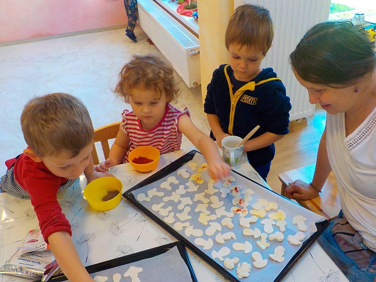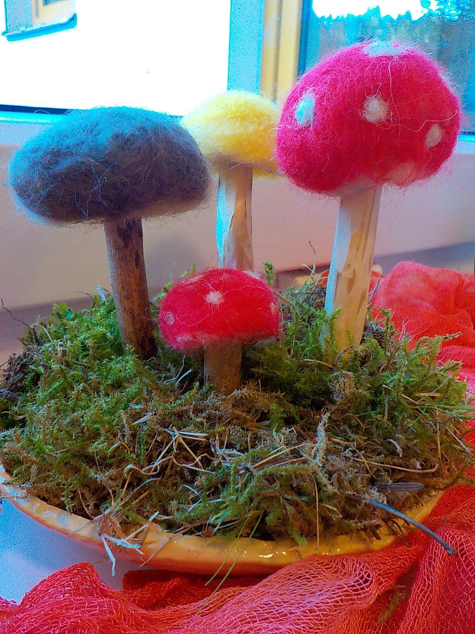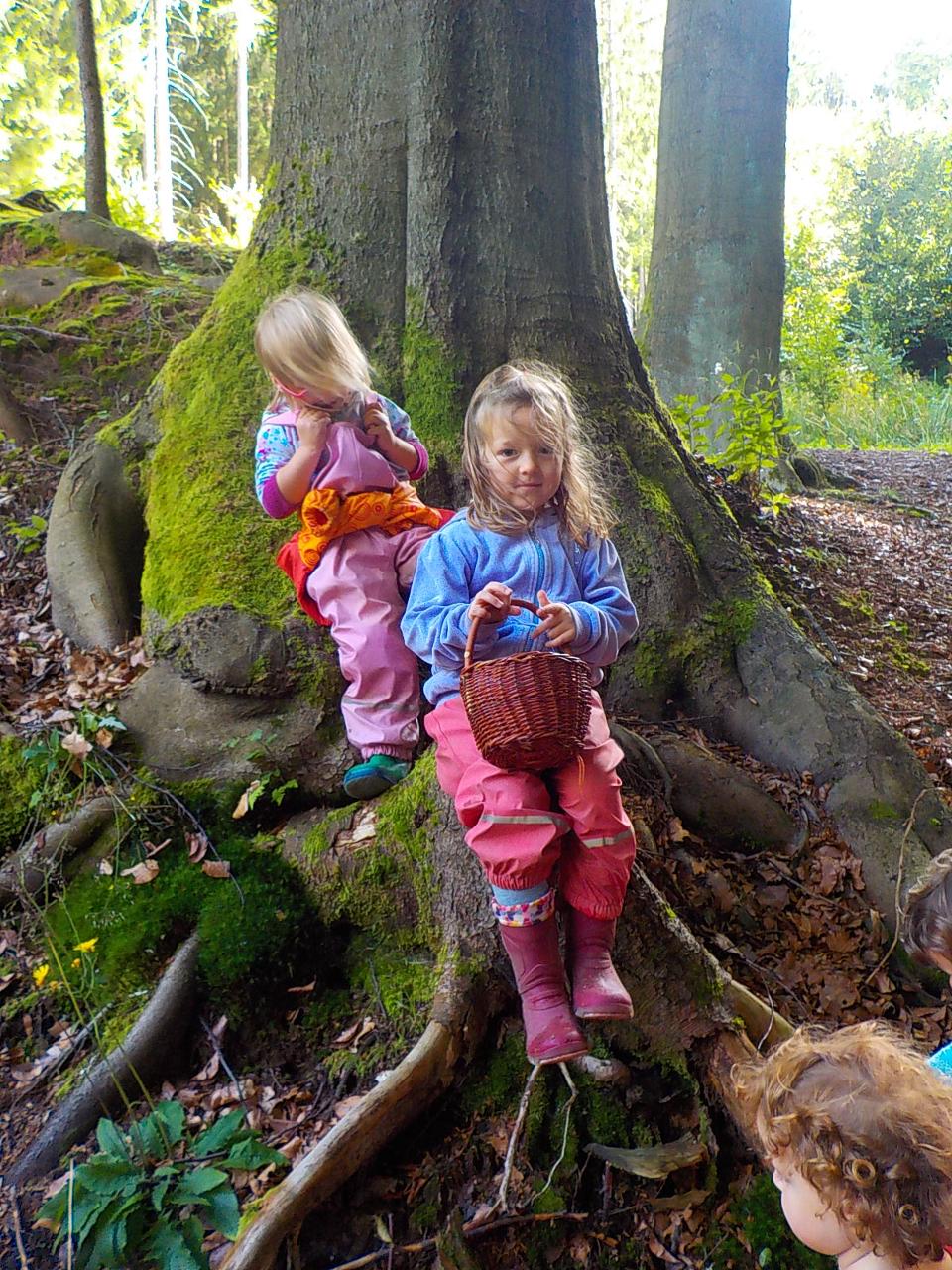 Ať uděláme krok kamkoli, všude narazíme na klobouček na nožce, celý les voní houbami a my jsme jak Kateřina v naší pohádce o uplakané muchomůrce – když už je košík plný, stejně jdeme dál a jen pozorujeme – ty červené muchomůrky jsou nejkrásnější. Tančíme jim a zpíváme houbí písničku „í í í apa apa í“… Houby se nám povedlo vymodelovat z včelího vosku, upéct z listového těsta, vystříhat a vybarvit z papíru i ušít z filcu a vyzdobit jim kloboučky plstěním ovčí vlny. A když jsme zrovna nebyli na houbách, kreslili jsme křídami na tabuli i na asfalt, trhali kytičky, běhali a učili se na sebe čekat na domluvených místech.