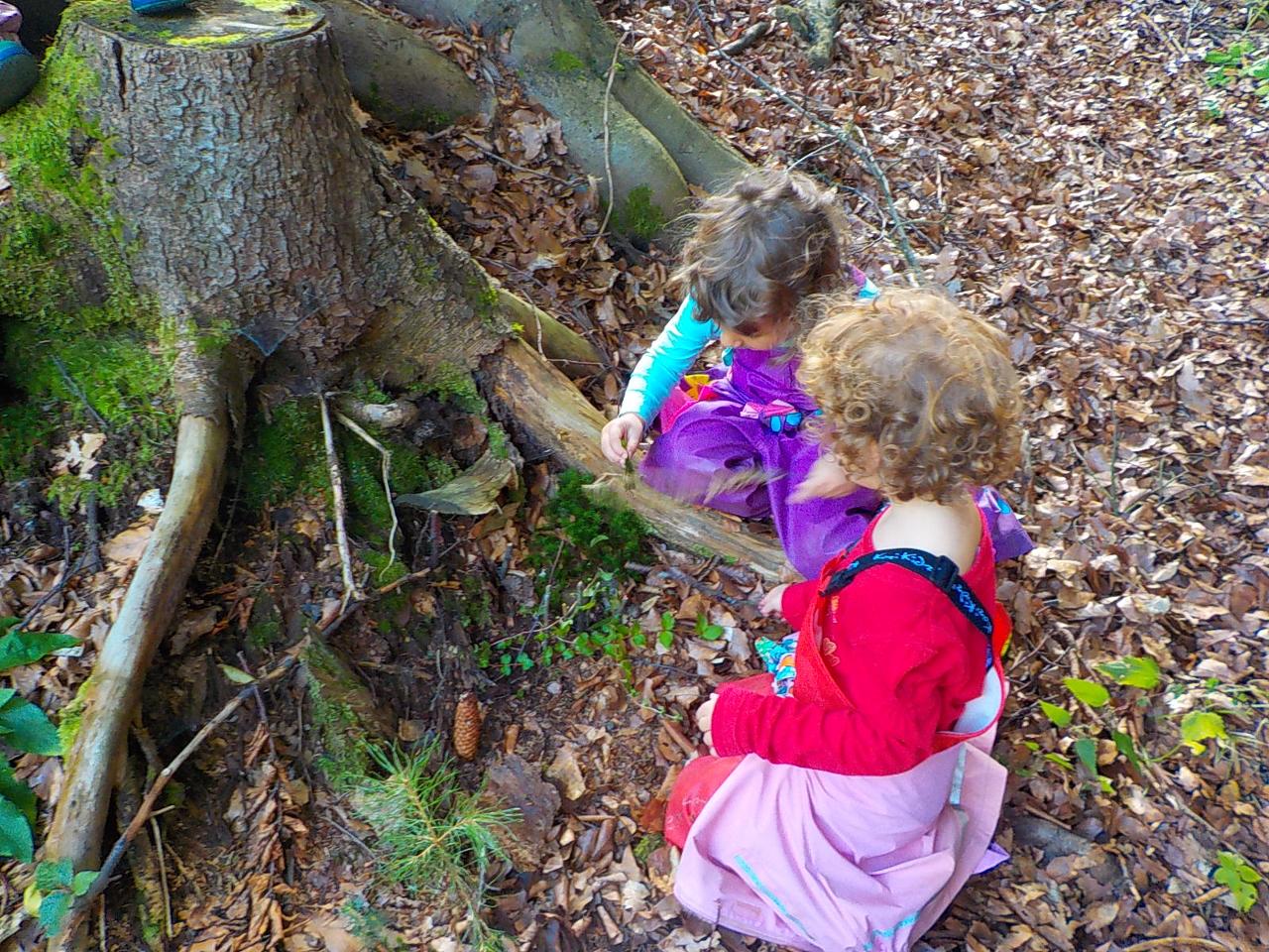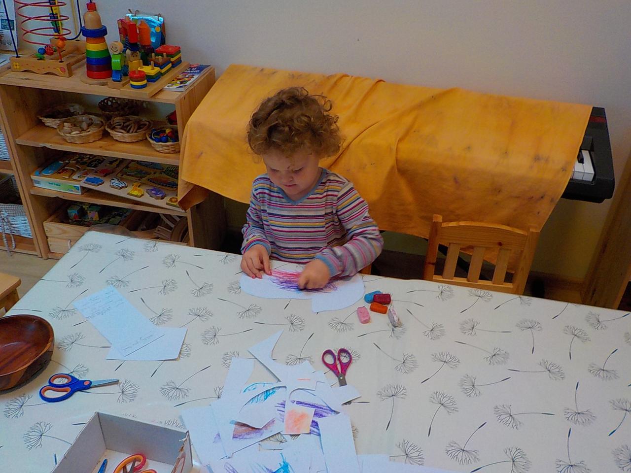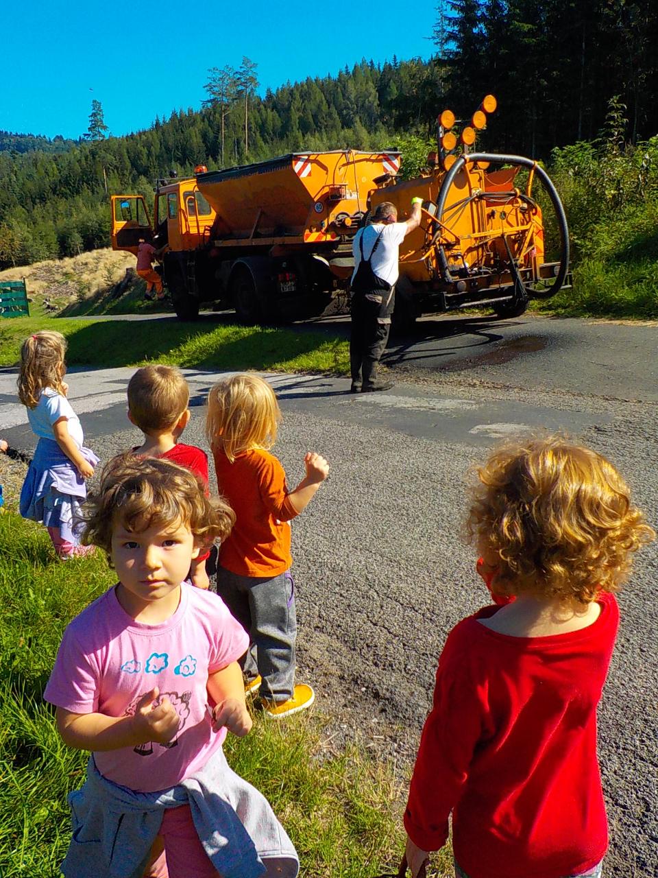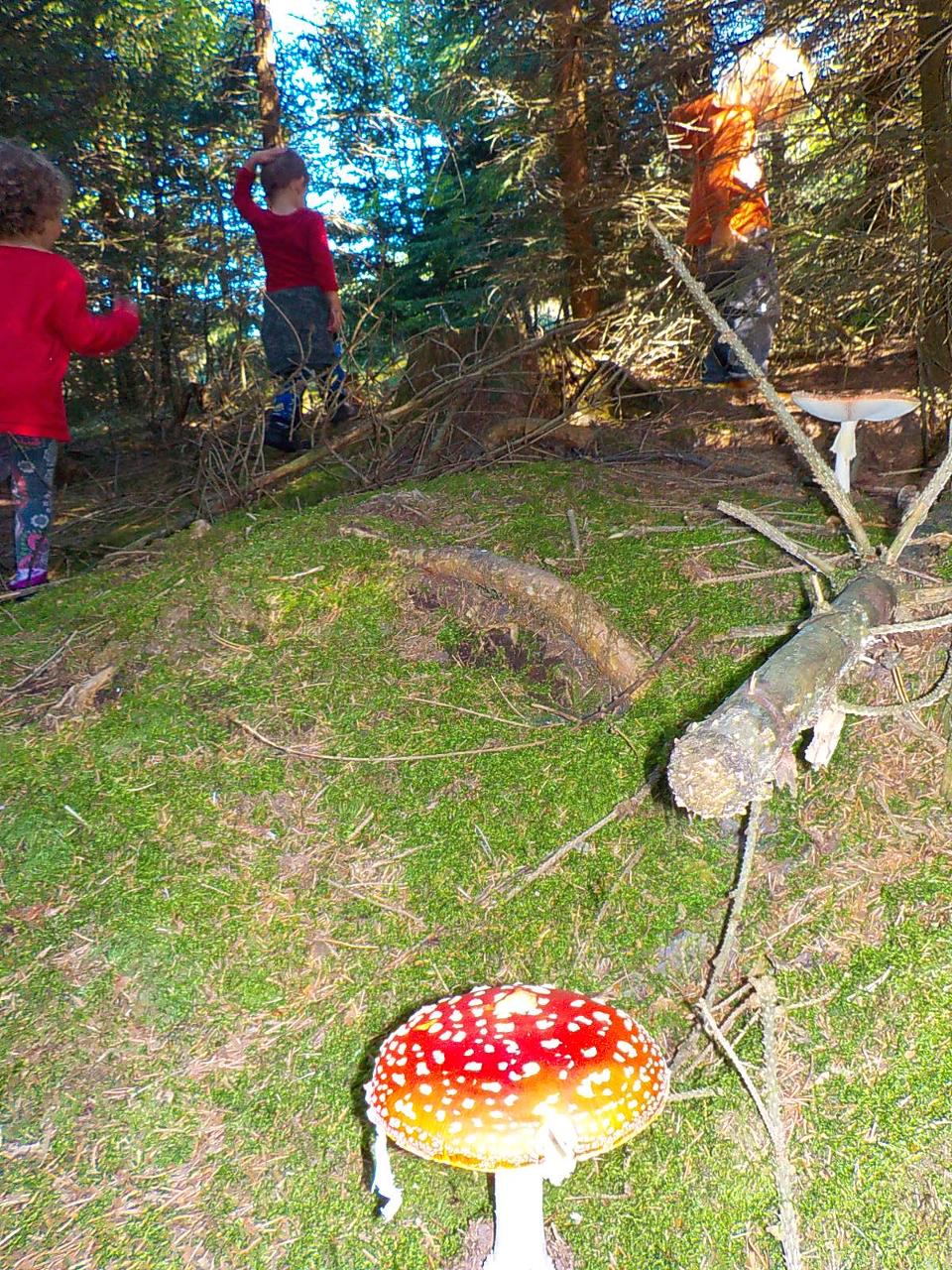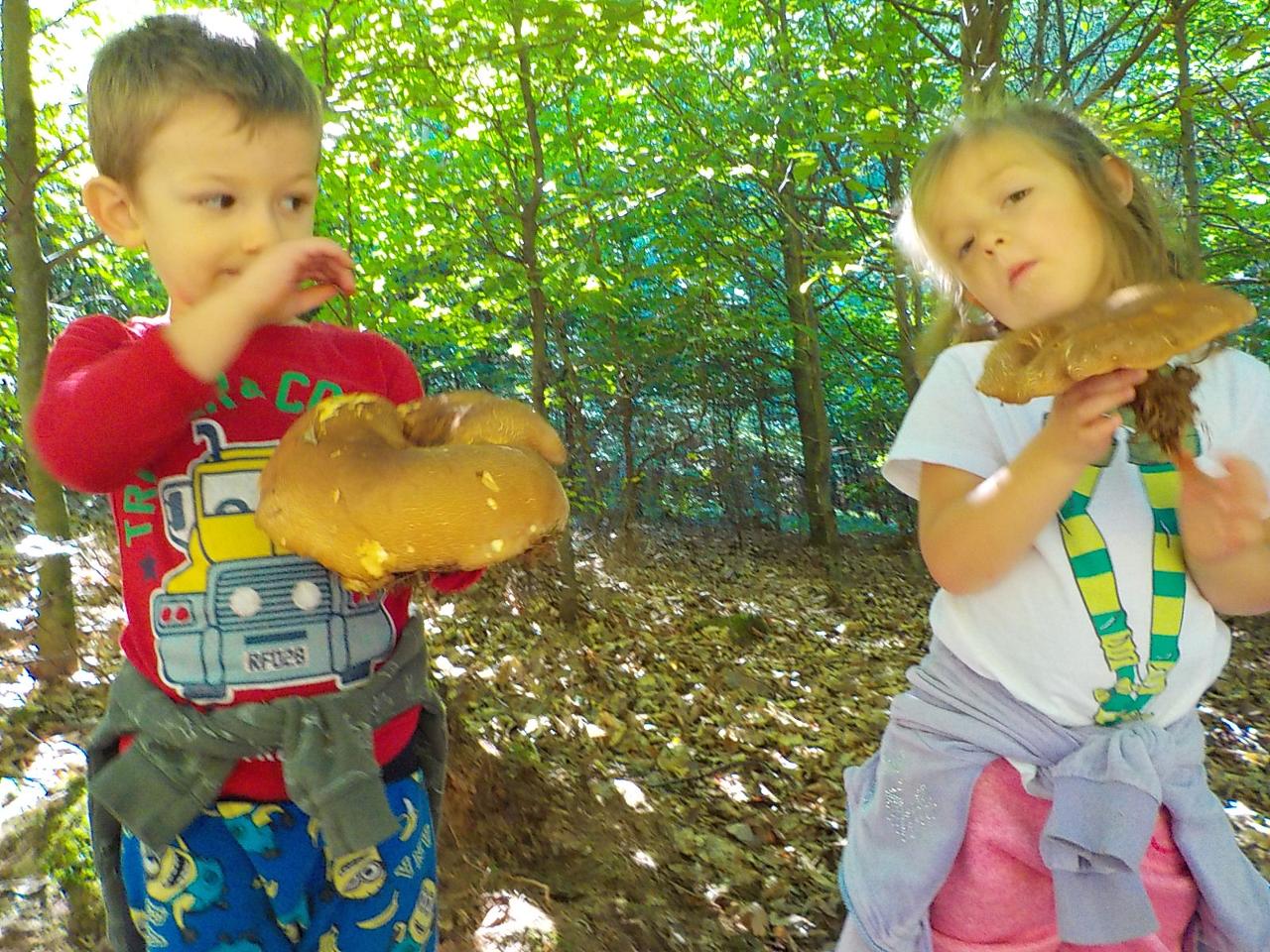 Ať uděláme krok kamkoli, všude narazíme na klobouček na nožce, celý les voní houbami a my jsme jak Kateřina v naší pohádce o uplakané muchomůrce – když už je košík plný, stejně jdeme dál a jen pozorujeme – ty červené muchomůrky jsou nejkrásnější. Tančíme jim a zpíváme houbí písničku „í í í apa apa í“… Houby se nám povedlo vymodelovat z včelího vosku, upéct z listového těsta, vystříhat a vybarvit z papíru i ušít z filcu a vyzdobit jim kloboučky plstěním ovčí vlny. A když jsme zrovna nebyli na houbách, kreslili jsme křídami na tabuli i na asfalt, trhali kytičky, běhali a učili se na sebe čekat na domluvených místech.
