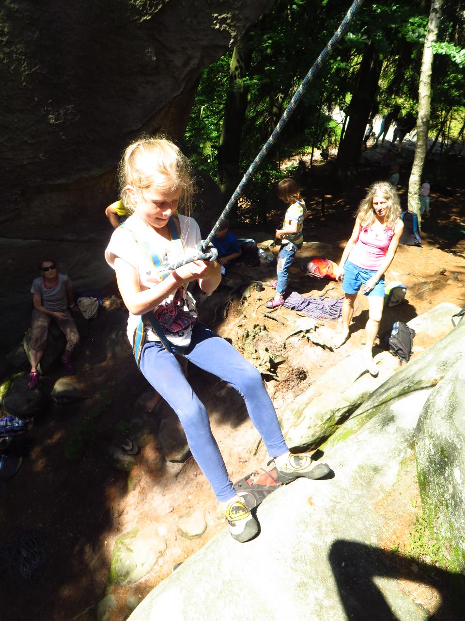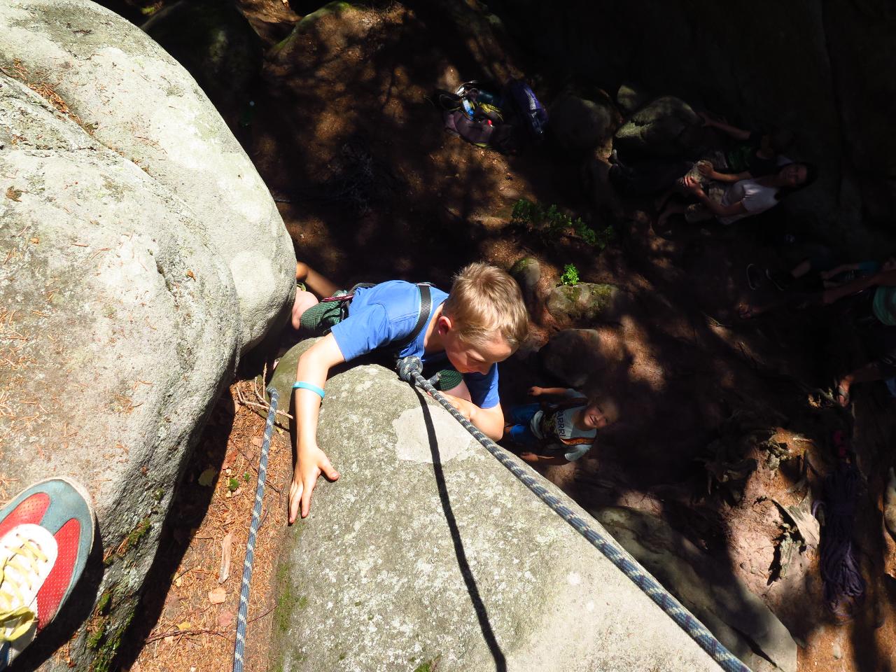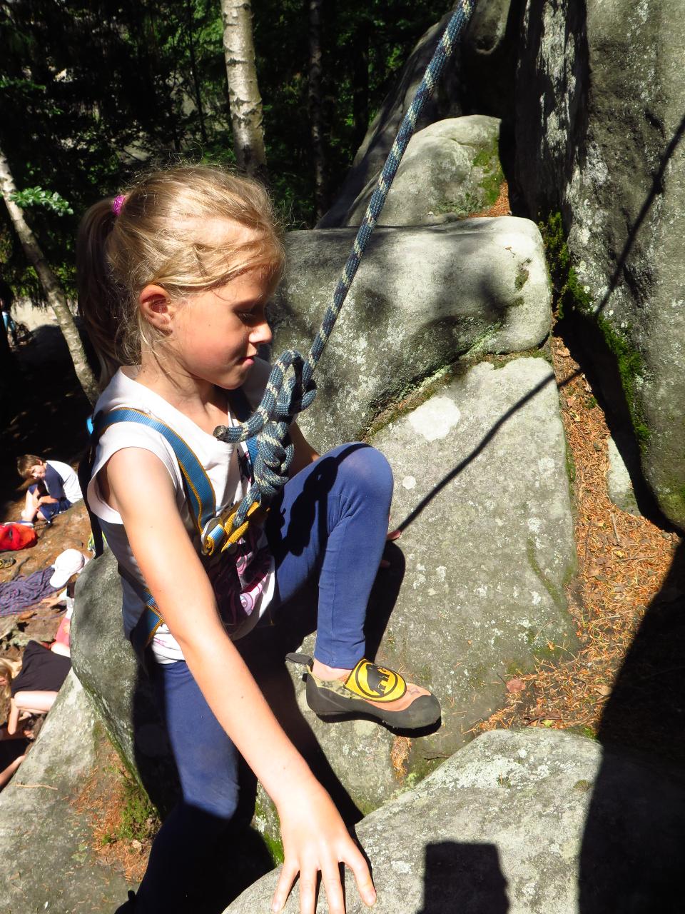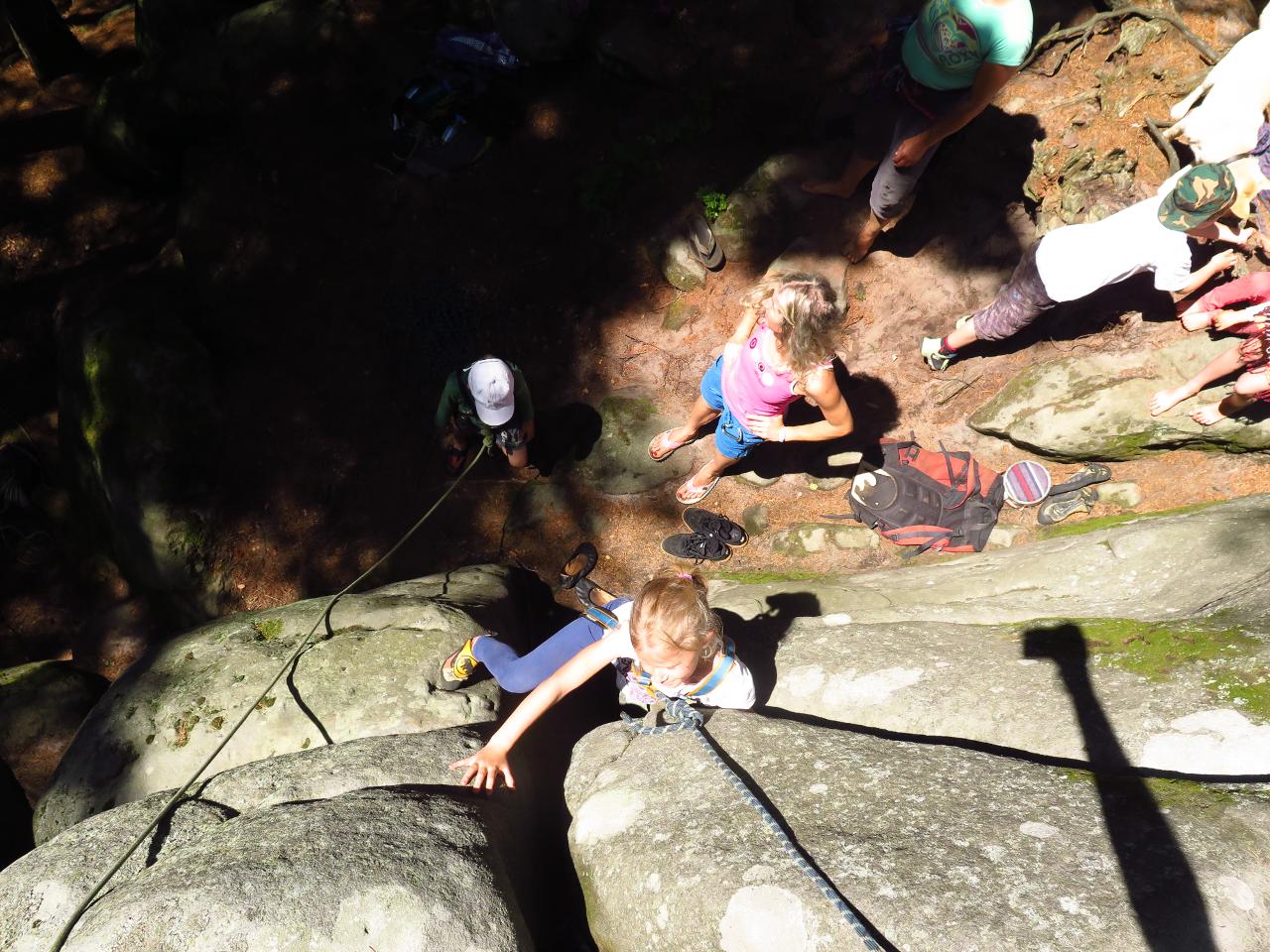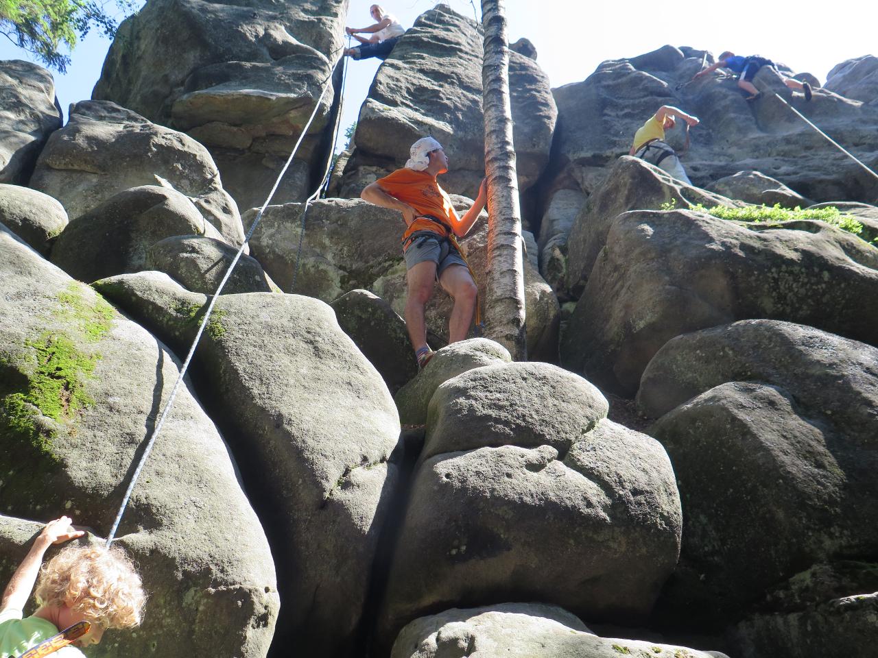 V polovině června jsme nejprve věnovali první polovinu týdně matematice, češtině či přípravě zahradní slavnosti a tvoření malováním kulis nebo kamenů. Evča, Zdenda a Míša Š. také navštívili ZŠ Hučák, moderní a inovativní školu v Hradci Králové, kde hledali inspiraci i pro naší školu. V druhé části týdne se Mravenčí škola vypravila na dvoudenní výpravu do skal, kde si školáci díky rodičům lezcům vyzkoušeli, jaké je to překonat se, najít si správné “chyty” a vylézt na pískovcovou věž. Po deštivém čtvrtku jsme zažili noc ve stanech a slunečný lezecký pátek. Každý si našel svou výzvu, pro někoho to byla první noc ve stanu, první vícedenní výlet se školou či první navléknutí sedáku, pro jiné to bylo zdolání všech nabízených lezeckých cest - a třeba rovnou dvakrát :-)
