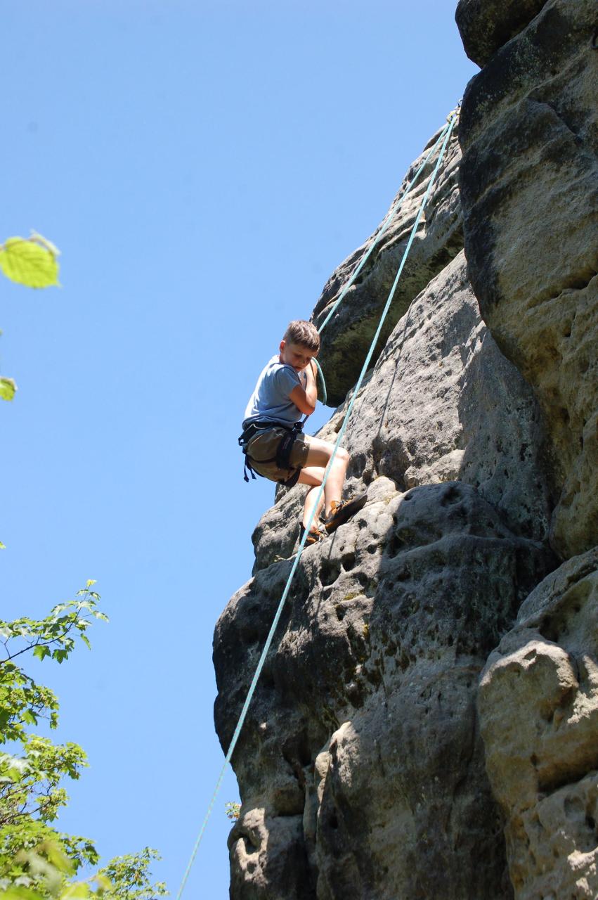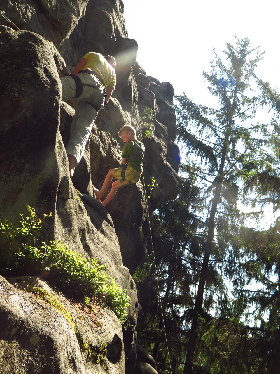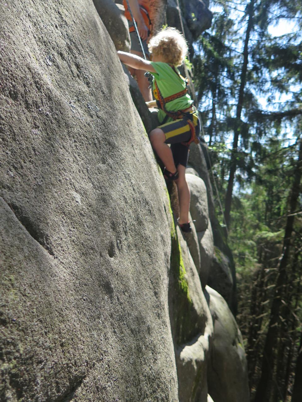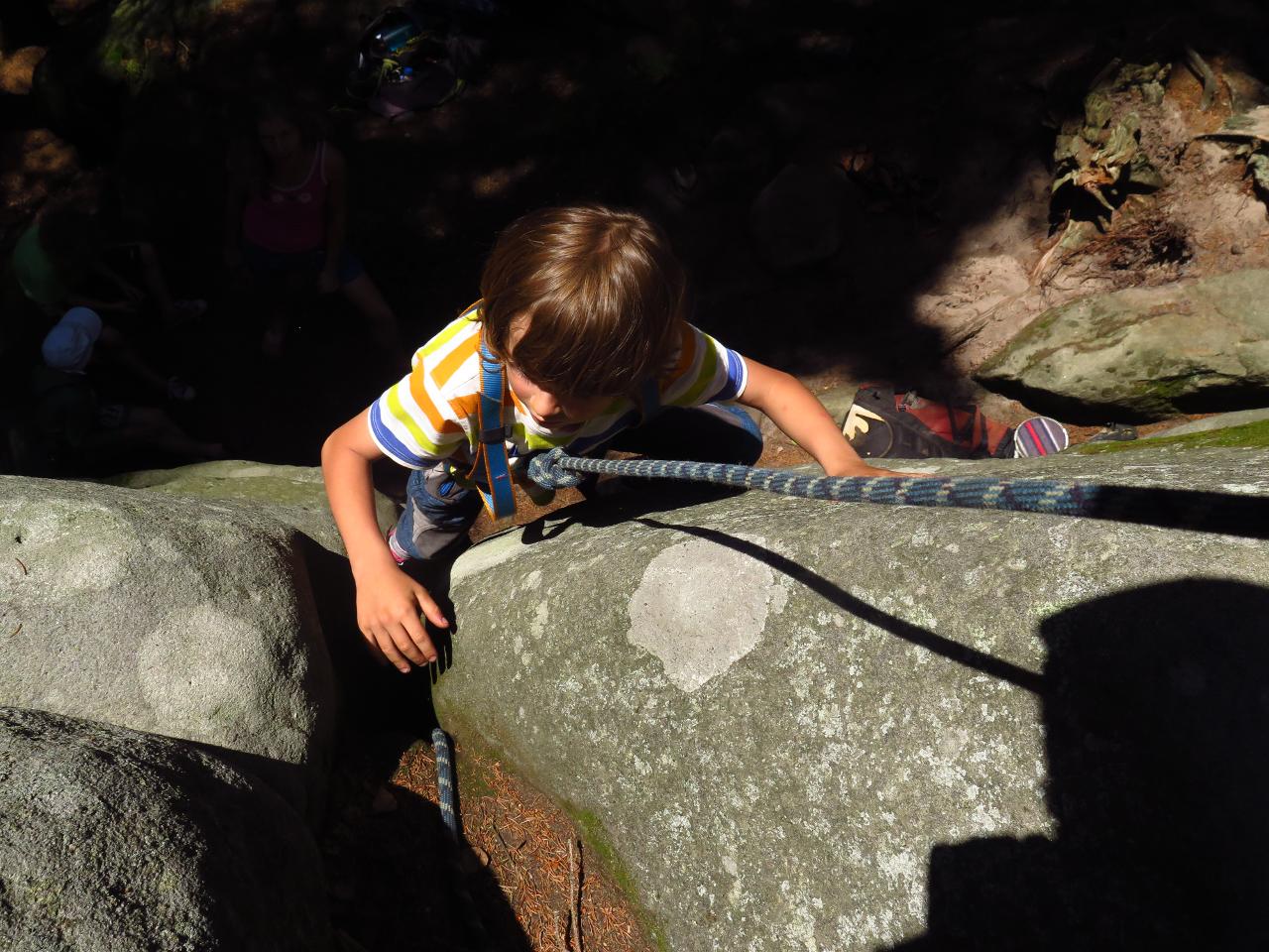 V polovině června jsme nejprve věnovali první polovinu týdně matematice, češtině či přípravě zahradní slavnosti a tvoření malováním kulis nebo kamenů. Evča, Zdenda a Míša Š. také navštívili ZŠ Hučák, moderní a inovativní školu v Hradci Králové, kde hledali inspiraci i pro naší školu. V druhé části týdne se Mravenčí škola vypravila na dvoudenní výpravu do skal, kde si školáci díky rodičům lezcům vyzkoušeli, jaké je to překonat se, najít si správné “chyty” a vylézt na pískovcovou věž. Po deštivém čtvrtku jsme zažili noc ve stanech a slunečný lezecký pátek. Každý si našel svou výzvu, pro někoho to byla první noc ve stanu, první vícedenní výlet se školou či první navléknutí sedáku, pro jiné to bylo zdolání všech nabízených lezeckých cest - a třeba rovnou dvakrát :-)