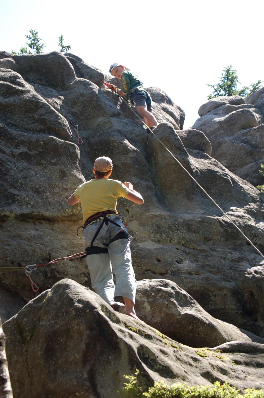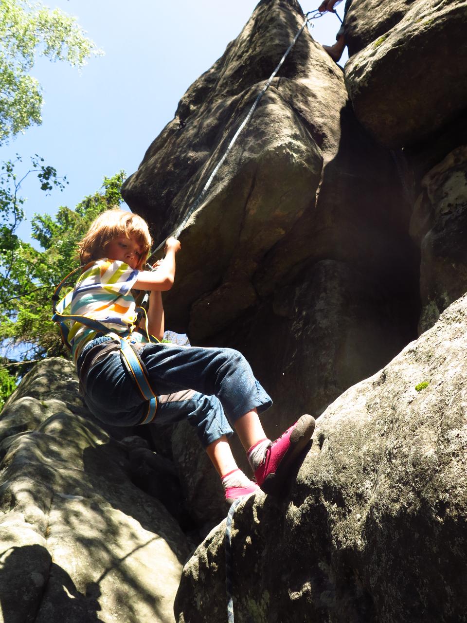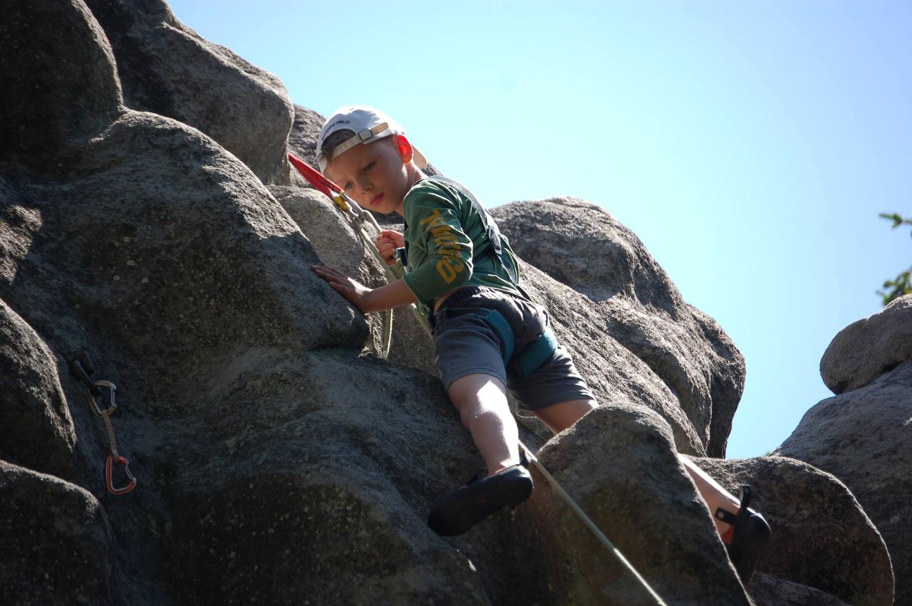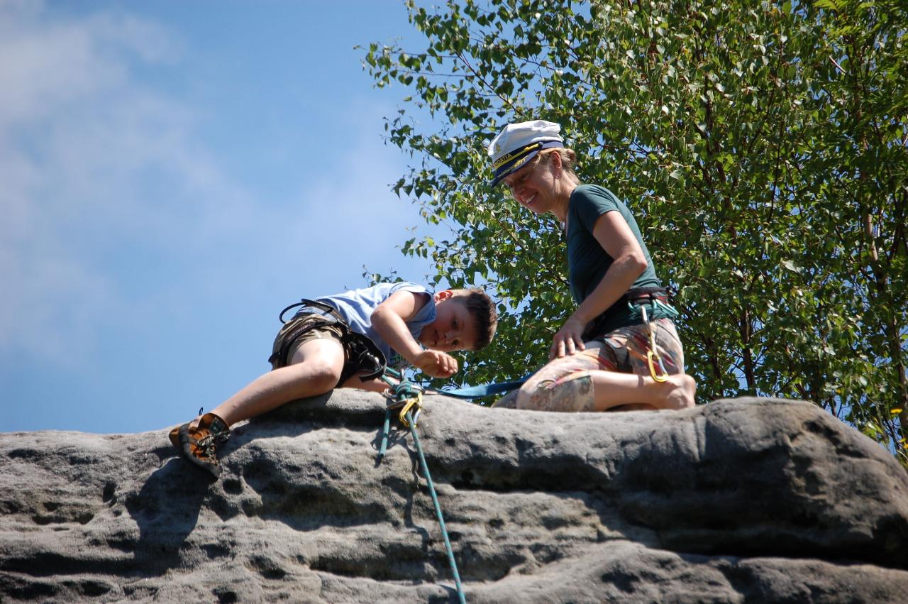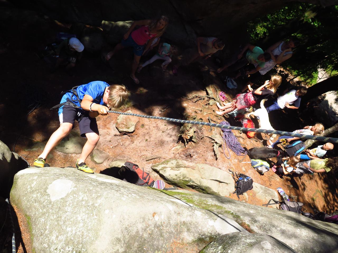 V polovině června jsme nejprve věnovali první polovinu týdně matematice, češtině či přípravě zahradní slavnosti a tvoření malováním kulis nebo kamenů. Evča, Zdenda a Míša Š. také navštívili ZŠ Hučák, moderní a inovativní školu v Hradci Králové, kde hledali inspiraci i pro naší školu. V druhé části týdne se Mravenčí škola vypravila na dvoudenní výpravu do skal, kde si školáci díky rodičům lezcům vyzkoušeli, jaké je to překonat se, najít si správné “chyty” a vylézt na pískovcovou věž. Po deštivém čtvrtku jsme zažili noc ve stanech a slunečný lezecký pátek. Každý si našel svou výzvu, pro někoho to byla první noc ve stanu, první vícedenní výlet se školou či první navléknutí sedáku, pro jiné to bylo zdolání všech nabízených lezeckých cest - a třeba rovnou dvakrát :-)