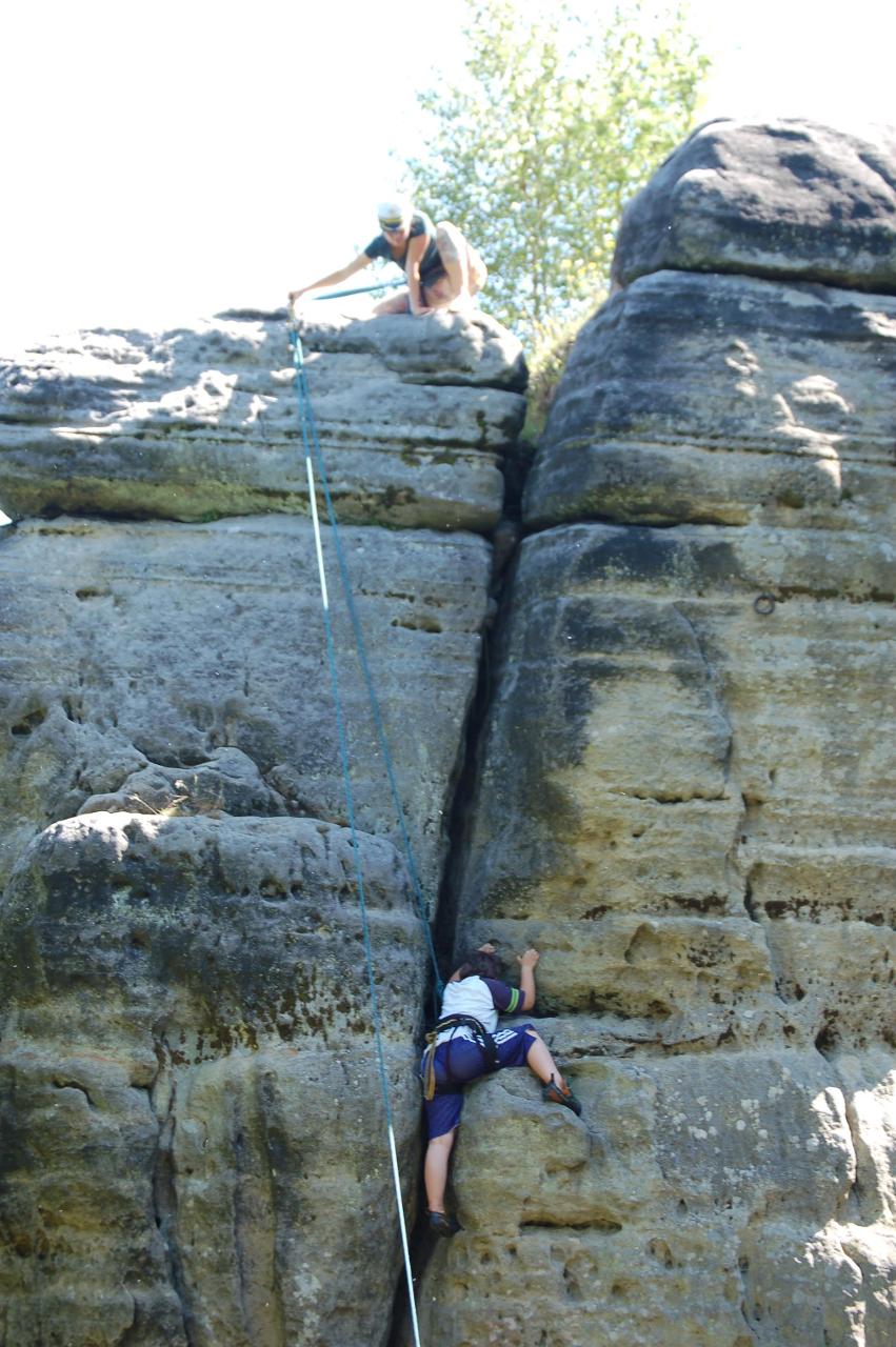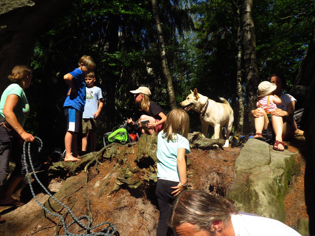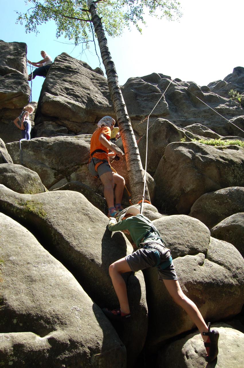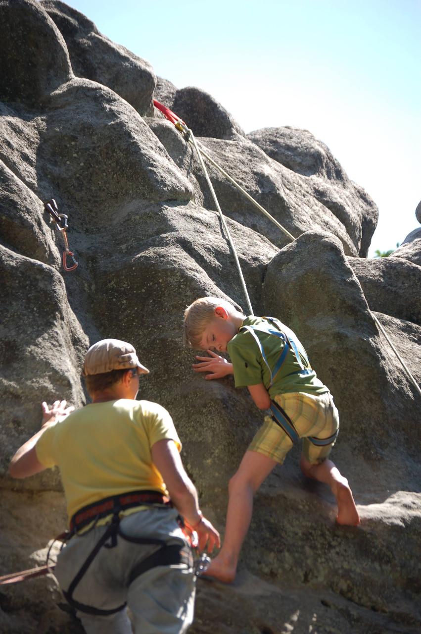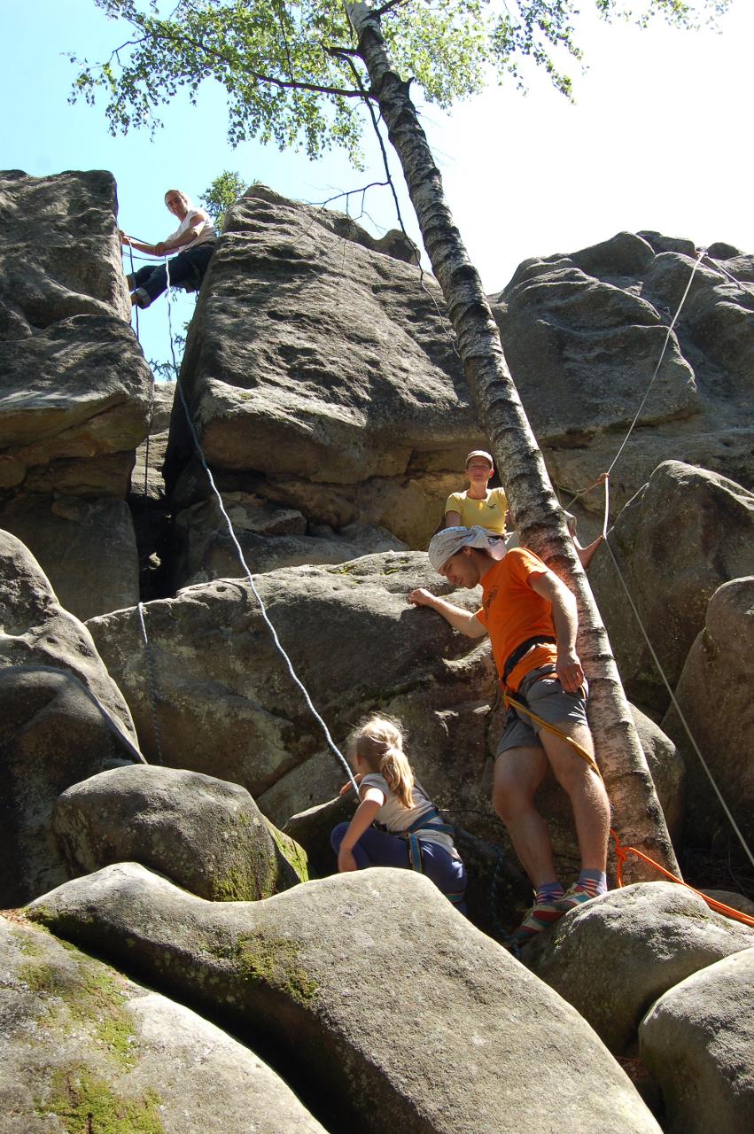 V polovině června jsme nejprve věnovali první polovinu týdně matematice, češtině či přípravě zahradní slavnosti a tvoření malováním kulis nebo kamenů. Evča, Zdenda a Míša Š. také navštívili ZŠ Hučák, moderní a inovativní školu v Hradci Králové, kde hledali inspiraci i pro naší školu. V druhé části týdne se Mravenčí škola vypravila na dvoudenní výpravu do skal, kde si školáci díky rodičům lezcům vyzkoušeli, jaké je to překonat se, najít si správné “chyty” a vylézt na pískovcovou věž. Po deštivém čtvrtku jsme zažili noc ve stanech a slunečný lezecký pátek. Každý si našel svou výzvu, pro někoho to byla první noc ve stanu, první vícedenní výlet se školou či první navléknutí sedáku, pro jiné to bylo zdolání všech nabízených lezeckých cest - a třeba rovnou dvakrát :-)